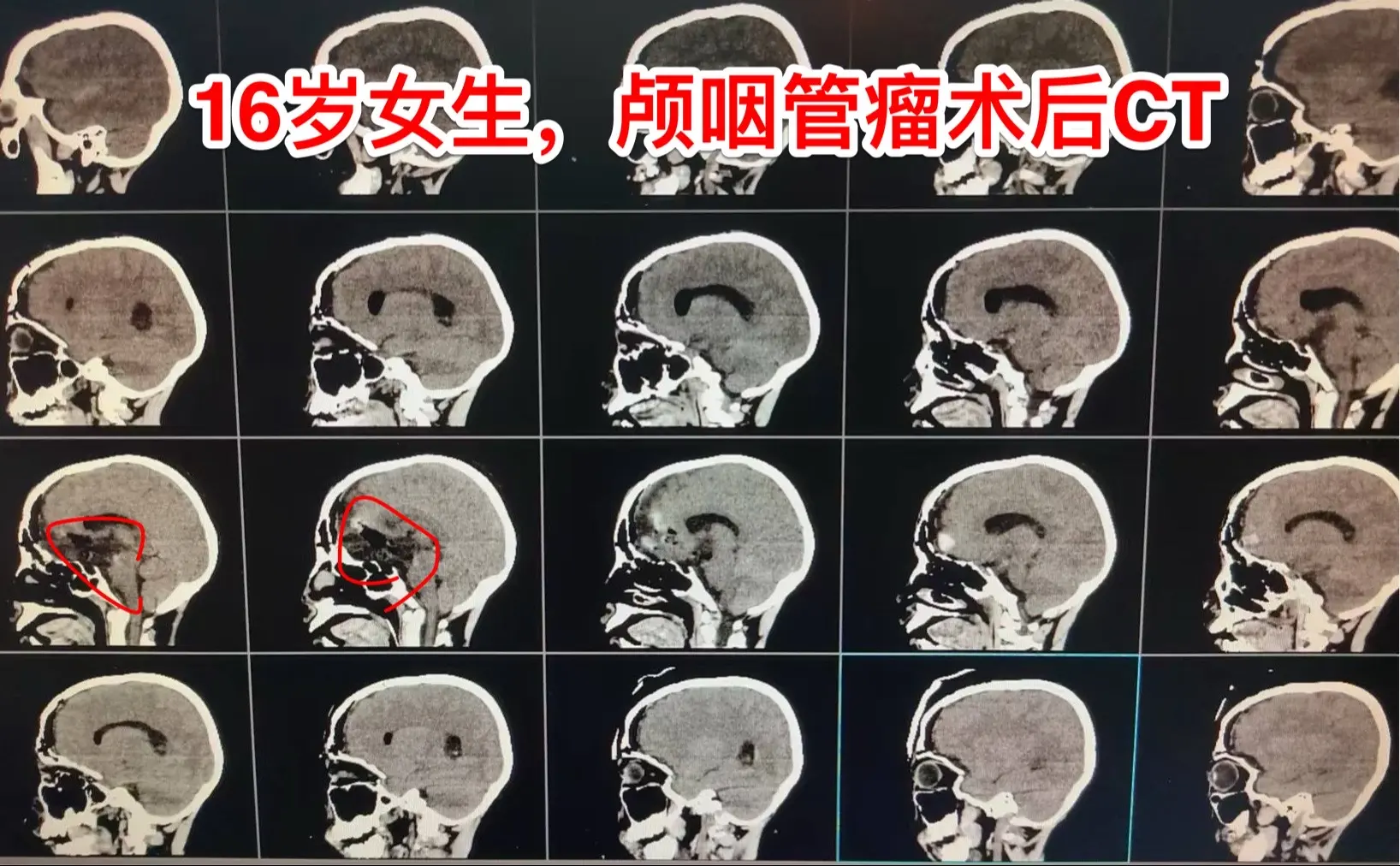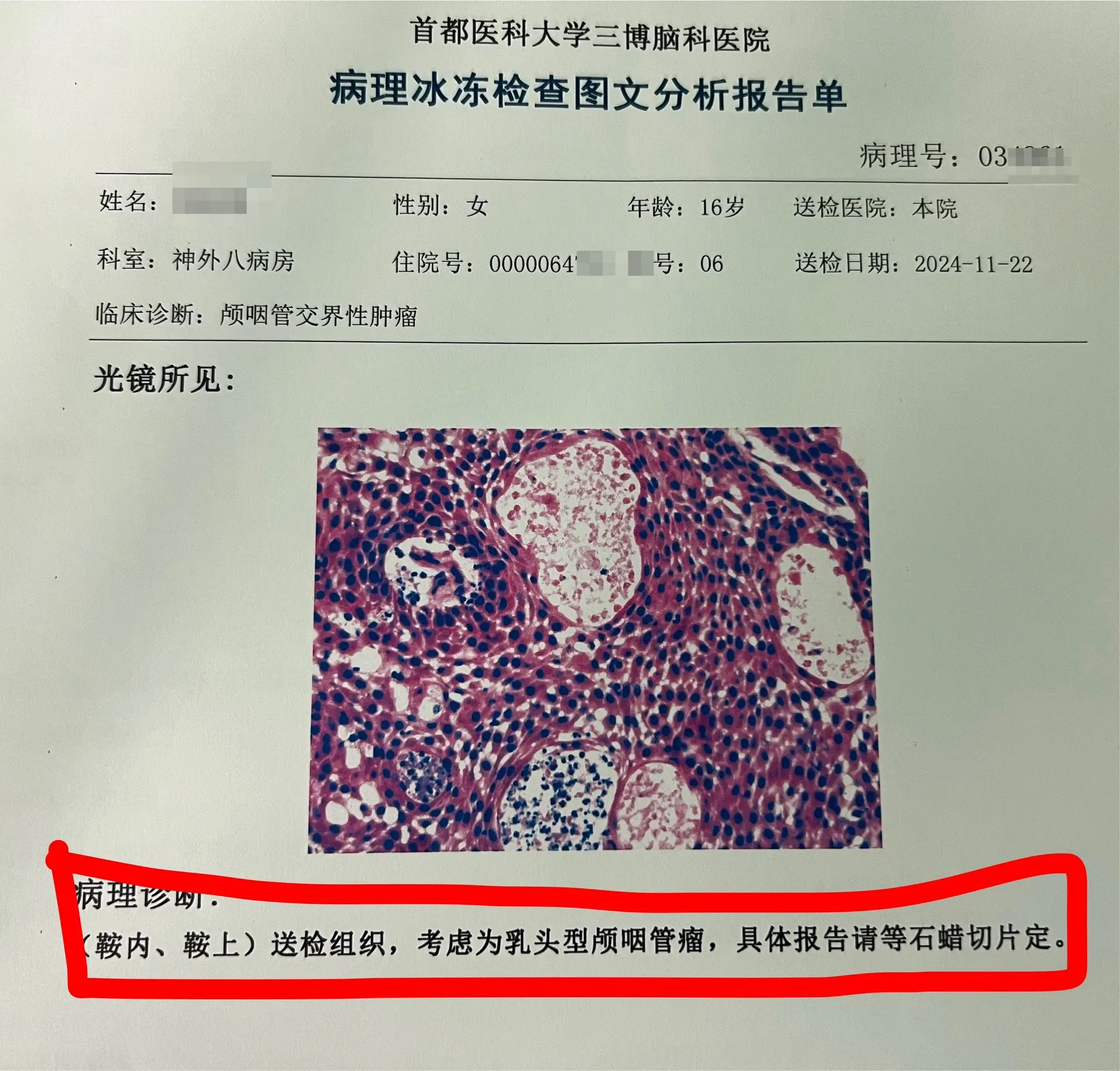 昨天在手术过程中,取出病变标本作快速冰冻病理检查,报告为乳头型颅咽管瘤。这种类型的颅咽管瘤在小孩子中十分罕见。