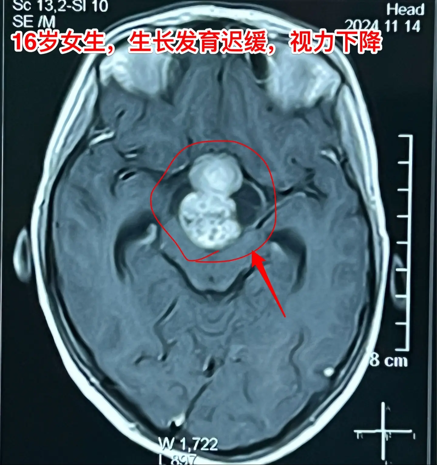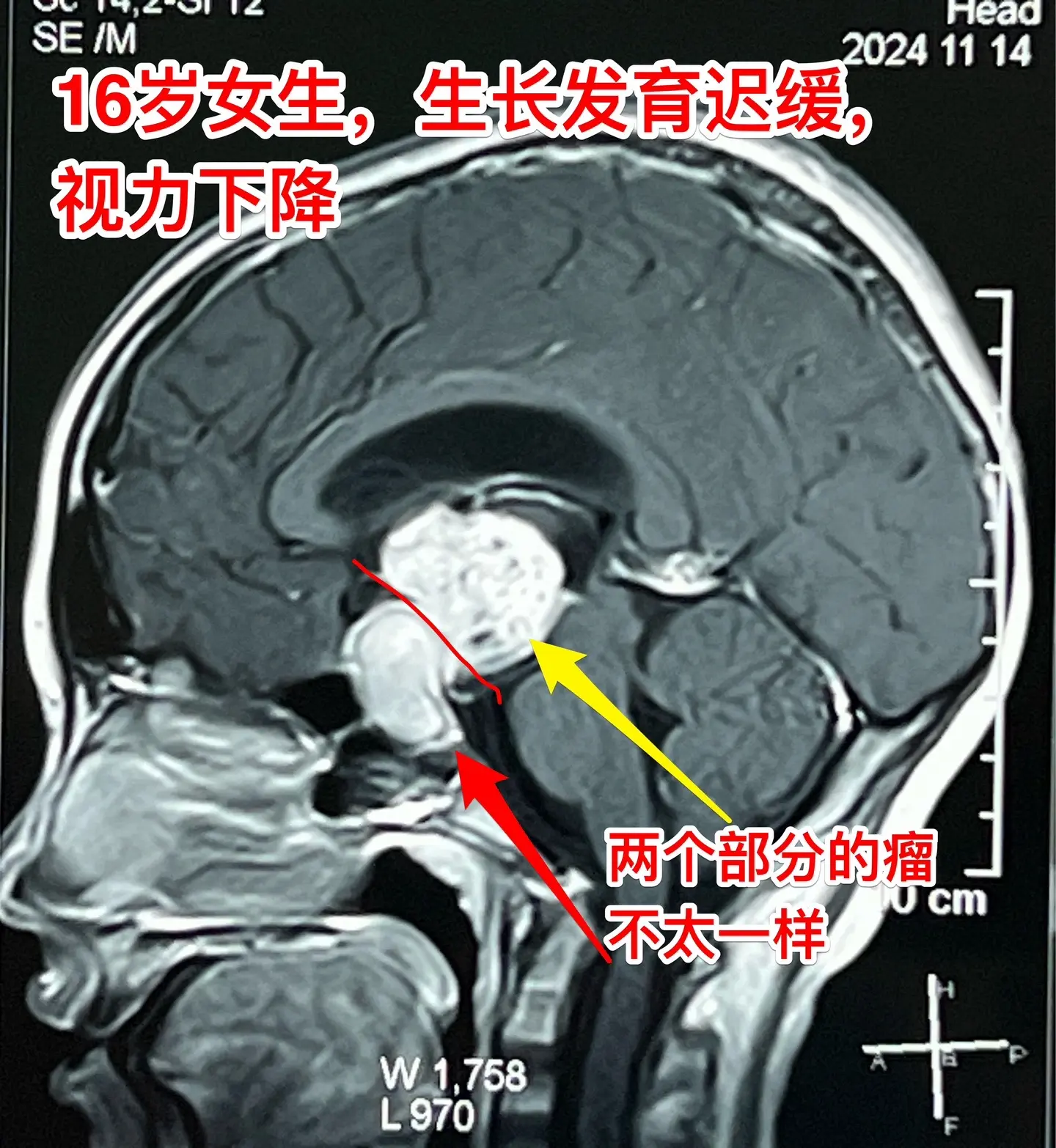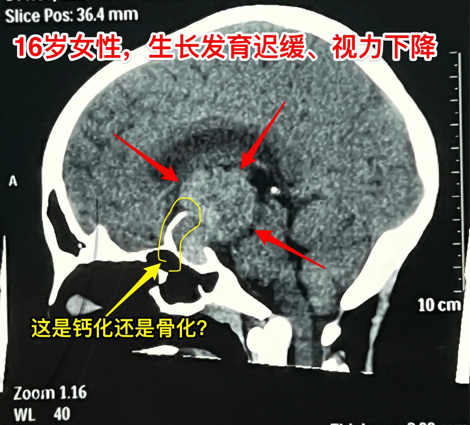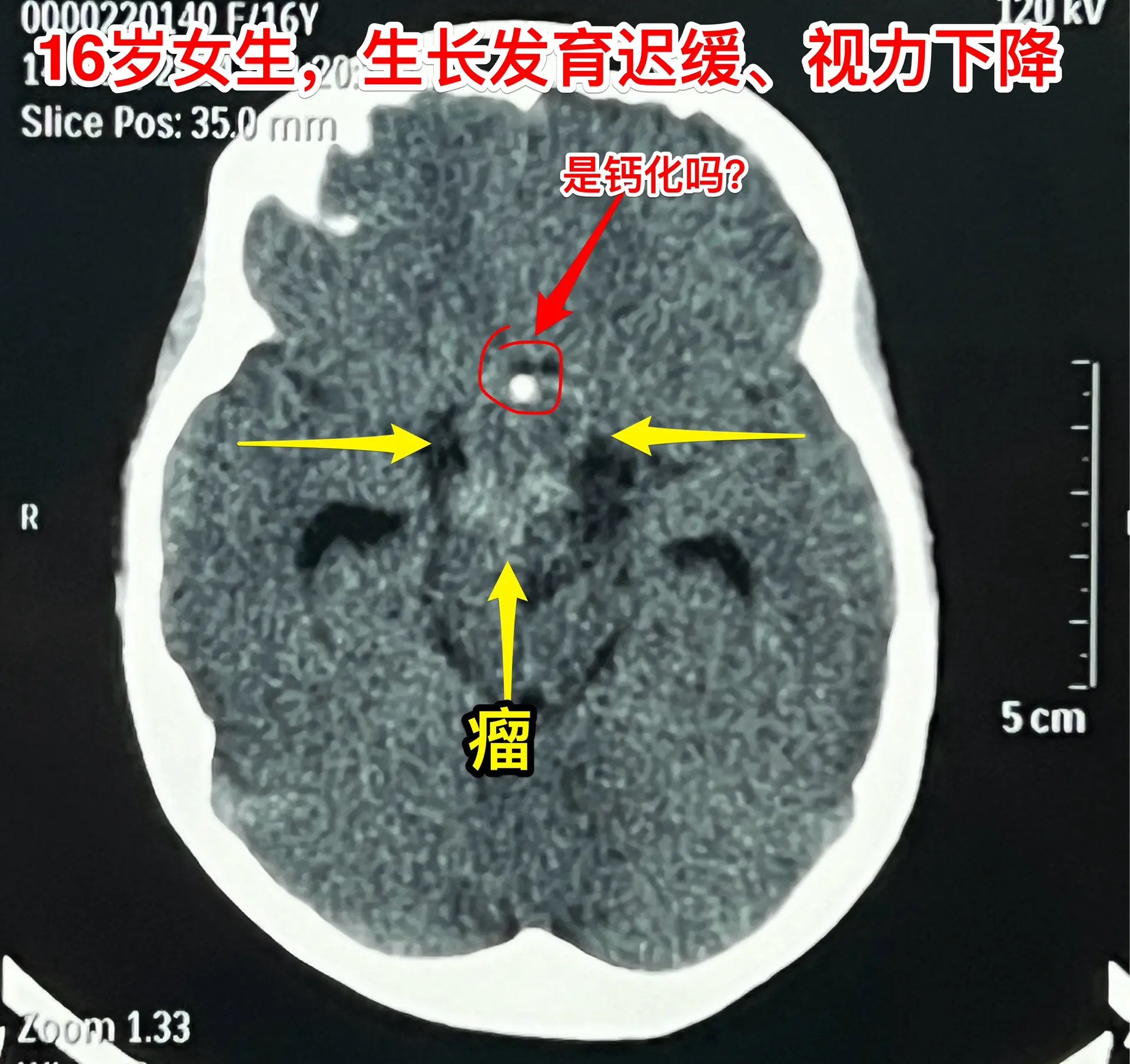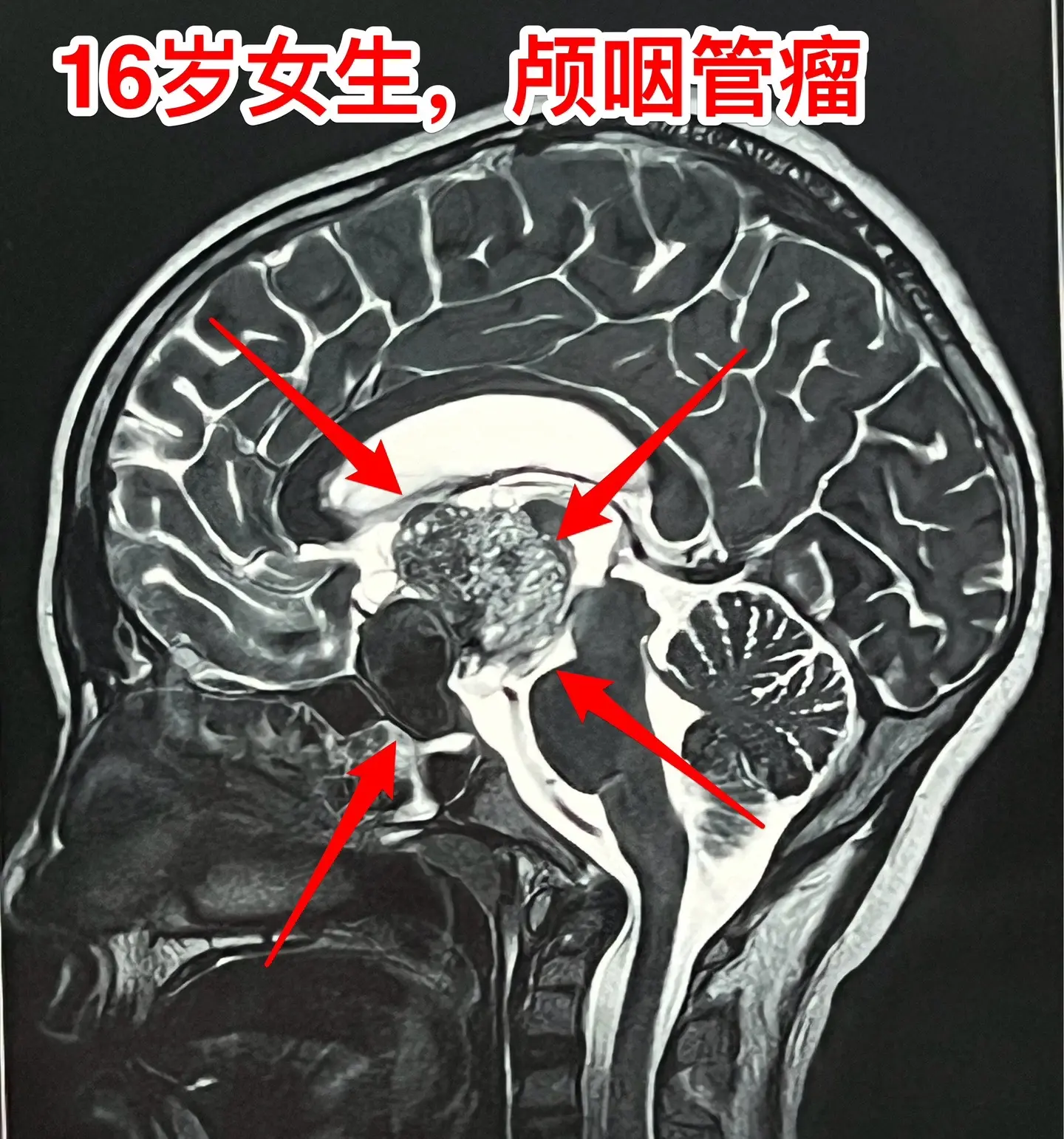 近一年有头痛症状,视力也下降了。作磁共振发现长了脑部肿瘤,才到北京来找我作手术。肿瘤体积大,没有钙化,是颅咽管瘤吗?