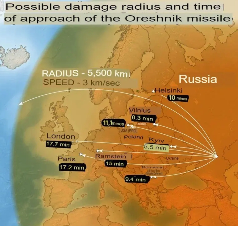莫斯科箭如雨下!这个世界要乱套了,俄罗斯和西方互相模拟导弹打击! 俄罗斯的媒体发布视频,显示用速度3马赫的中程导弹计算,打遍欧洲各地所需的时间!其中到最远的伦敦仅要17分钟。带六个弹头36个战斗部件,能飞5000多公里,3公里每秒的速度指哪打哪。