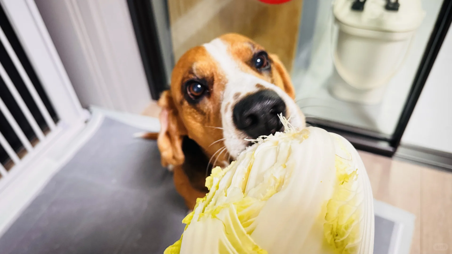 布鲁酱 比格犬 我家宠物好可爱 狗狗吃饭 吃饭不挑食的狗 家有馋狗 趁着忙碌,布鲁酱把大白菜给偷吃了,堪比猪拱白菜……