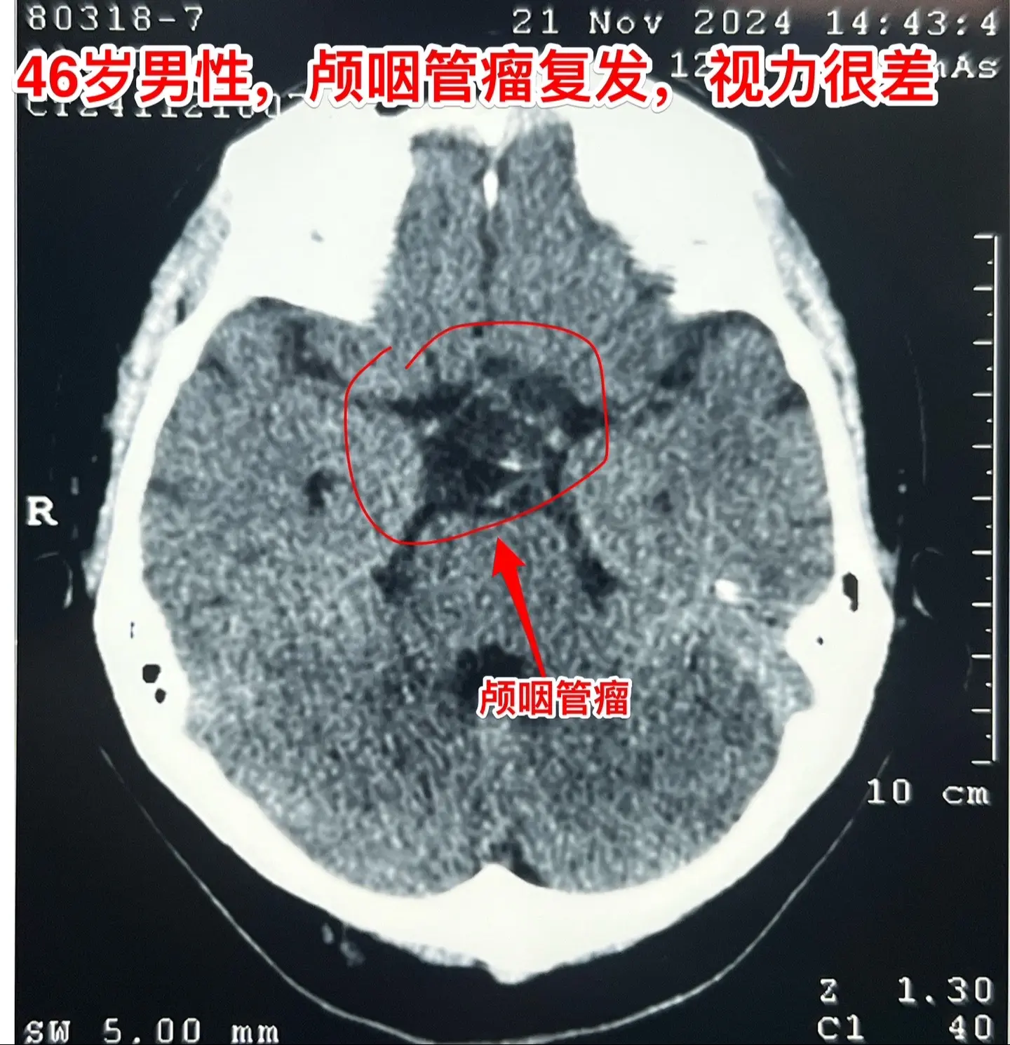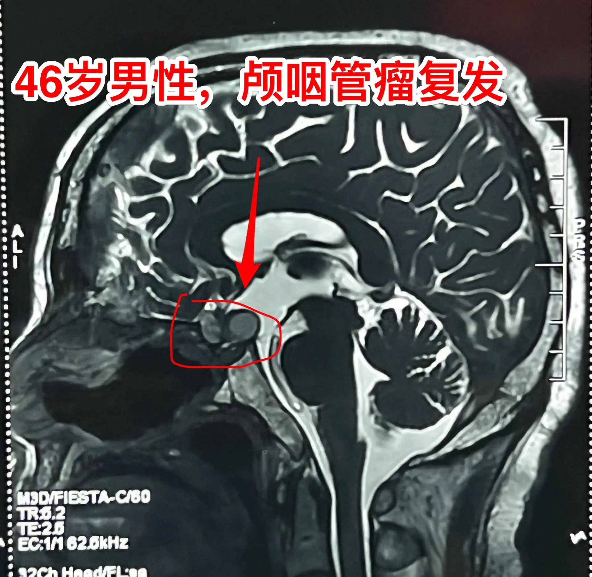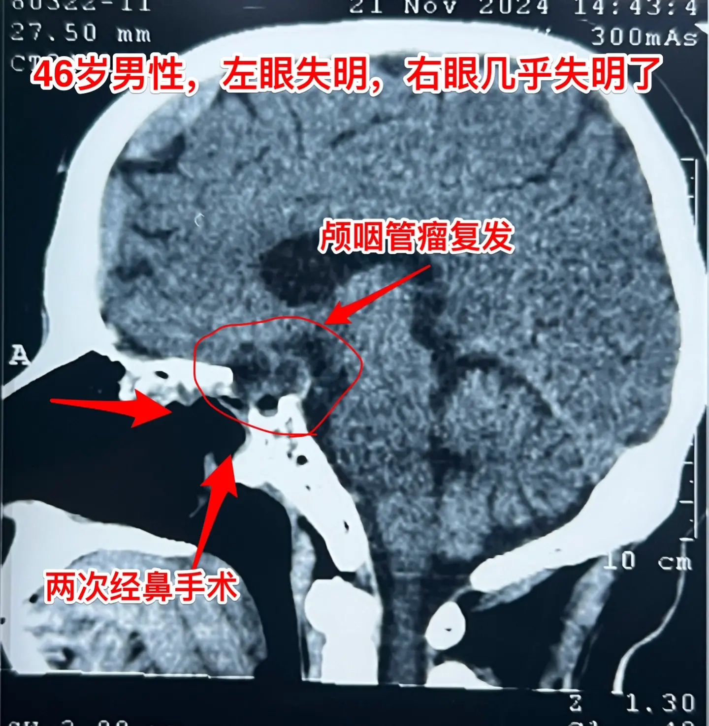 46岁,宜宾市男性,因视力下降发现颅咽管瘤,于2022年8月在外院行经鼻内镜颅咽管瘤切除手术,手术后视力有好转。术后5个月复查磁共振显示肿瘤有复发,一边观察一边采用中药治疗,肿瘤越来越大,左眼失明,右眼视力也很差。不得已于2024.9.24在外院行第二次经鼻手术,手术后左眼视力无好转,右眼 本来就不好的视力也越来越差,病人赶到北京来治疗眼睛,希望能挽救右眼的视力。11月复查磁共振显示肿瘤又长出来了。
