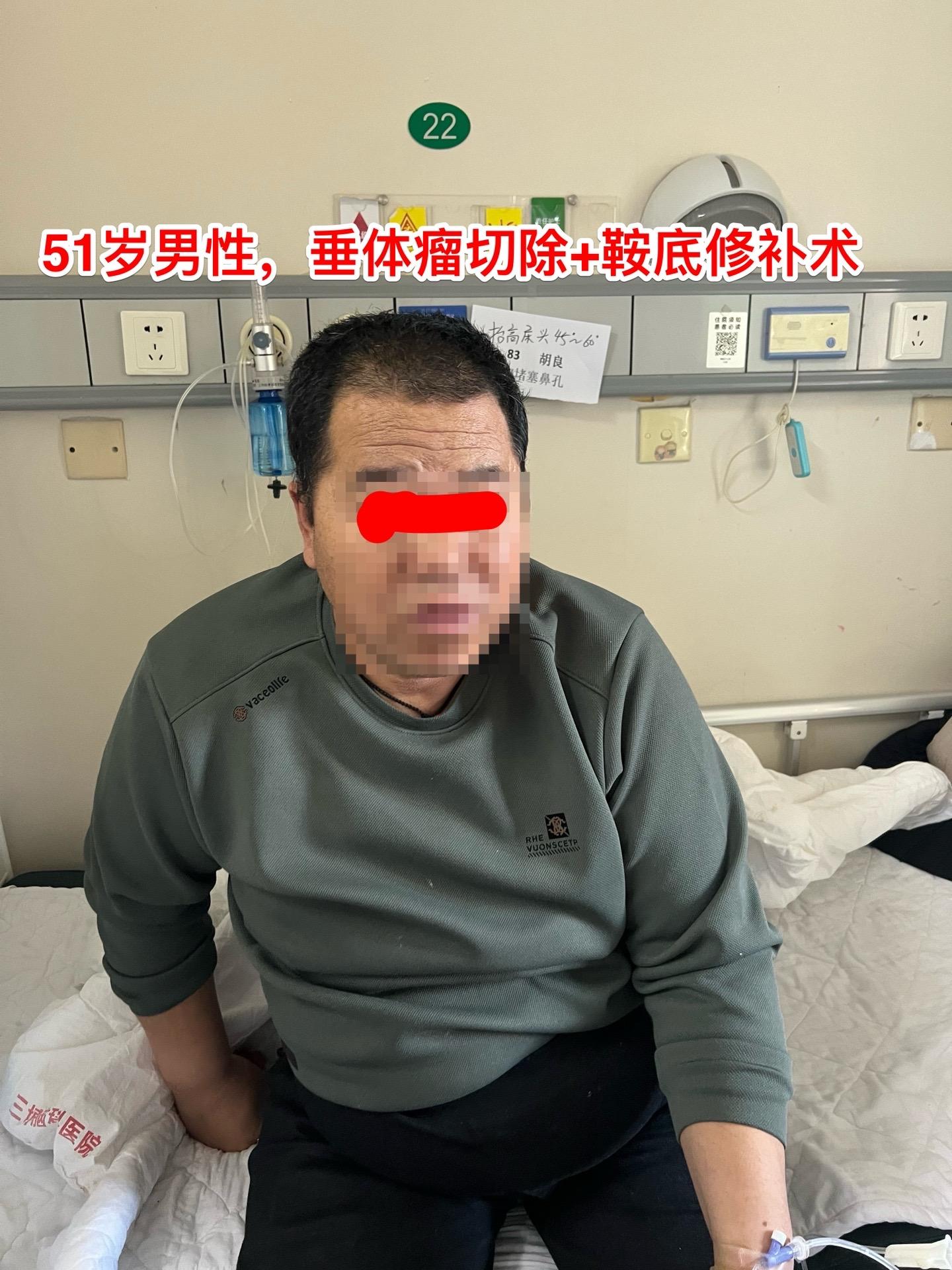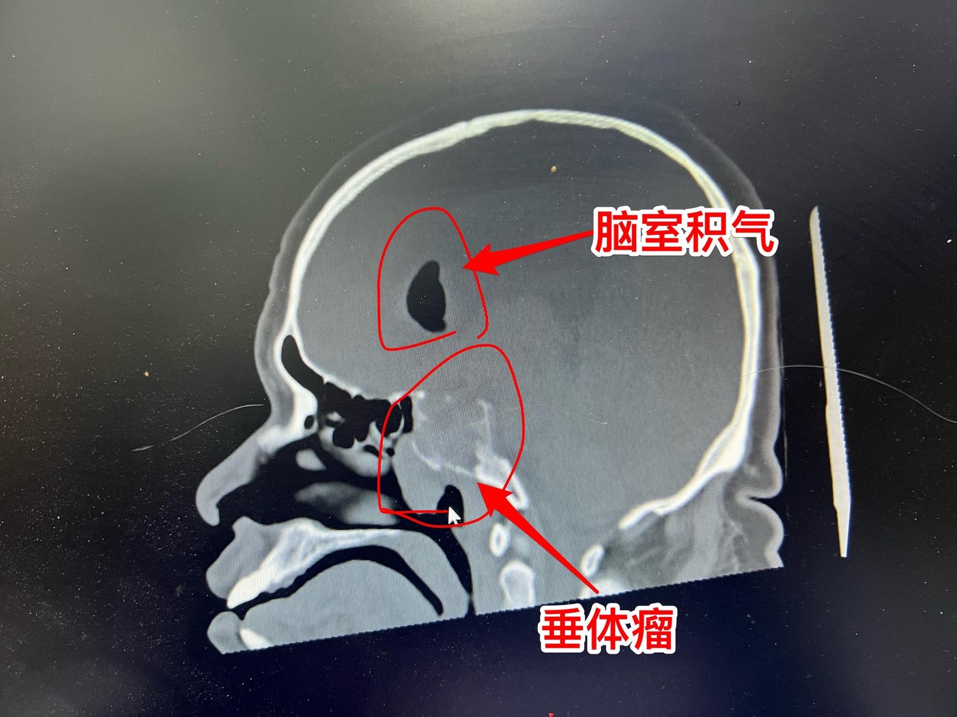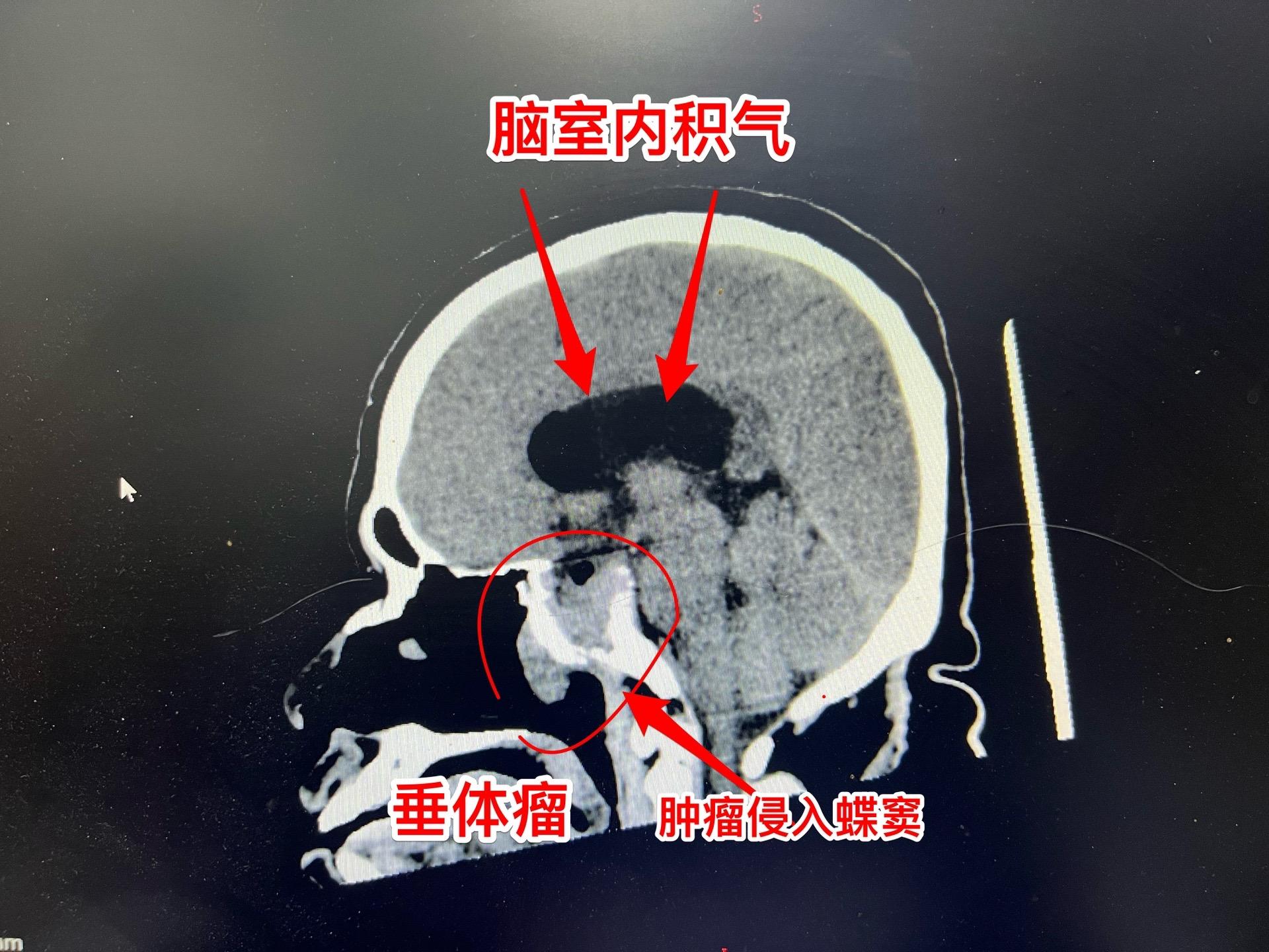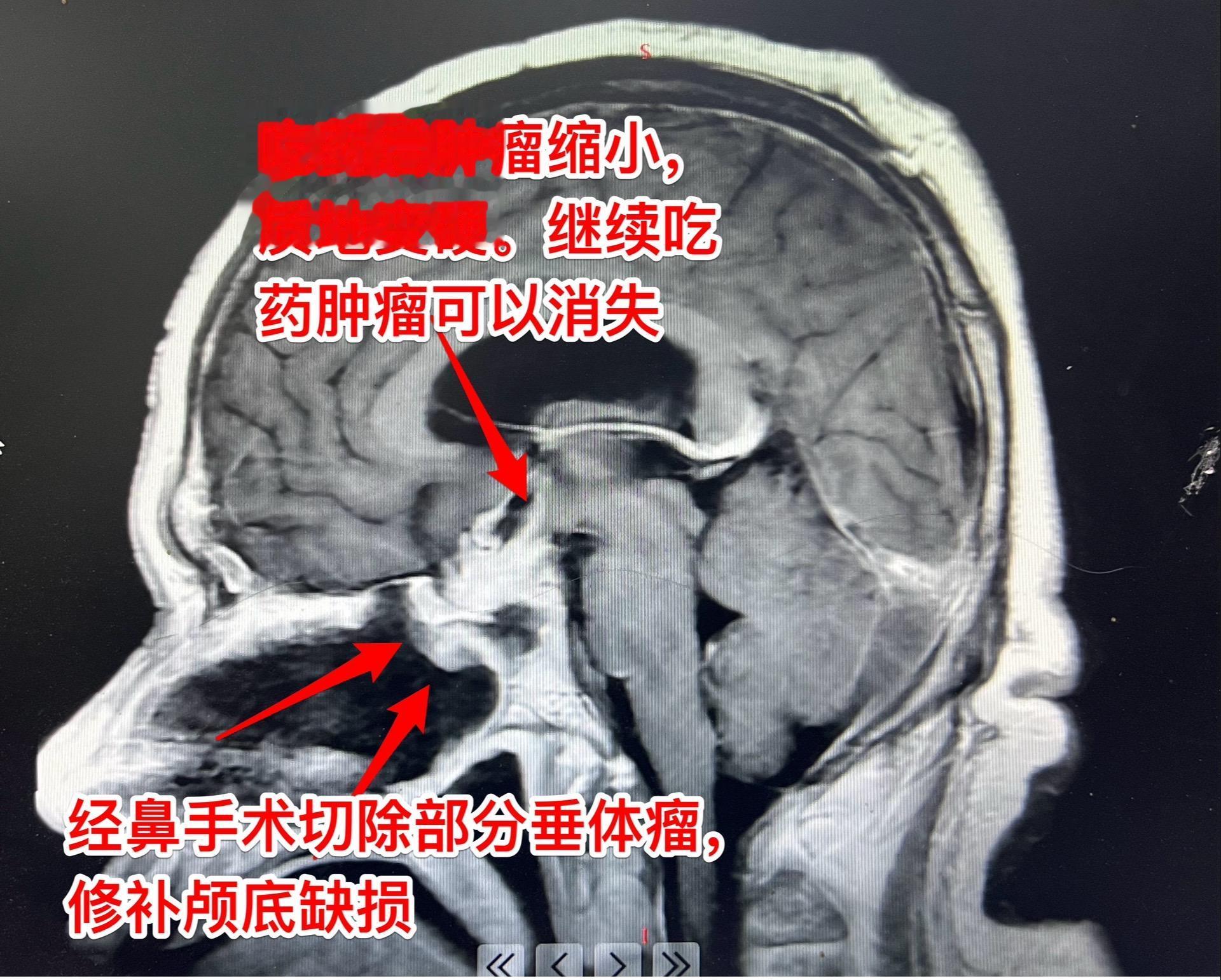 这个51岁的承德市男性,3年前因视力下降到医院检查发现了垂体瘤,经过化验泌乳素,被确诊为泌乳素瘤。口服溴隐亭这个神药,肿瘤变小了,吃药两年后病人因为头晕、行走困难而停药。停药一年后肿瘤又复发了,肿瘤体积很大,侵蚀了垂体窝骨质进入蝶窦内!