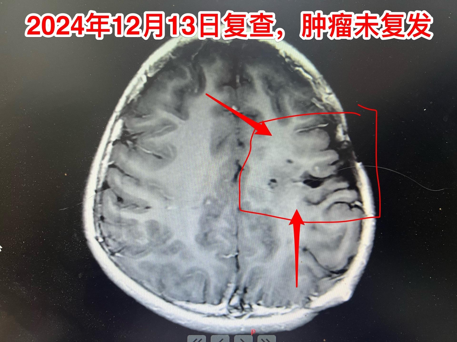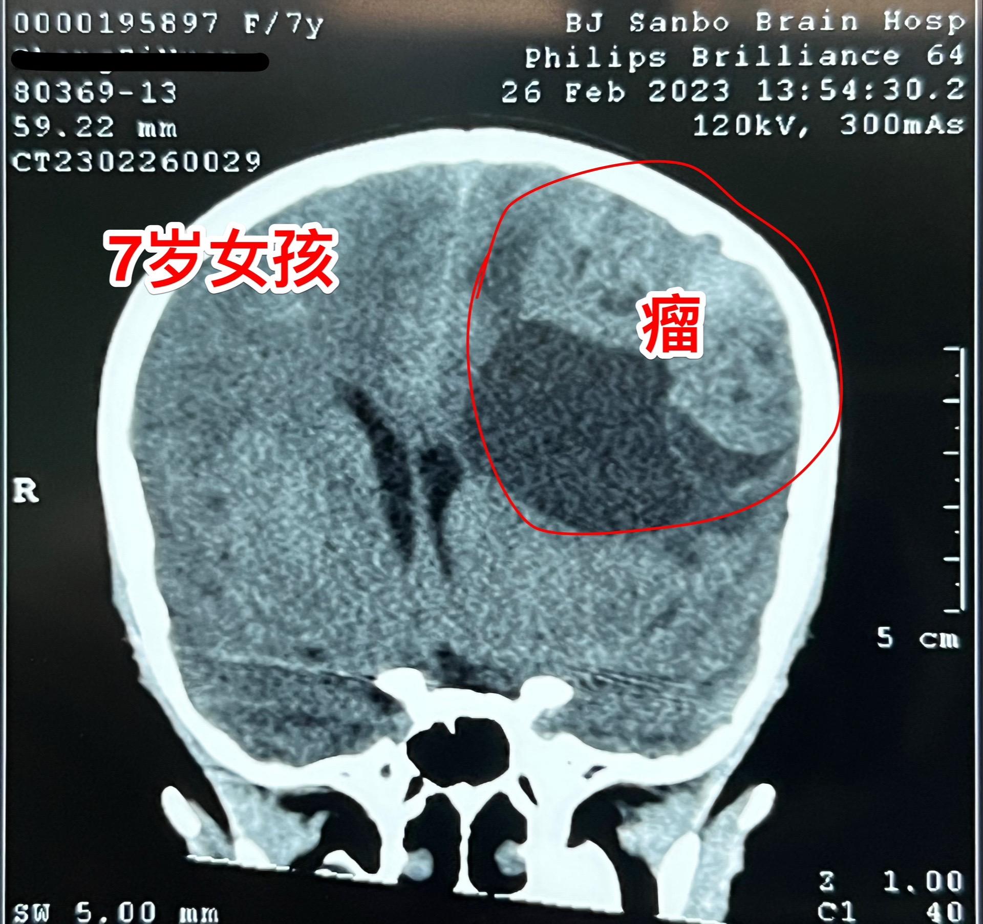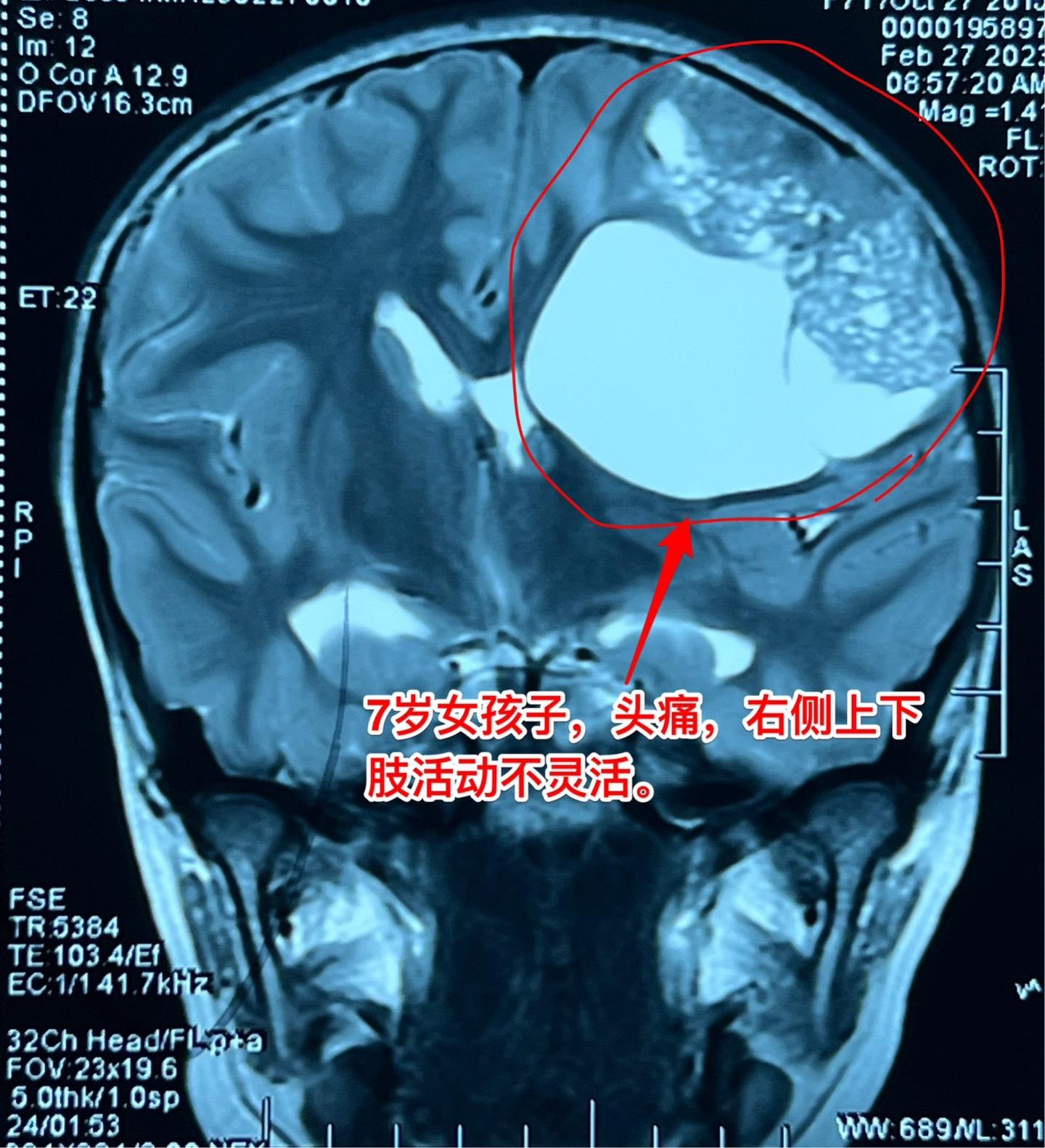 高级别胶质瘤手术后22个月,定期复查。2023年2月28日邯郸市7岁的小女孩因右侧上下肢无力在我科行开颅手术,切除左侧大脑的巨大肿瘤。如图所示,肿瘤体积巨大,手术后小女孩右侧上下肢无力症状明显改善。