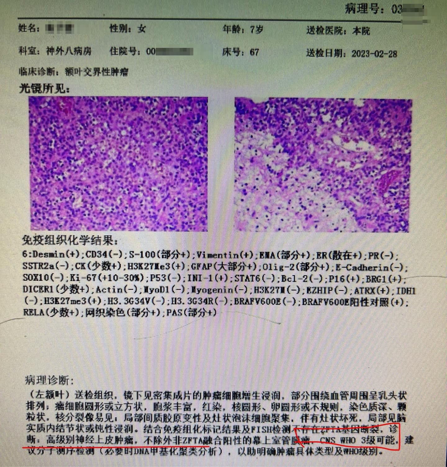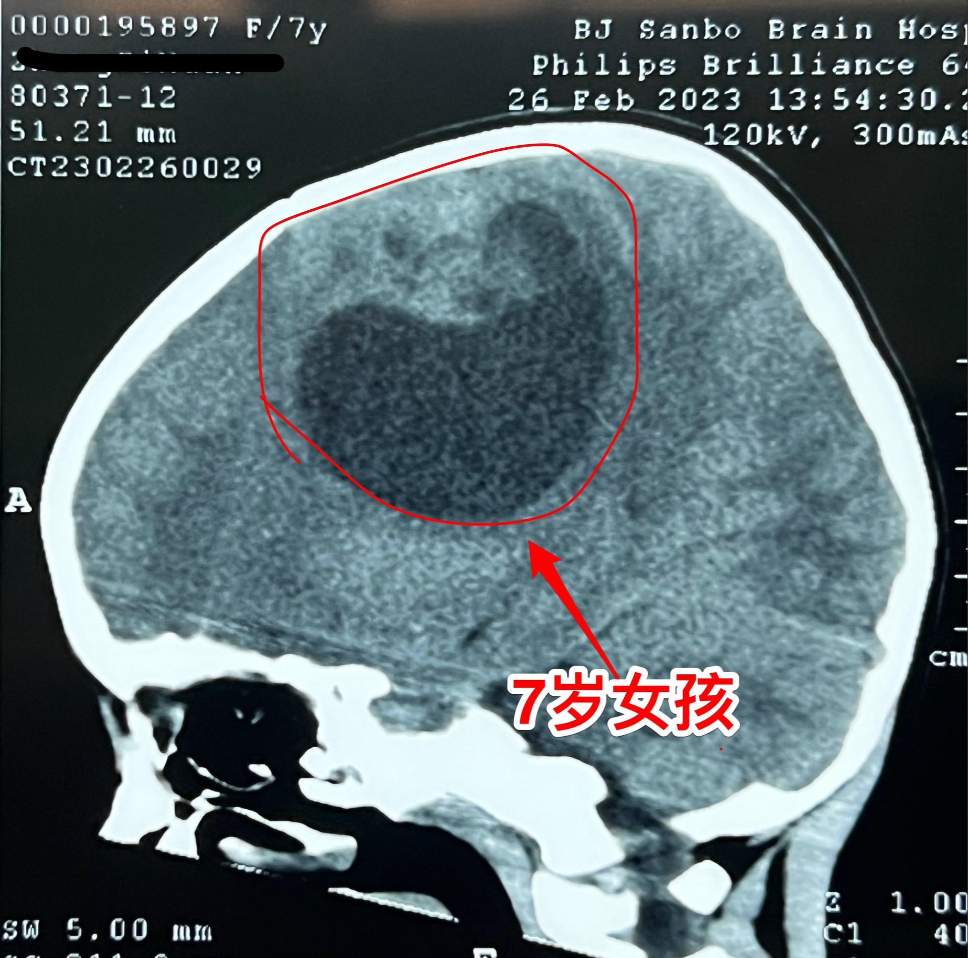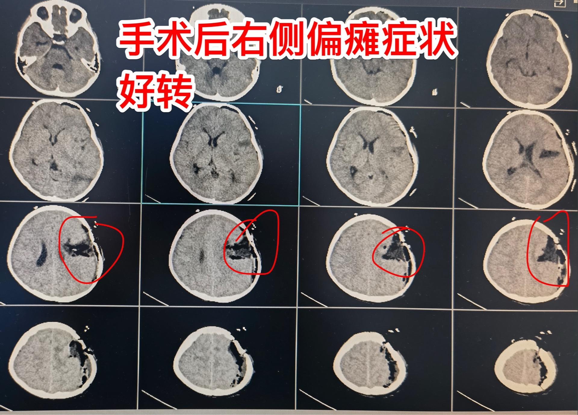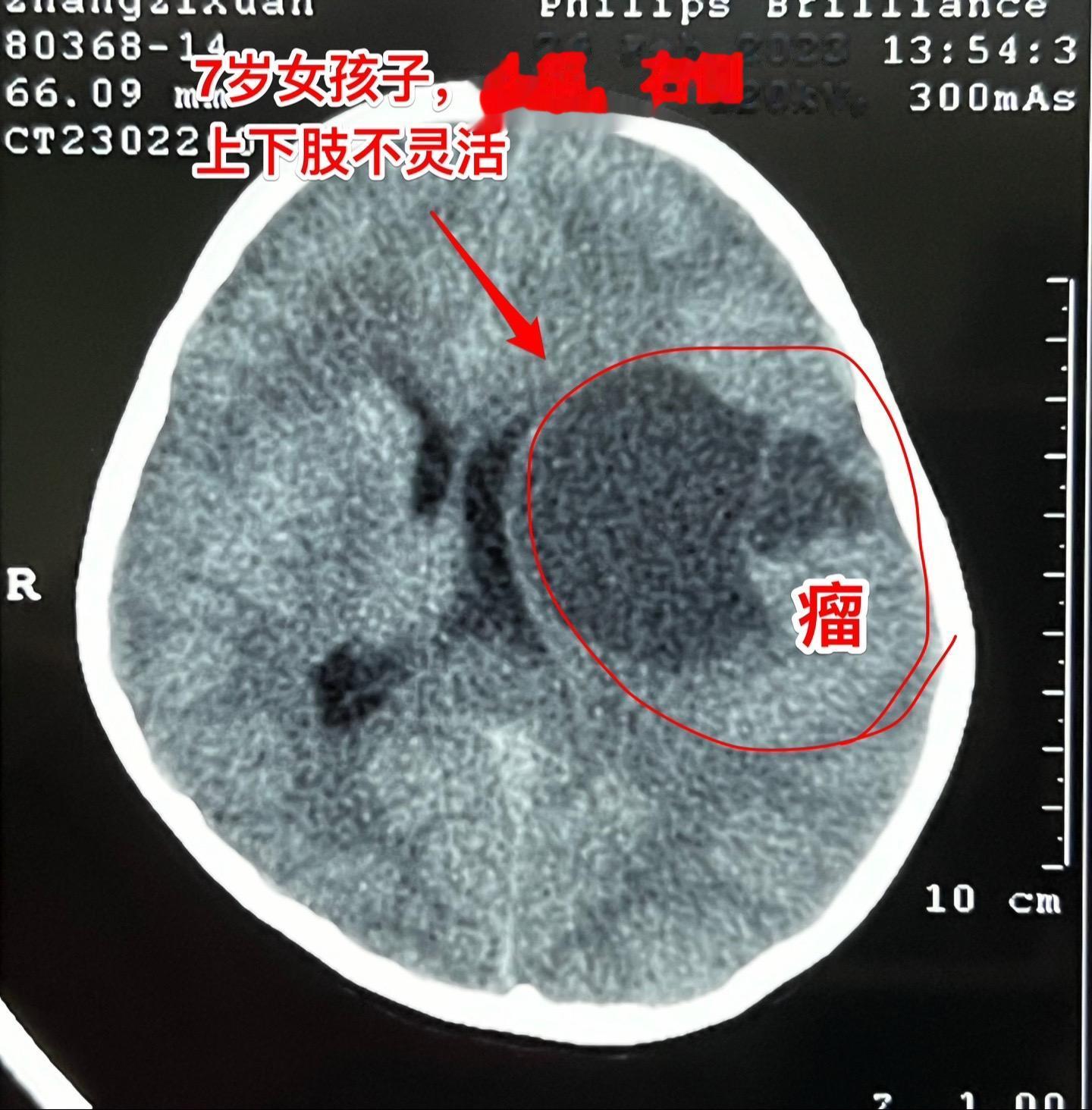 高级别胶质瘤手术后22个月,定期复查。2023年2月28日邯郸市7岁的小女孩因右侧上下肢无力在我科行开颅手术,切除左侧大脑的巨大肿瘤。如图所示,肿瘤体积巨大,手术后小女孩右侧上下肢无力症状明显改善。
