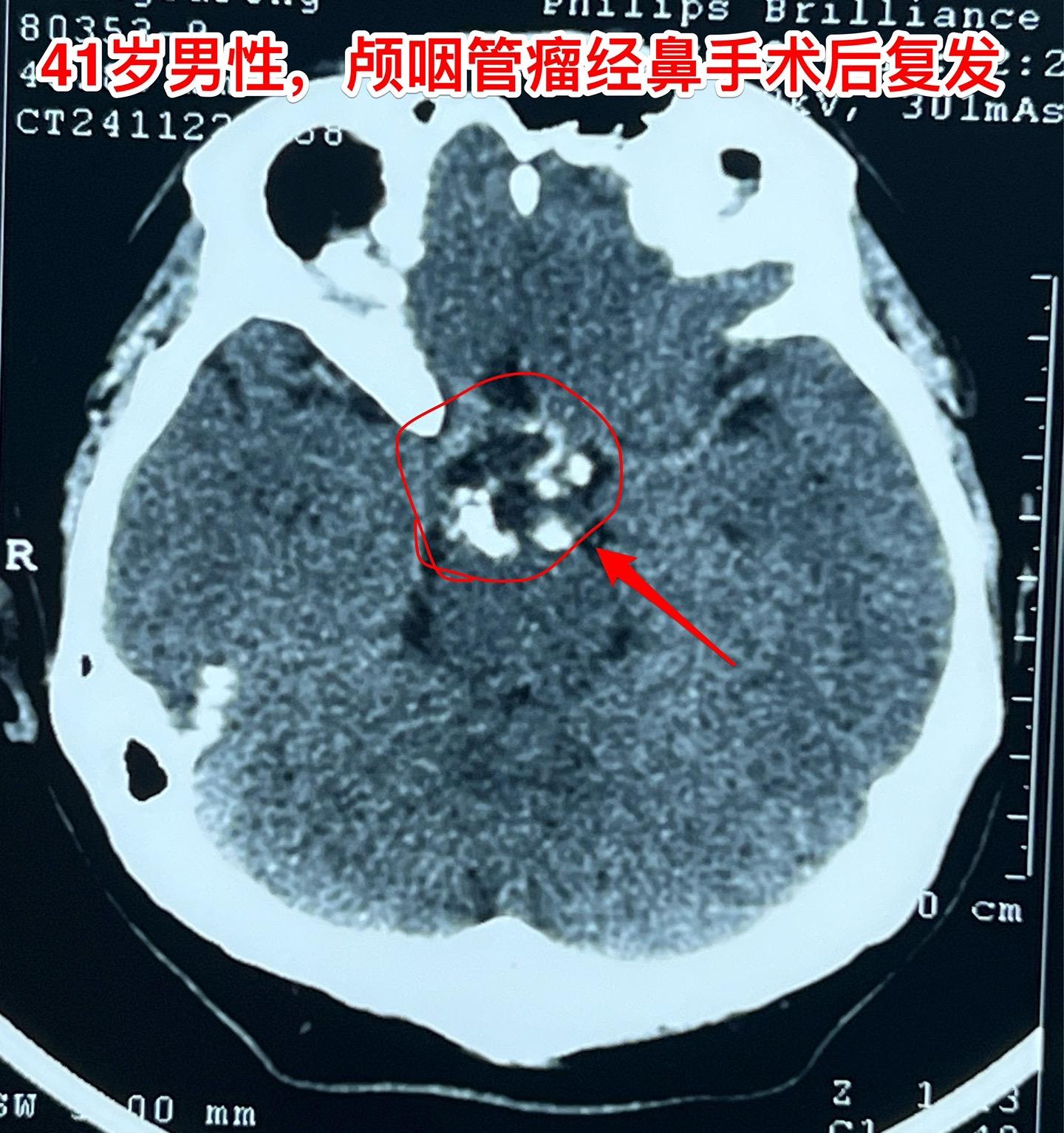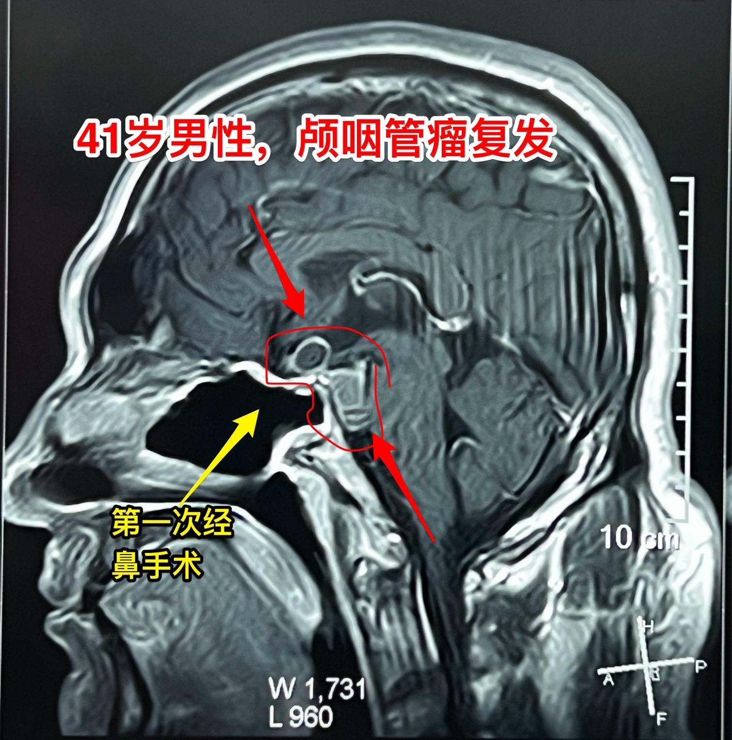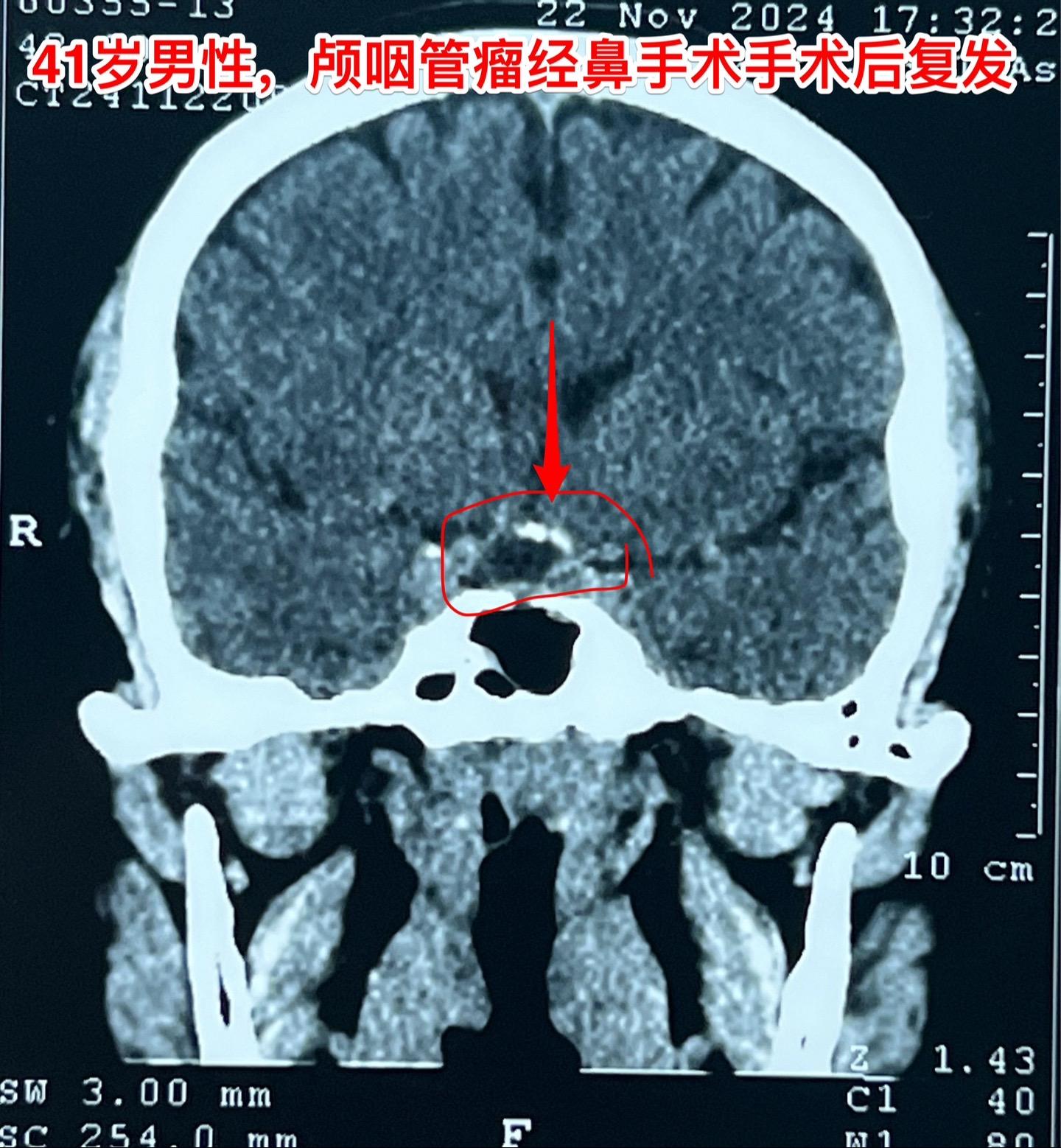 又一个经鼻手术后复发的颅咽管瘤。41岁的大连市男性,三年前因视力下降在...