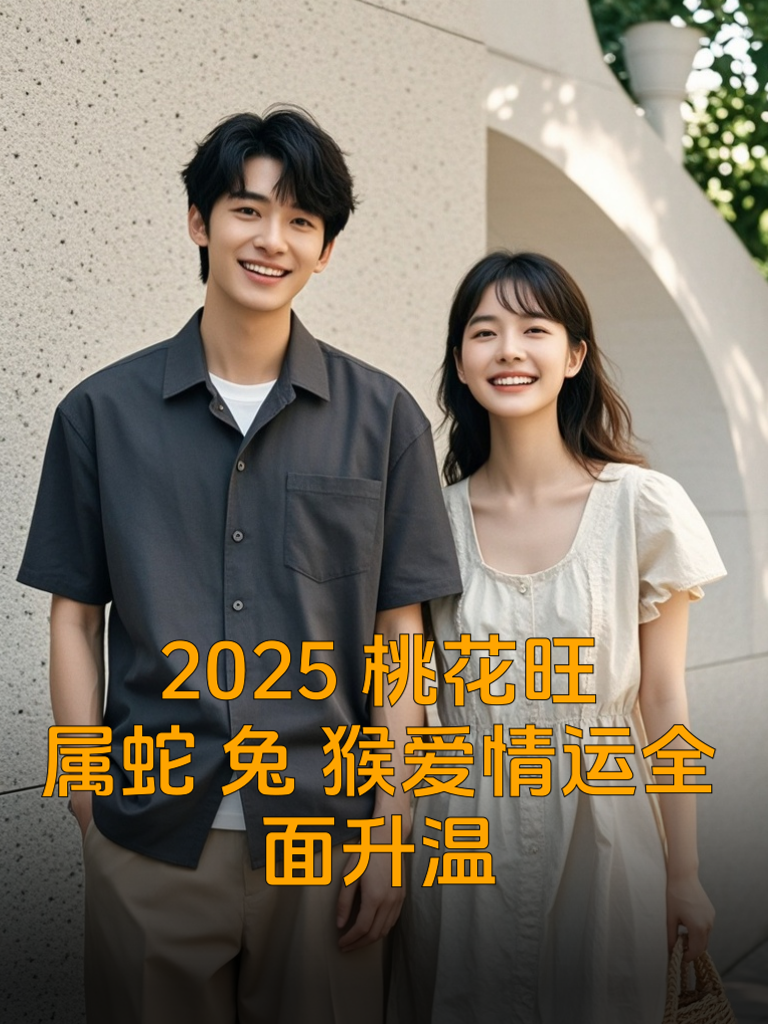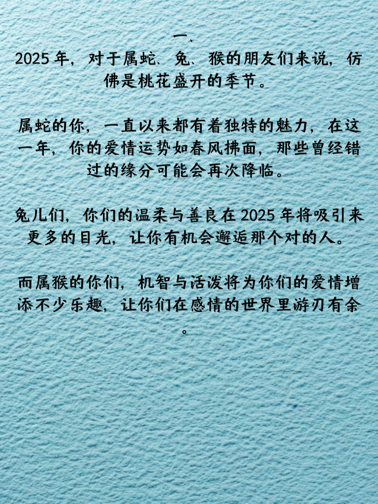 一、2025 年,对于属蛇、兔、猴的朋友们来说,仿佛是桃花盛开的季节。属蛇的你,一直以来都有着独特的魅力,在这一年,你的爱情运势如春风拂面,那些曾经错过的缘分可能会再次降临。兔儿们,你们的温柔与善良在 2025 年将吸引来更多的目光,让你有机会邂逅那个对的人。而属猴的你们,机智与活泼将为你们的爱情增添不少乐趣,让你们在感情的世界里游刃有余。 二、在这个桃花旺的年份,属蛇的你要学会更加自信地展现自己,不要害怕表达内心的情感。兔儿们则要保持那份纯真,用你的善良去感染身边的人。属猴的你们可以多参加一些社交活动,扩大自己的社交圈,这样才能更好地遇到那个让你心动的人。 三、2025 年,属蛇、兔、猴的爱情运全面升温,这是一个难得的机会。让我们一起珍惜这个美好的时光,用真心去对待每一段感情,相信在这一年,你们都能找到属于自己的幸福。无论是甜蜜的恋爱还是稳定的婚姻,都将在你们的生命中绽放光彩。