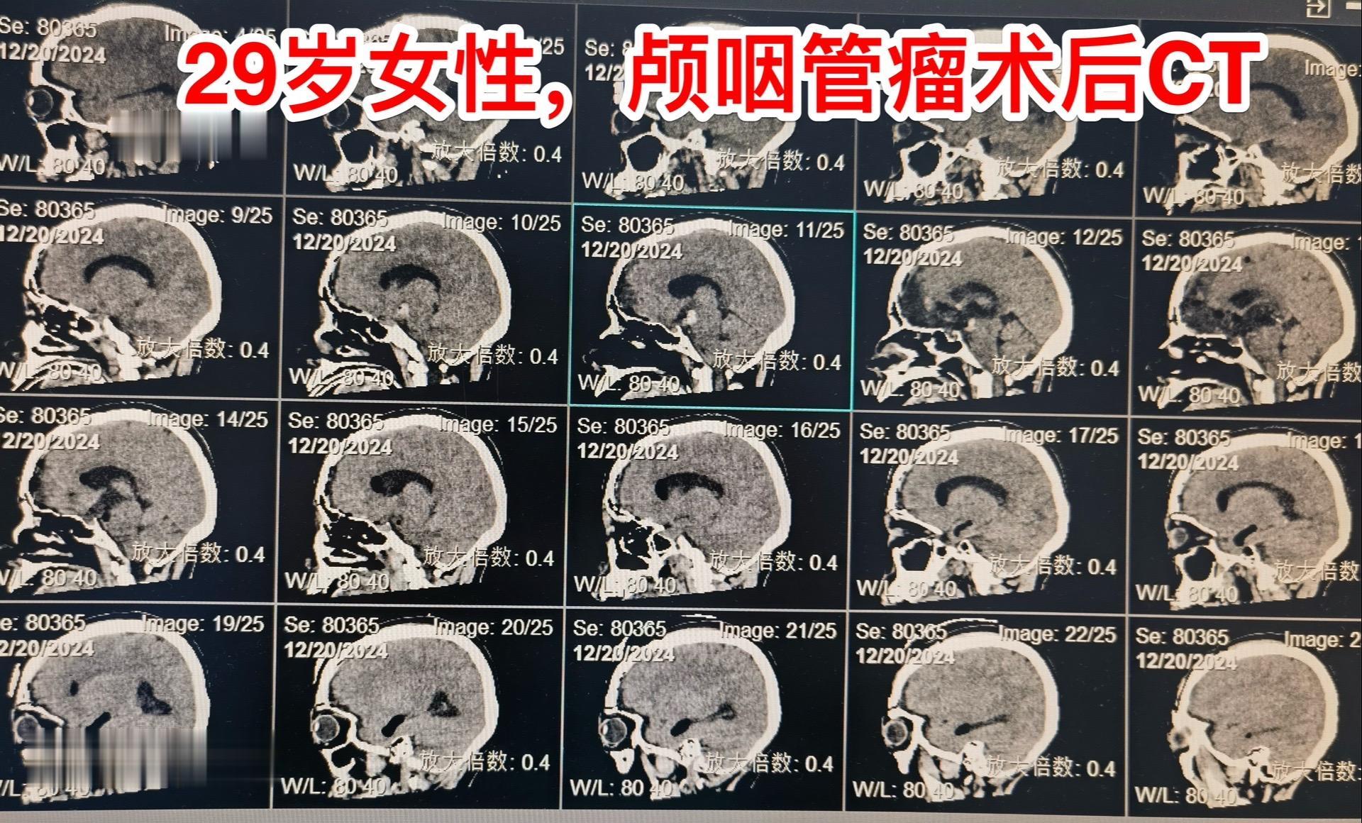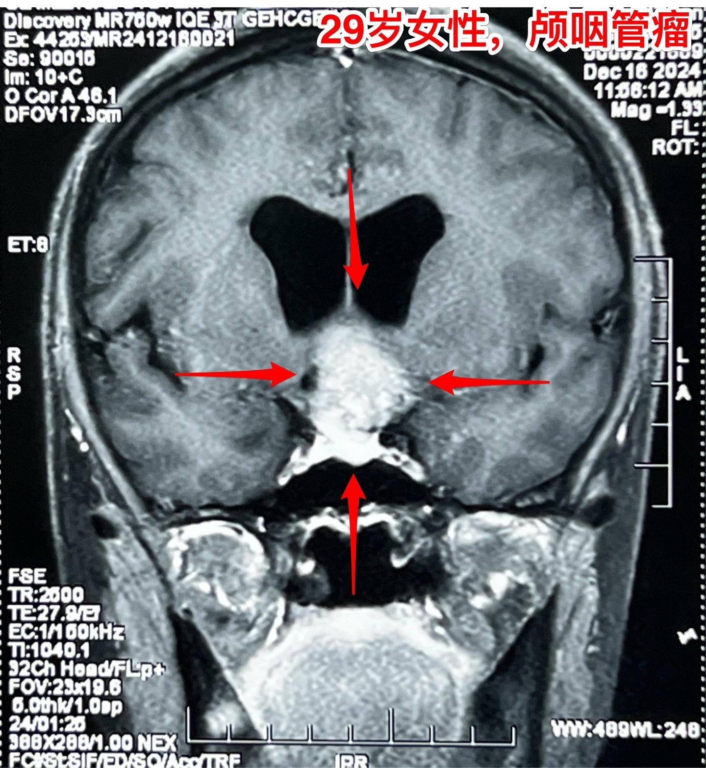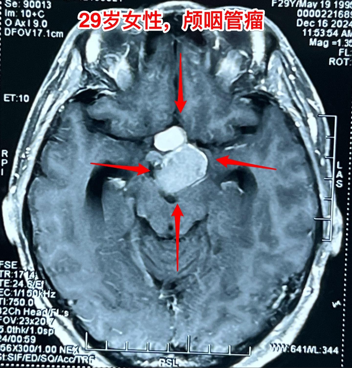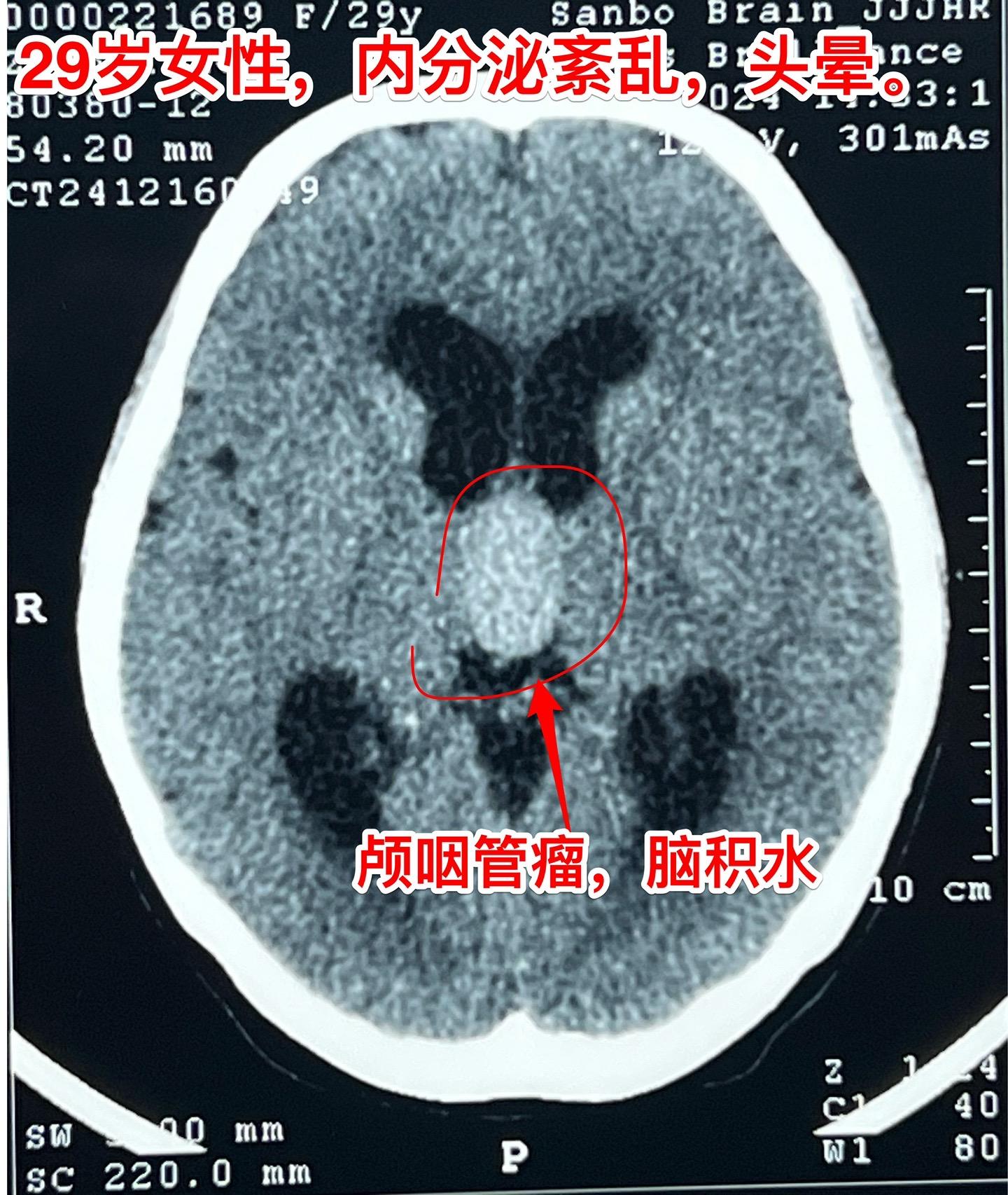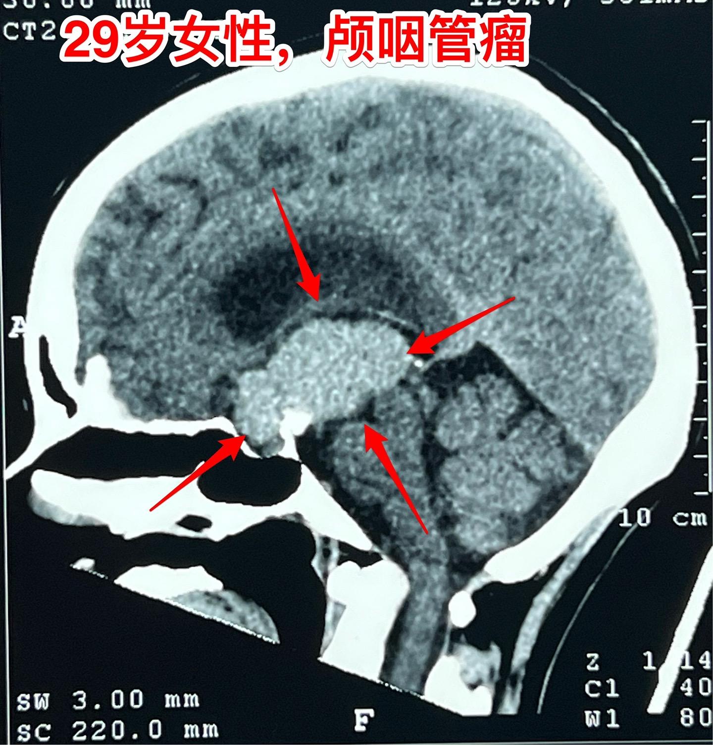 大理市女教师患颅咽管瘤。29岁大理市女老师,因头晕,内分泌功能障碍到医院行脑部CT及磁共振检查,发现颅咽管瘤。CT显示肿瘤有钙化,是典型的造釉细胞性颅咽管瘤。