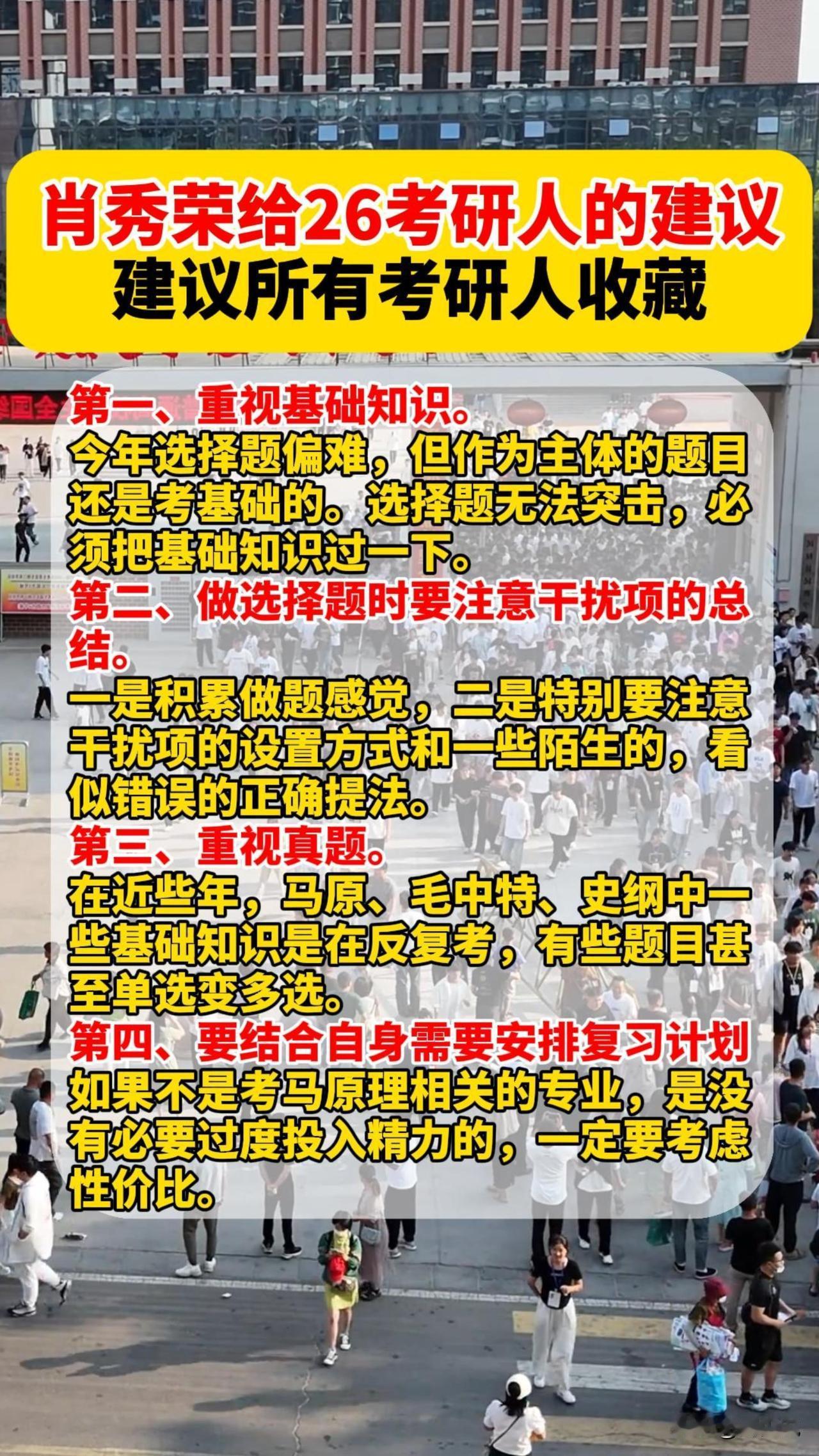 肖秀荣教授给26考研人的四点建议,建议所有考研人收藏,特别实用 第一、重视基础知识。 今年选择题偏难,但作为主体的题目还是考基础的。选择题无法突击,必须把基础知识过一下。 第二、做选择题时要注意干扰项的总结。 一是积累做题感觉,二是特别要注意干扰项的设置方式和一些陌生的,看似错误的正确提法。 第三、重视真题。 在近些年,马原、毛中特、史纲中一些基础知识是在反复考,有些题目甚至单选变多选。 第四、要结合自身需要安排复习计划。 如果不是考马原理相关的专业,是没有必要过度投入精力的,一定要考虑性价比。