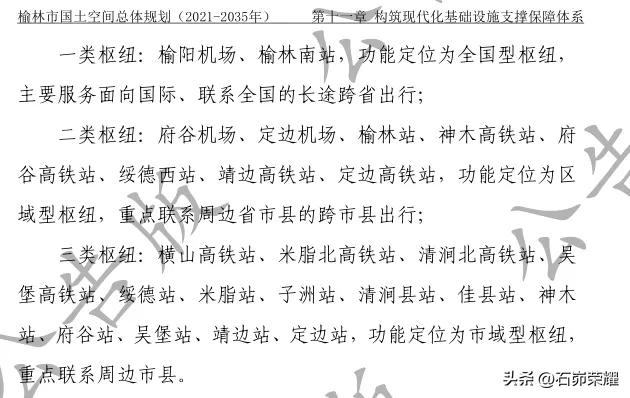 从国土空间规划看未来榆林市12个县市区谁的高铁(普通)站多?横山、吴堡也规划有高铁站 12月10日,省政府批复后的《榆林市国土空间总体规划(2021-2035年)》发布(三类综合客运枢纽见图2): 1.榆林南站、榆林站、榆林机场(谋划新增高铁在此设站) 2.神木高铁站、神木站 3.府谷高铁站、府谷站 4.横山高铁站 5.定边高铁站、定边站 6.靖边高铁站、靖边站 7.绥德西站、绥德站 8.米脂北站、米脂站 9.子洲站 10.清涧北站、清涧站 11.佳县站 12.吴堡高铁站 @石峁荣耀 :除了延榆高铁沿线站点已明确命名外,其余未明确命名设站:神木高铁站(推测为榆鄂包高铁/榆神府城际/忻榆银高铁)、府谷高铁站(推测为榆神府城际/忻榆银高铁);定边、靖边、横山3县高铁站(推测为银川至榆林至太原高铁);吴堡高铁站(推测为太绥高铁);佳县站(推测为榆佳临铁路)。