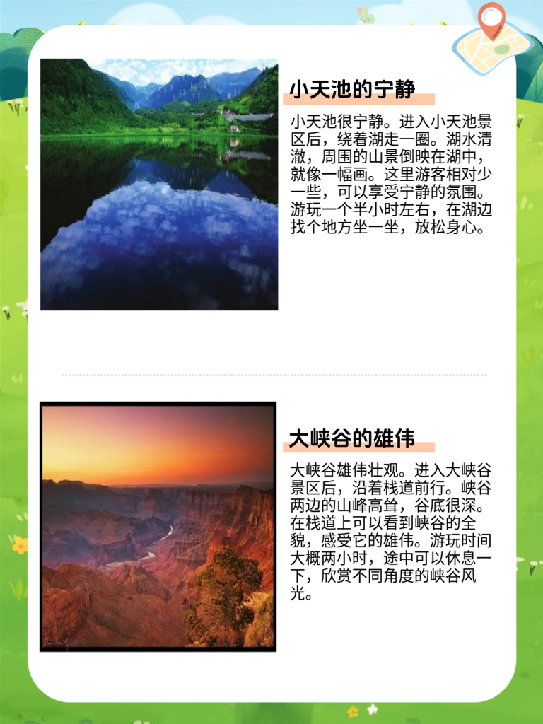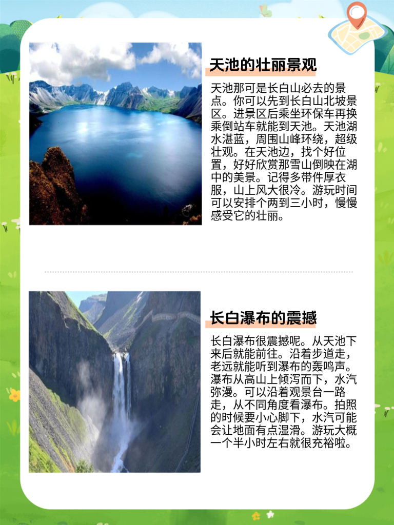 天池那可是长白山必去的景点。你可以先到长白山北坡景区。进景区后乘坐环保车再换乘倒站车就能到天池。天池湖水湛蓝,周围山峰环绕,超级壮观。在天池边,找个好位置,好好欣赏那雪山倒映在湖中的美景。记得多带件厚衣服,山上风大很冷。游玩时间可以安排个两到三小时,慢慢感受它的壮丽。长白瀑布很震撼呢。从天池下来后就能前往。沿着步道走,老远就能听到瀑布的轰鸣声。瀑布从高山上倾泻而下,水汽弥漫。可以沿着观景台一路走,从不同角度看瀑布。拍照的时候要小心脚下,水汽可能会让地面有点湿滑。游玩大概一个半小时左右就很充裕啦。,地下森林很奇特。进入景区后,顺着木栈道一直走。这里树木参天,空气特别清新。地下森林是因为火山运动形成的,走在里面就像走进了原始森林。在里面漫步,感受大自然的神奇,看看那些古老的树木。游玩时间大概两小时,要注意按照指示牌走,别迷路了。,绿渊潭是个清幽的好地方。到了景区后,沿着指示路牌走就能找到。潭水碧绿清澈,周围有很多树木。潭边有一些石头可以坐下来休息,静静地欣赏潭水。这里很适合拍照,尤其是潭水和周围景色的合影。游玩一个小时左右就够了。小天池很宁静。进入小天池景区后,绕着湖走一圈。湖水清澈,周围的山景倒映在湖中,就像一幅画。这里游客相对少一些,可以享受宁静的氛围。游玩一个半小时左右,在湖边找个地方坐一坐,放松身心。大峡谷雄伟壮观。进入大峡谷景区后,沿着栈道前行。峡谷两边的山峰高耸,谷底很深。在栈道上可以看到峡谷的全貌,感受它的雄伟。游玩时间大概两小时,途中可以休息一下,欣赏不同角度的峡谷风光。