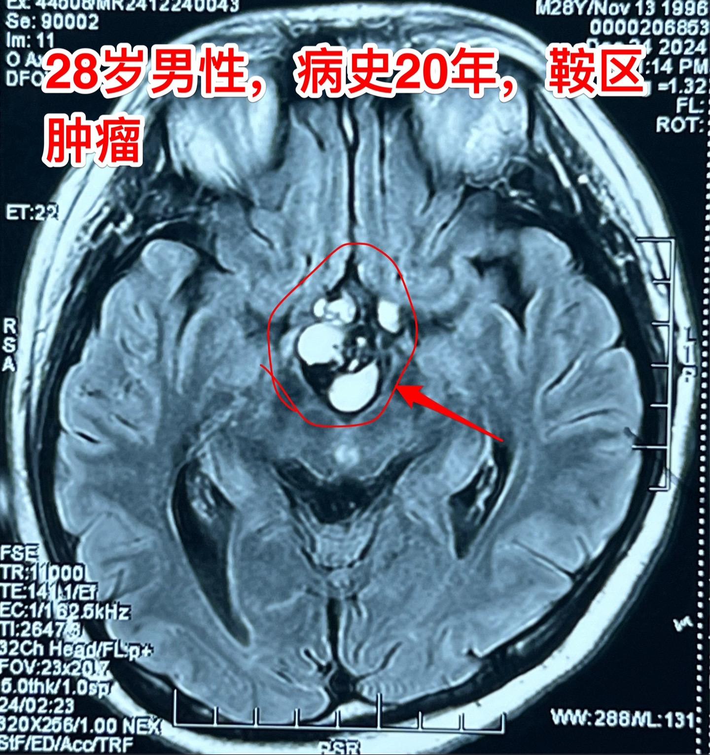 患者随后能正常读书,生长发育也还不错。后来还考上了大学,毕业后曾经在上海工作过。多次复查磁共振显示鞍区肿瘤体积在增大。而且患者也感觉视力方面出现了问题,在多个著名的医院就医过,最后下决心来找我作手术。