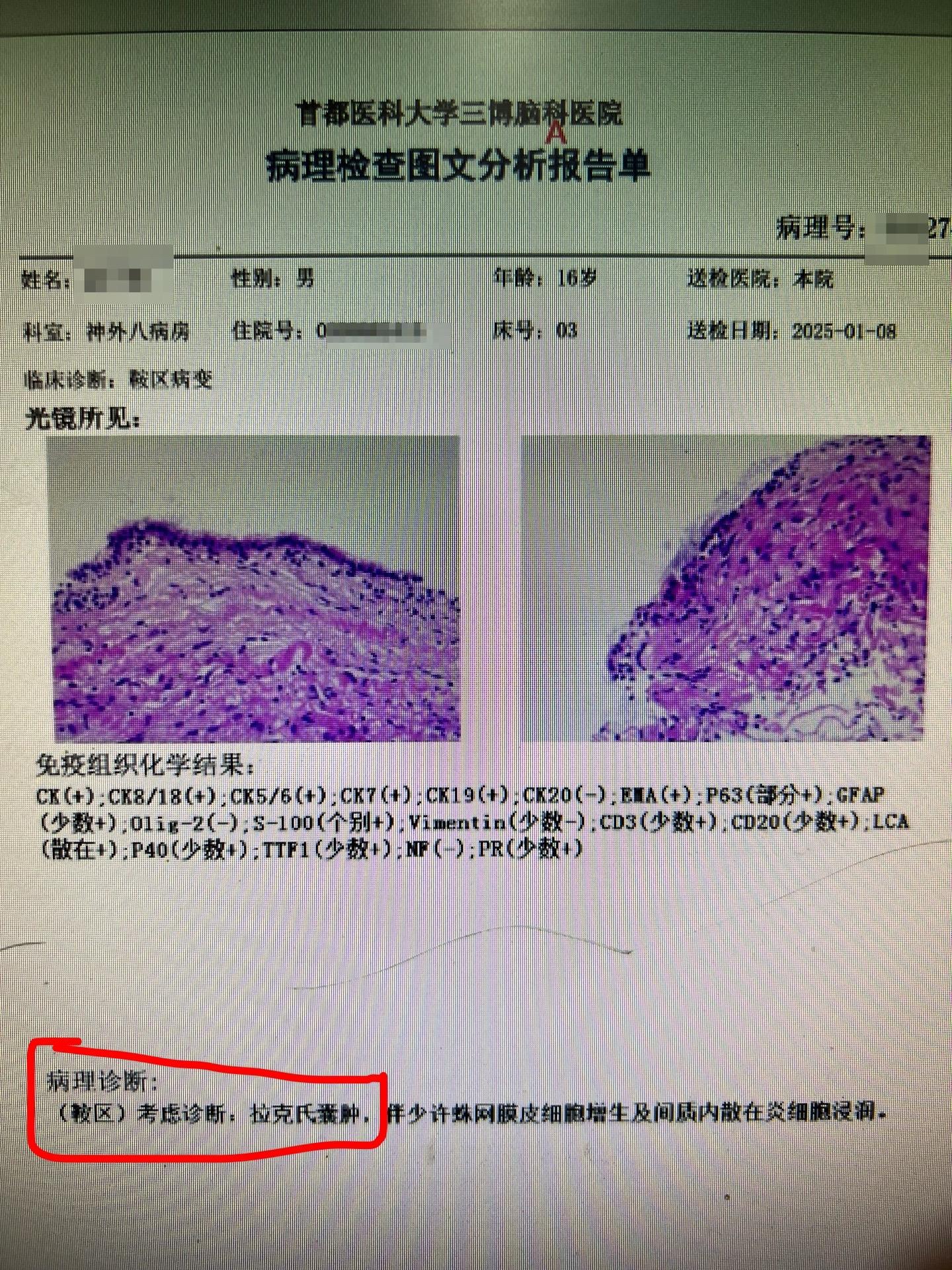 鞍区囊肿不能说是小问题(确诊拉克氏囊肿)16岁的男孩子2年前就因多饮多...
