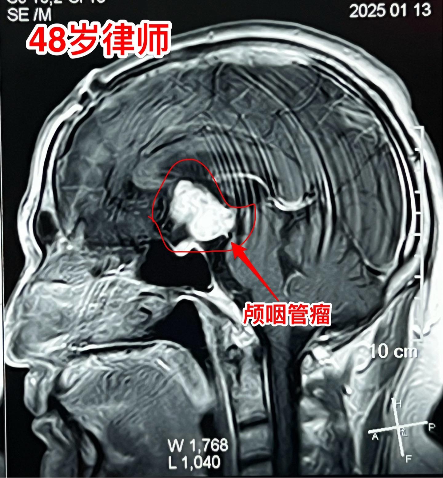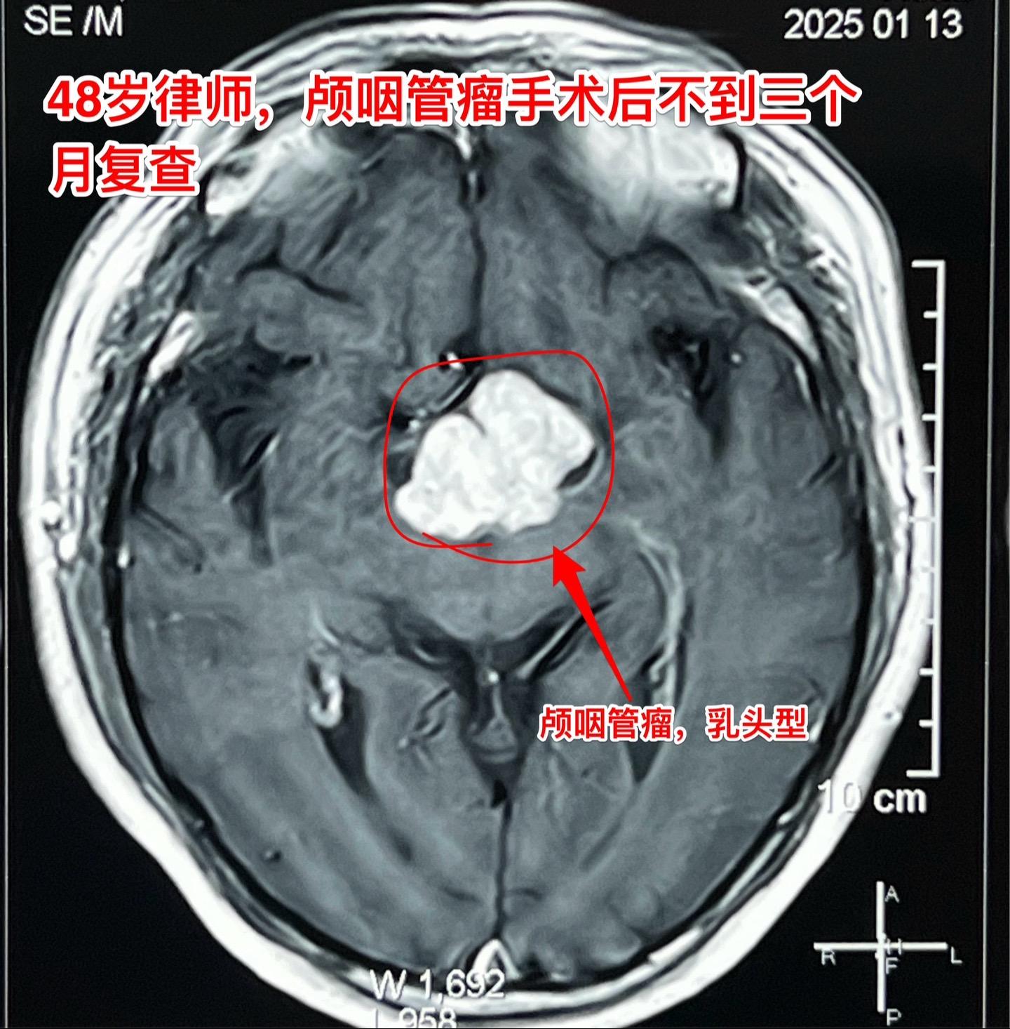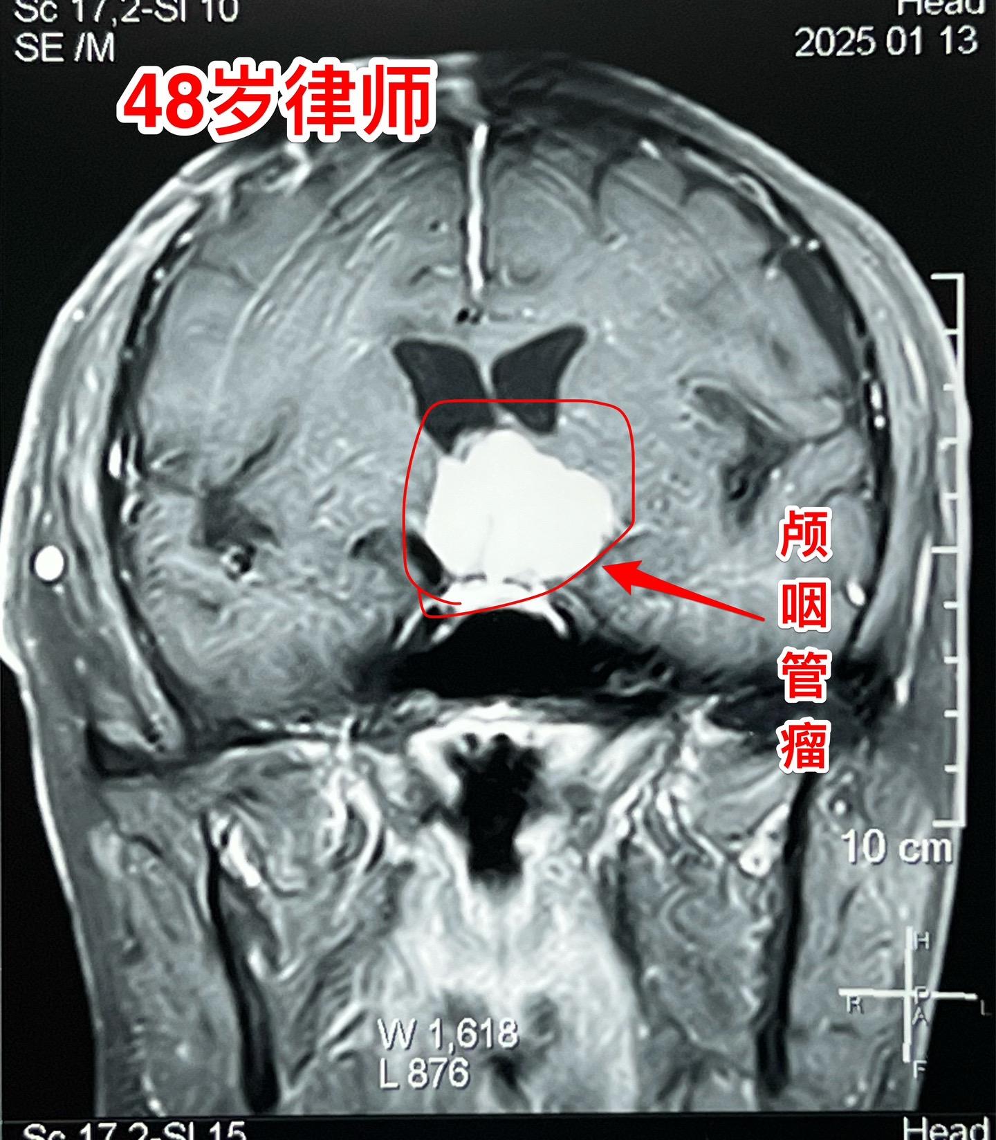 48岁律师,颅咽管瘤术后三个月复查。律师在四川凉山工作,在四川某医院手术未满三个月,自手术后就有记忆力差、爱睡觉等体积症状,难以胜任律师工作。复查磁共振显示颅咽管瘤体积仍然很大,怀疑为肿瘤复发了。