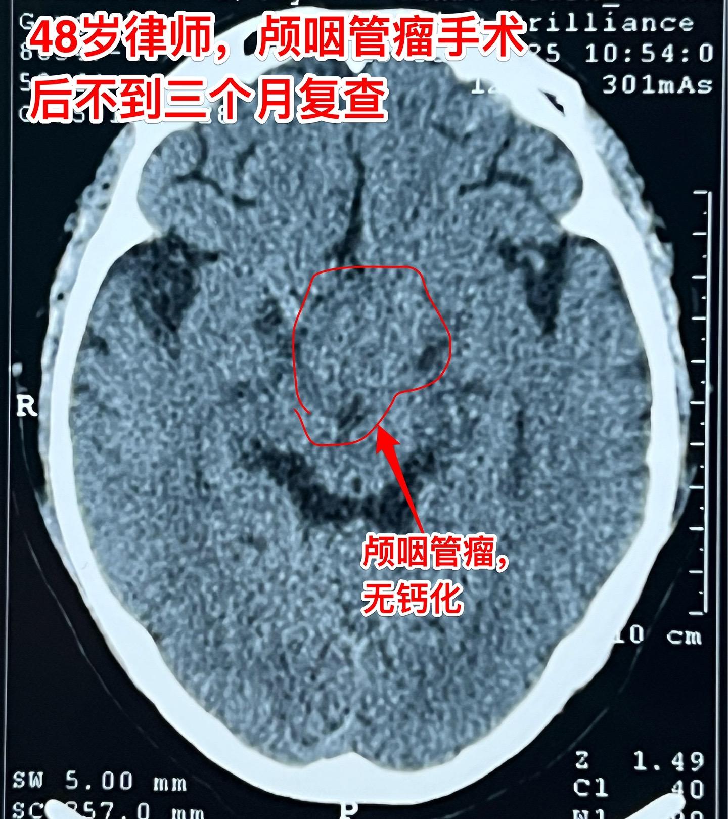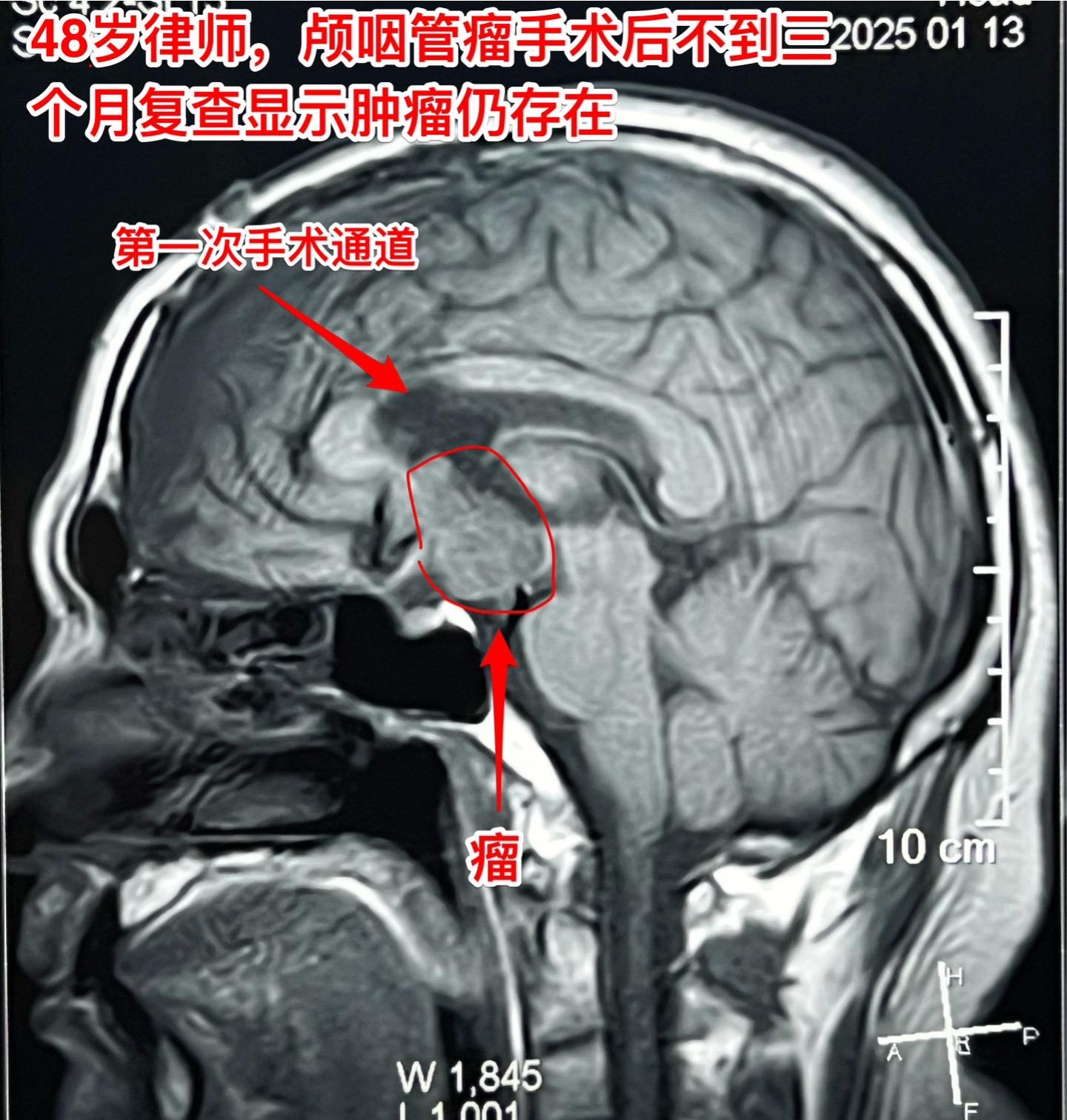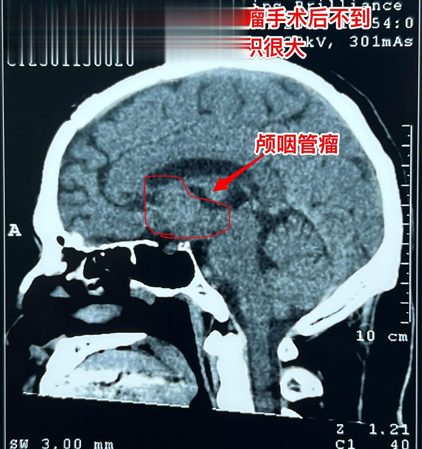 48岁律师,颅咽管瘤术后三个月复查。律师在四川凉山工作,在四川某医院手术未满三个月,自手术后就有记忆力差、爱睡觉等体积症状,难以胜任律师工作。复查磁共振显示颅咽管瘤体积仍然很大,怀疑为肿瘤复发了。