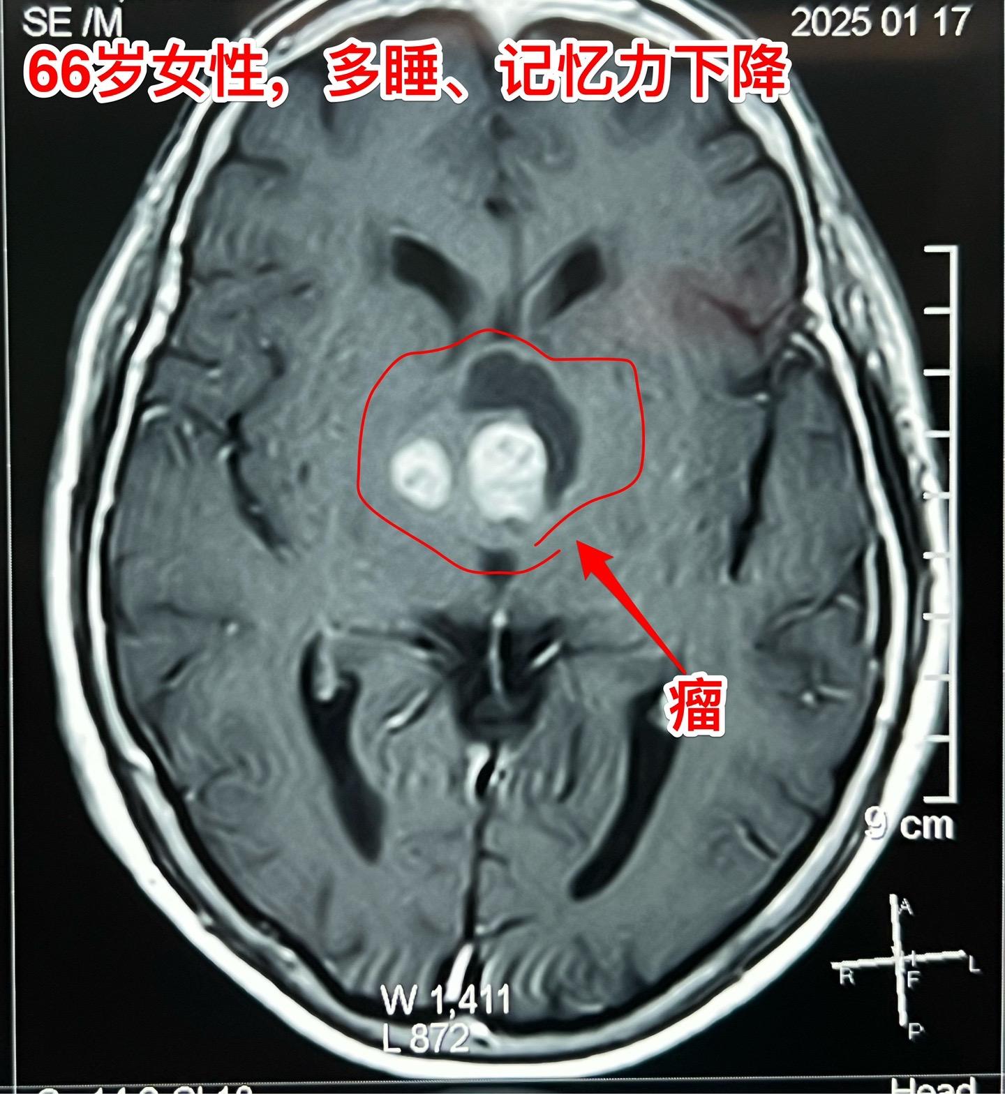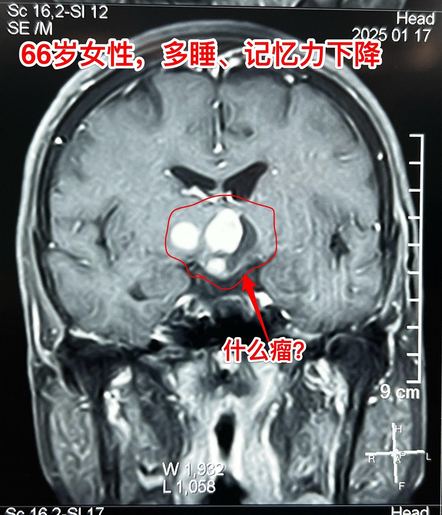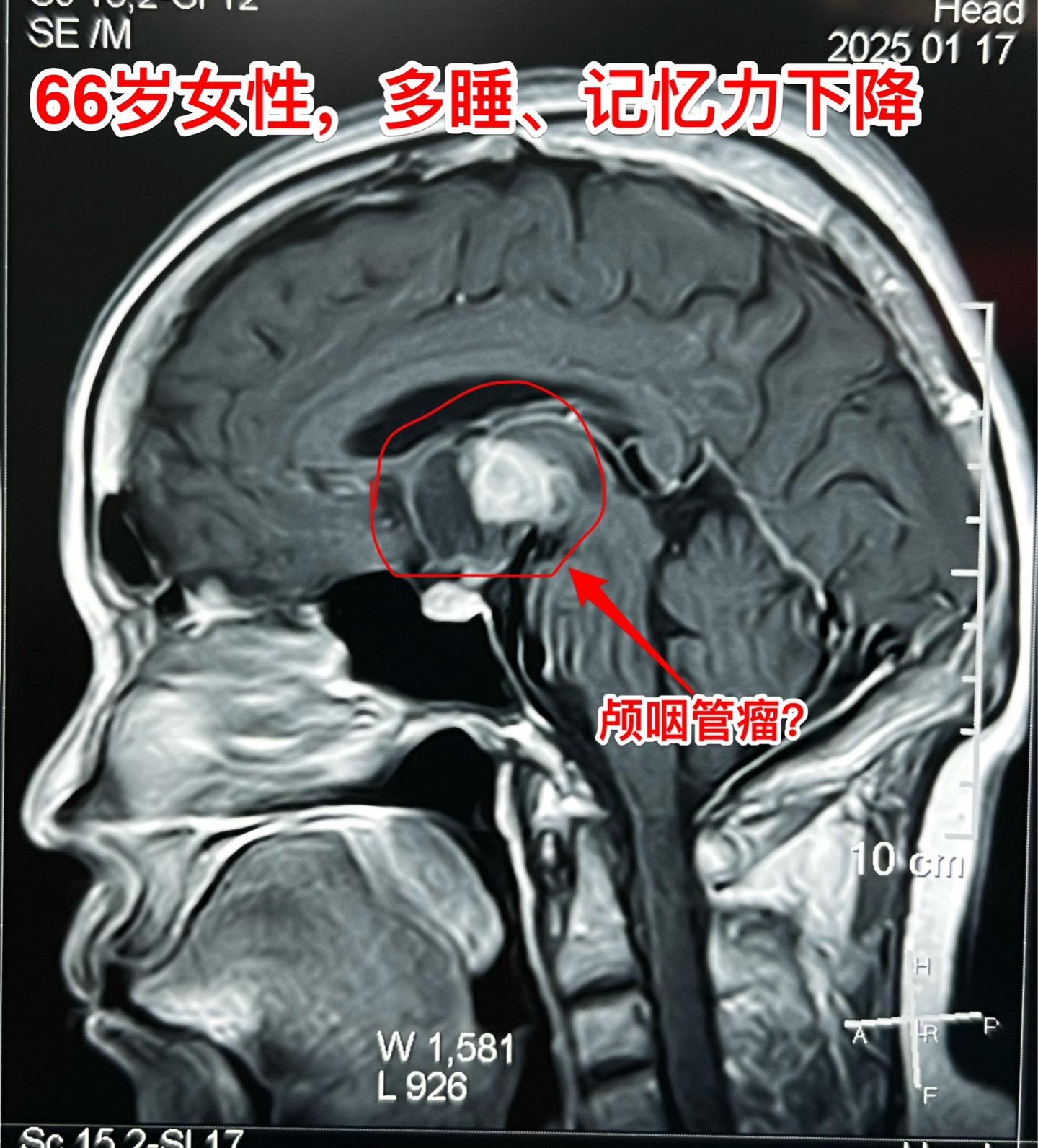 是颅咽管瘤吗?鞍区肿瘤的定性诊断是很难的。66岁女性,泰州人。因为多睡、记忆力下降在外院检查脑部发现脑部肿瘤。病人的多睡症状越来越严重。肿瘤位于鞍上区域,而且伴有脑积水。外院怀疑是颅咽管瘤?或者是别的肿瘤?