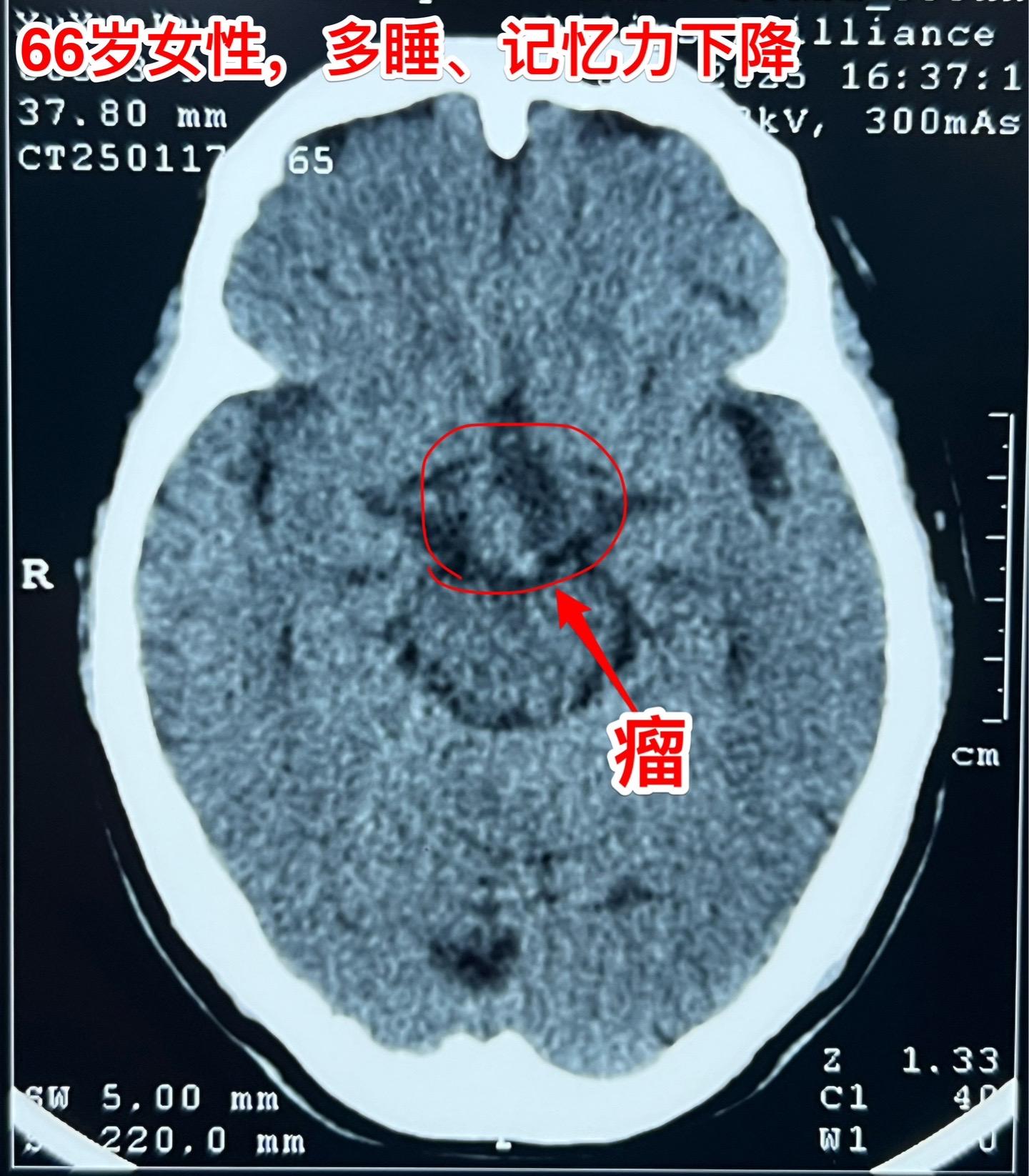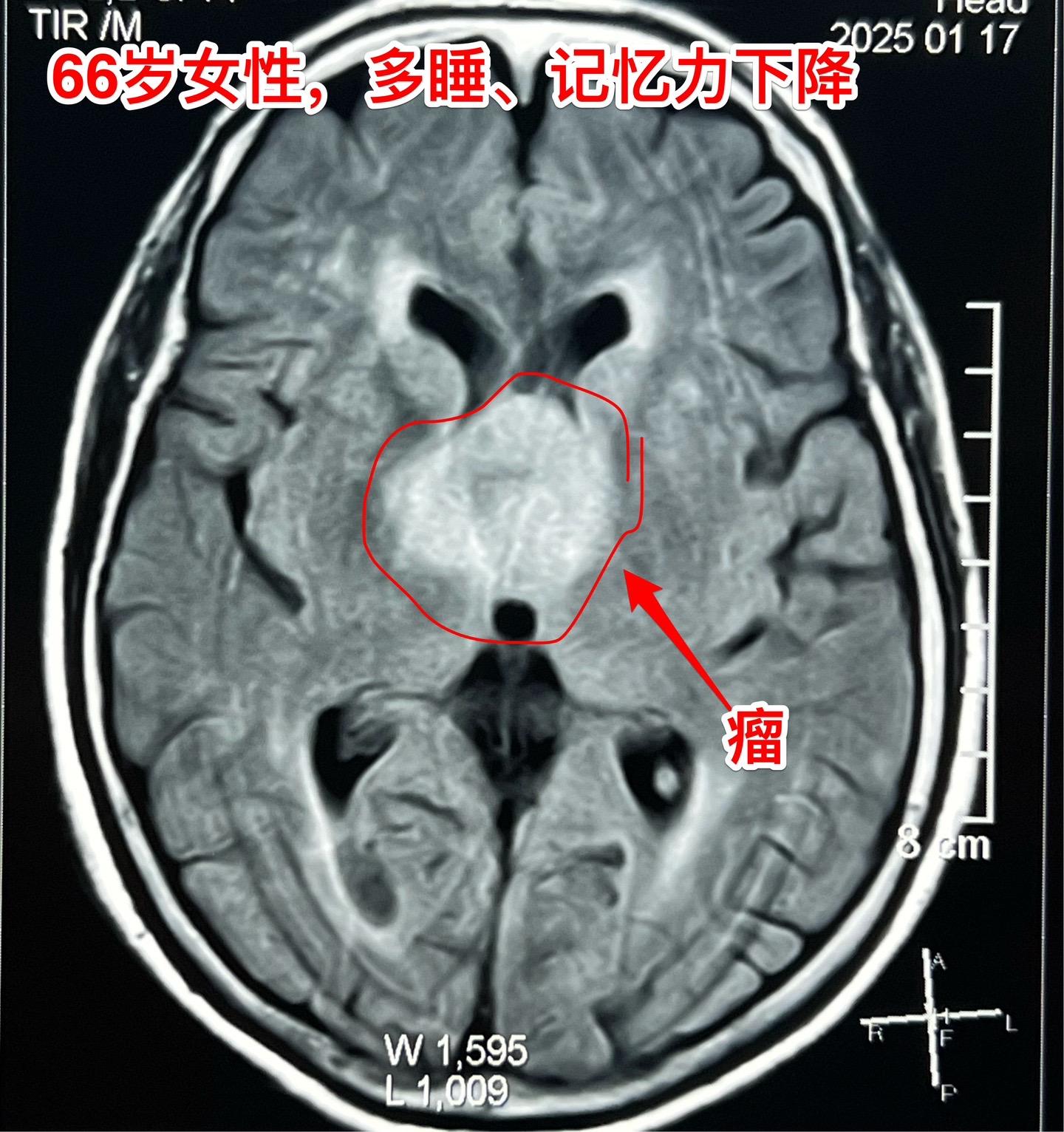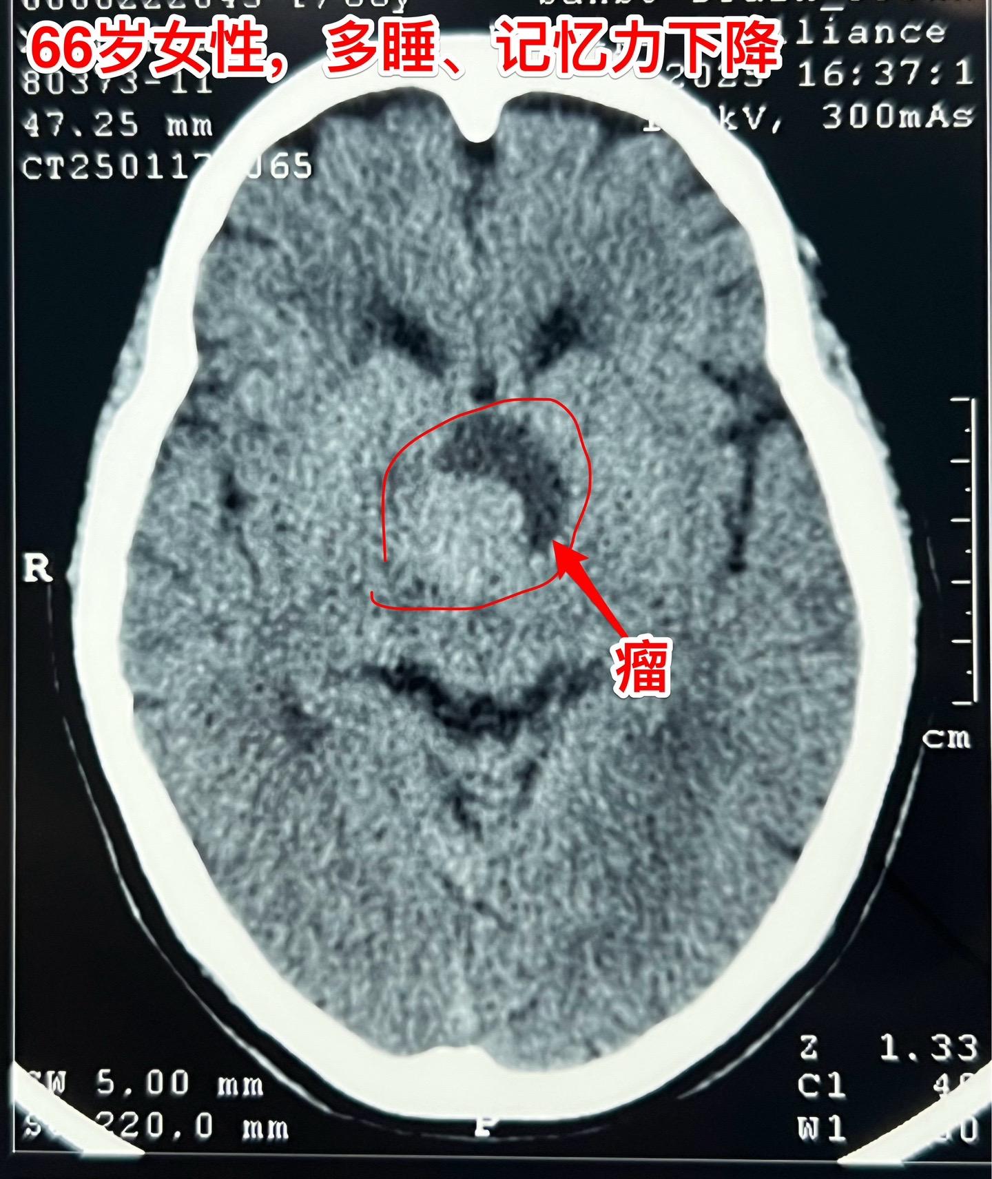 是颅咽管瘤吗?鞍区肿瘤的定性诊断是很难的。66岁女性,泰州人。因为多睡、记忆力下降在外院检查脑部发现脑部肿瘤。病人的多睡症状越来越严重。肿瘤位于鞍上区域,而且伴有脑积水。外院怀疑是颅咽管瘤?或者是别的肿瘤?