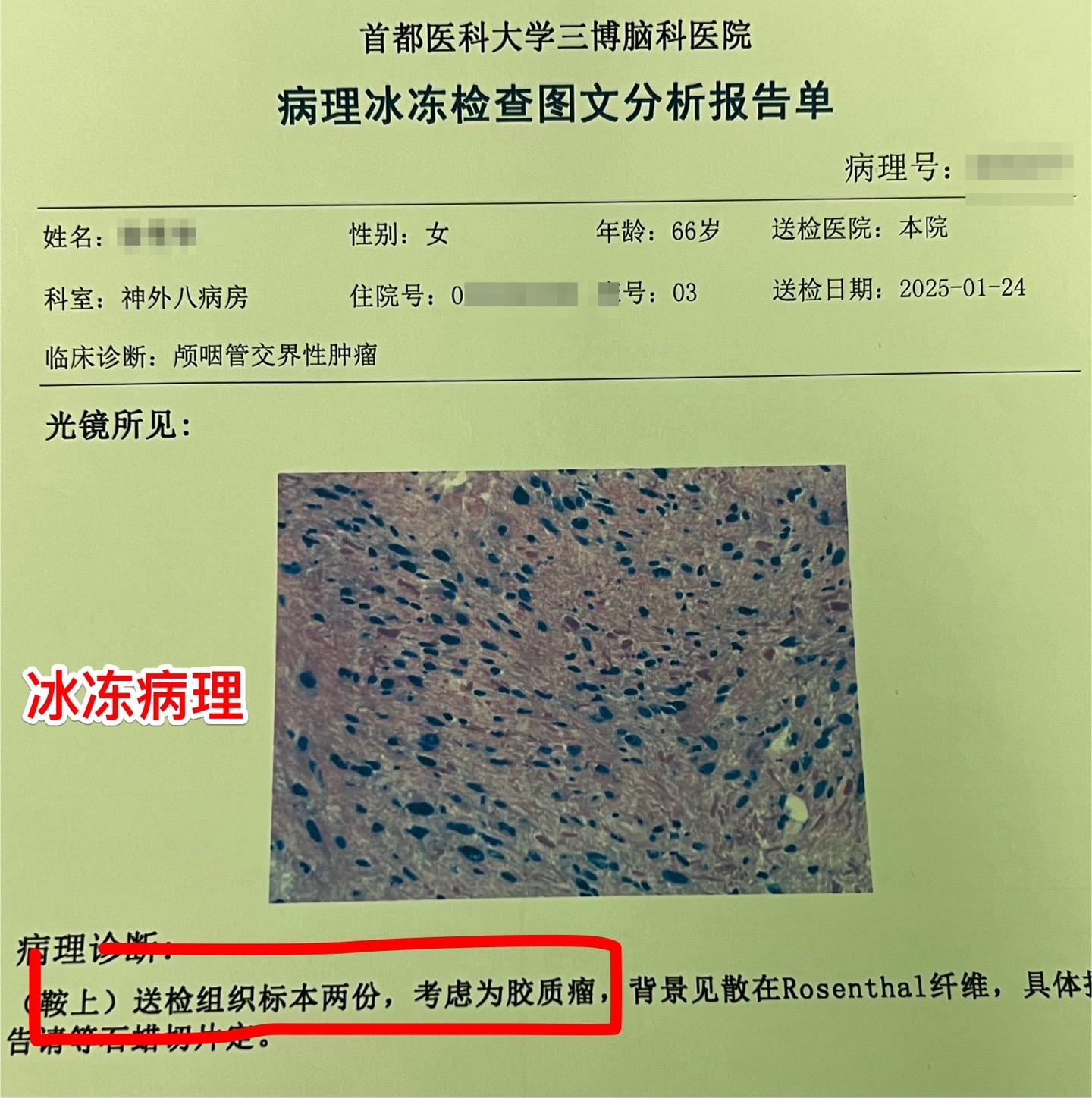 1月24日作了开颅手术(这是我科春节前的最后一个择期手术),手术中发现肿瘤的性状不符合乳头型颅咽管瘤,分两次取标本送快速冰冻病理检查,报告考虑是胶质瘤。