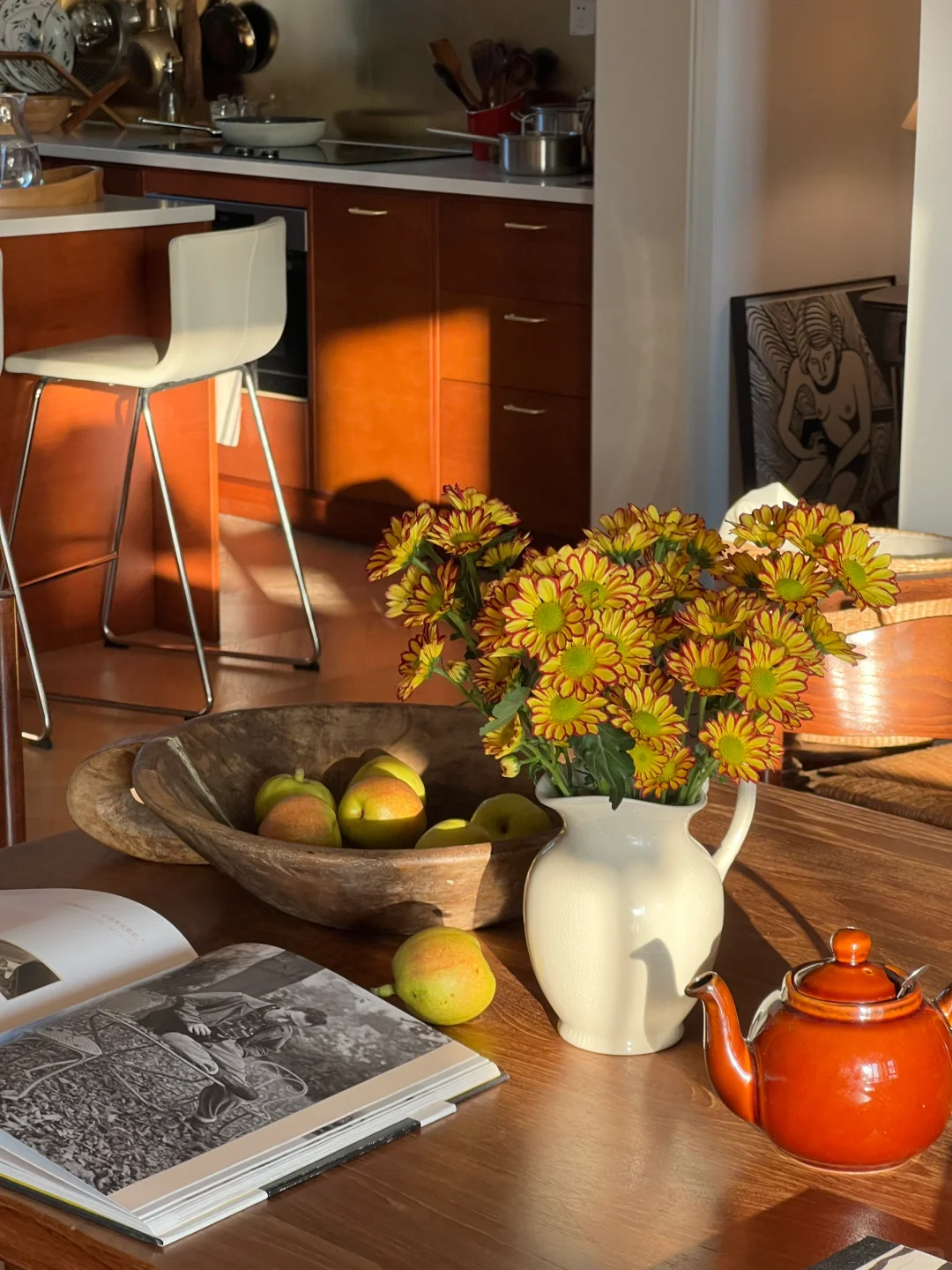 喜欢被用旧的东西,尤其是木质的。樱桃木的书柜橱柜,柚木的餐桌,黄杨木的餐边柜,还有一些我也搞不清是什么木的家具,都比新的时候更有生命力了。 / 尤其是柚木的餐桌,很适合旧旧的样子。把油脂、墨汁和时间都吃进了它的纹路里。过年回来,又给它上了一层木蜡油,看起来更温润了。 / 放上一瓶野菊,就像从大地上开出花来。 .