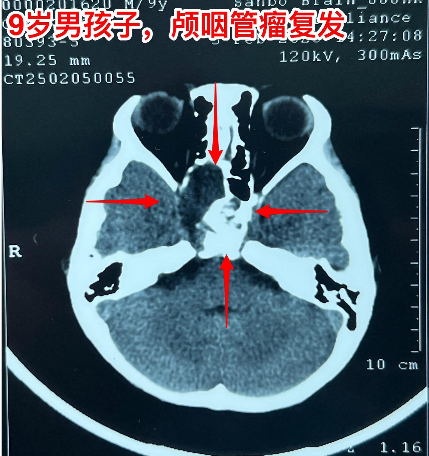 九岁男孩子颅咽管瘤复发,肿瘤生长快。南阳市男孩子2年半前曾经作了一次手术,2024年2月复查磁共振显示垂体窝内无肿瘤复发,鞍背骨质内有可疑异常信号。2025年1月复查磁共振即显示肿瘤复发而且直径达4厘米,患儿家长不敢相信肿瘤居然长得这么快!正月初八患儿即来住院,复查磁共振及CT见图。