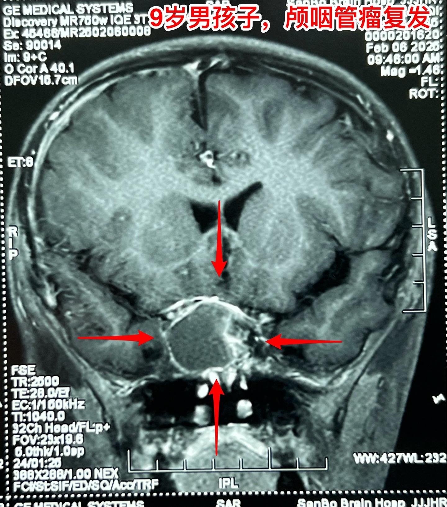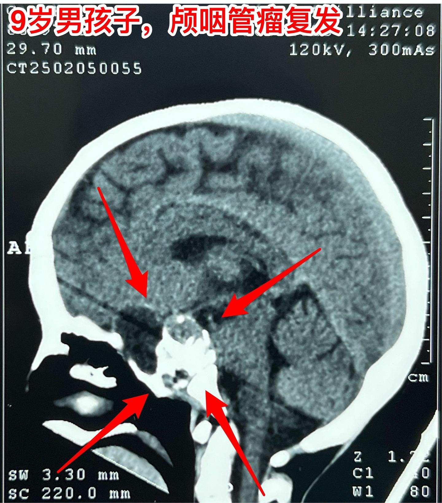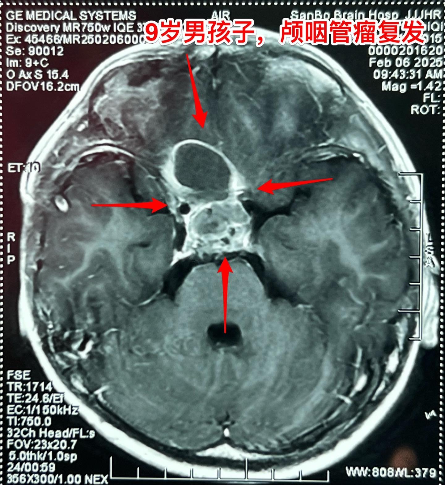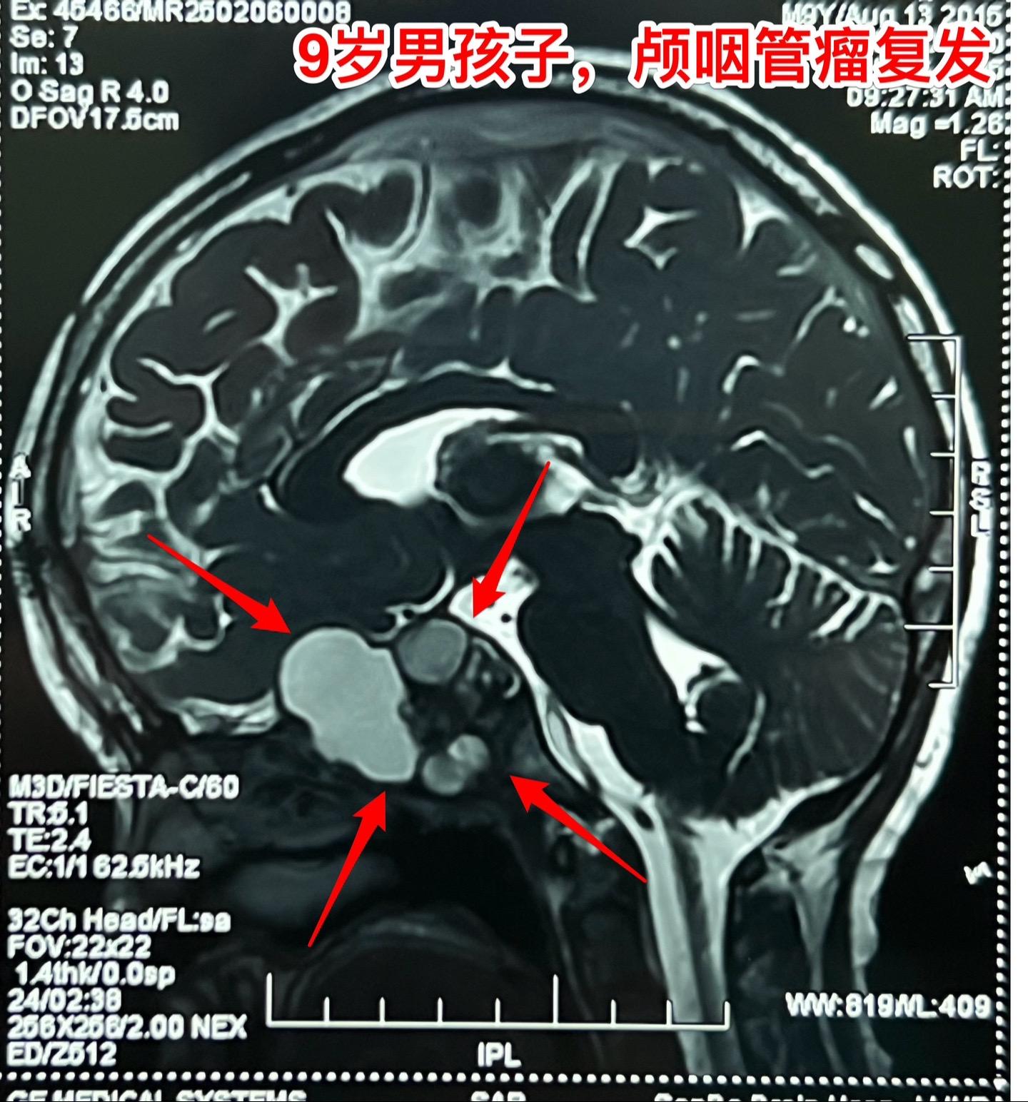 九岁男孩子颅咽管瘤复发,肿瘤生长快。南阳市男孩子2年半前曾经作了一次手...