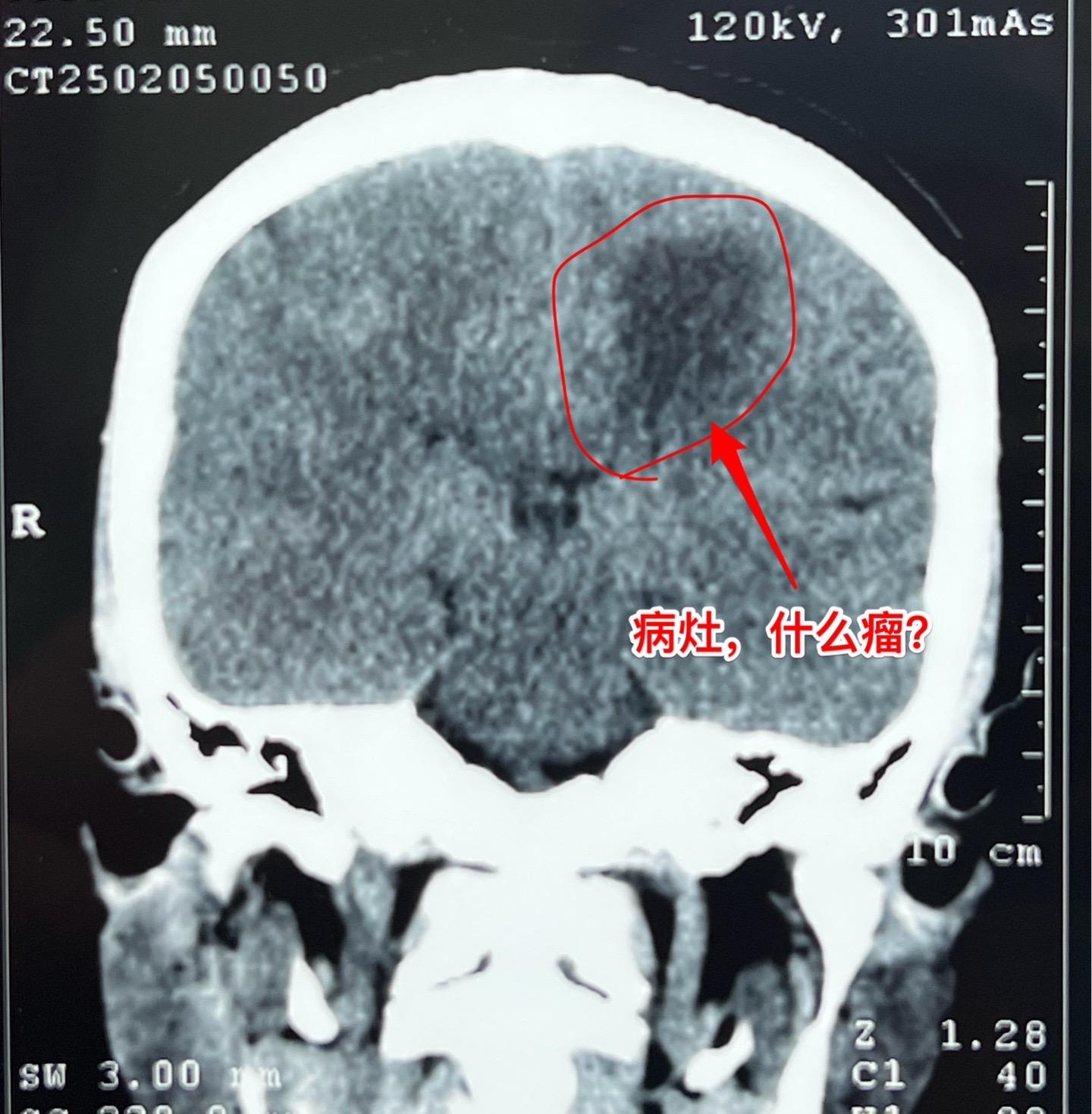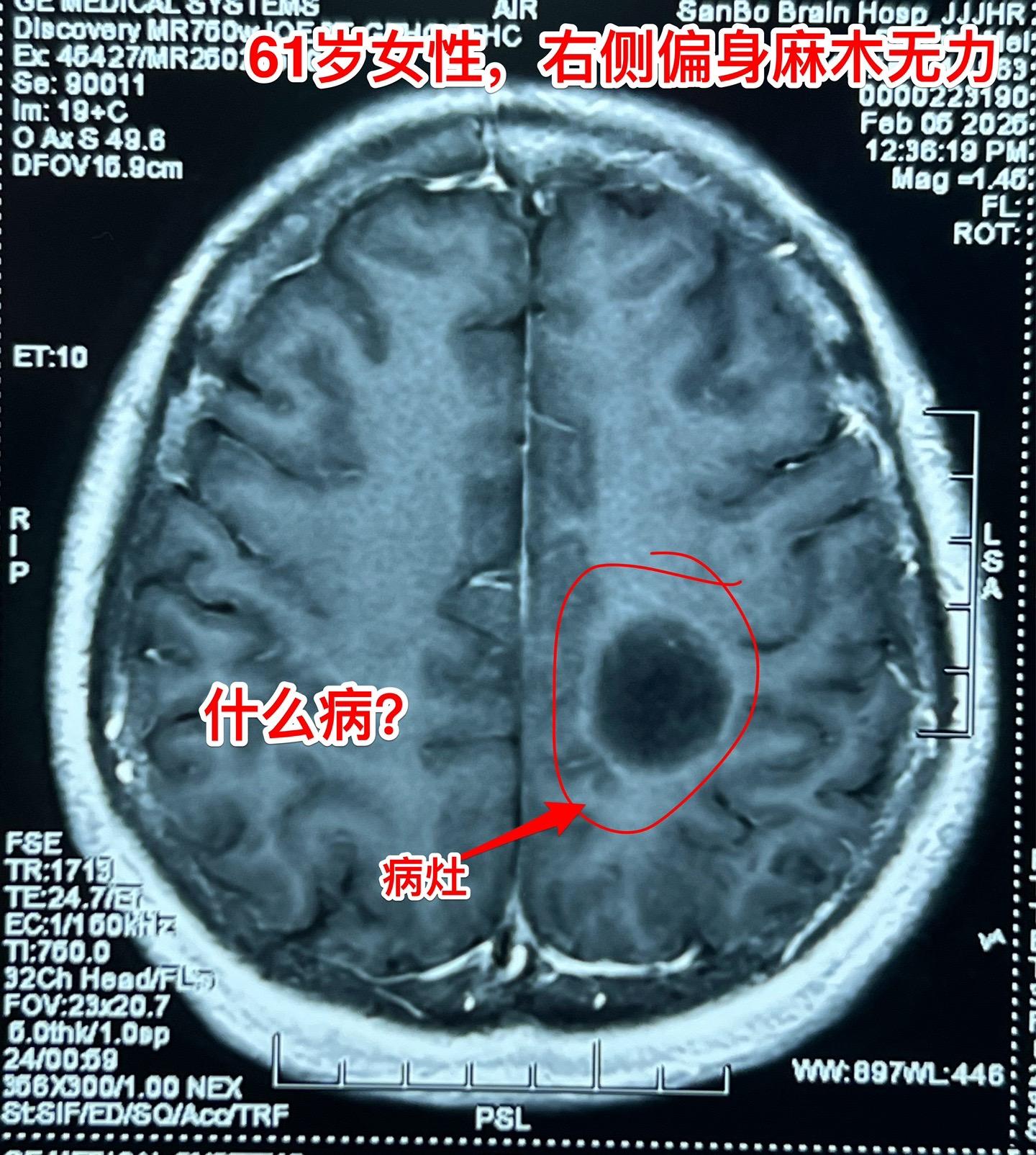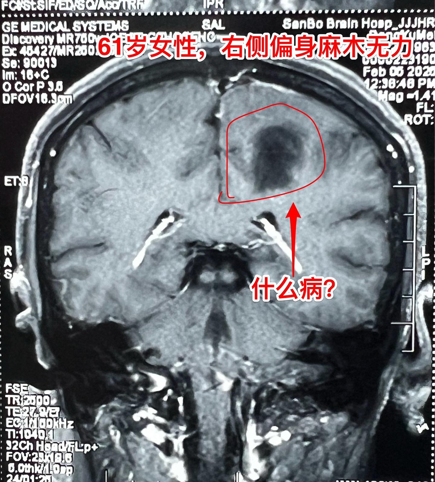 今天介绍一个病人,61岁女性,因右侧偏身麻木无力来看病。CT和磁共振显示左侧中央区有个病灶,见图。怀疑是胶质瘤?