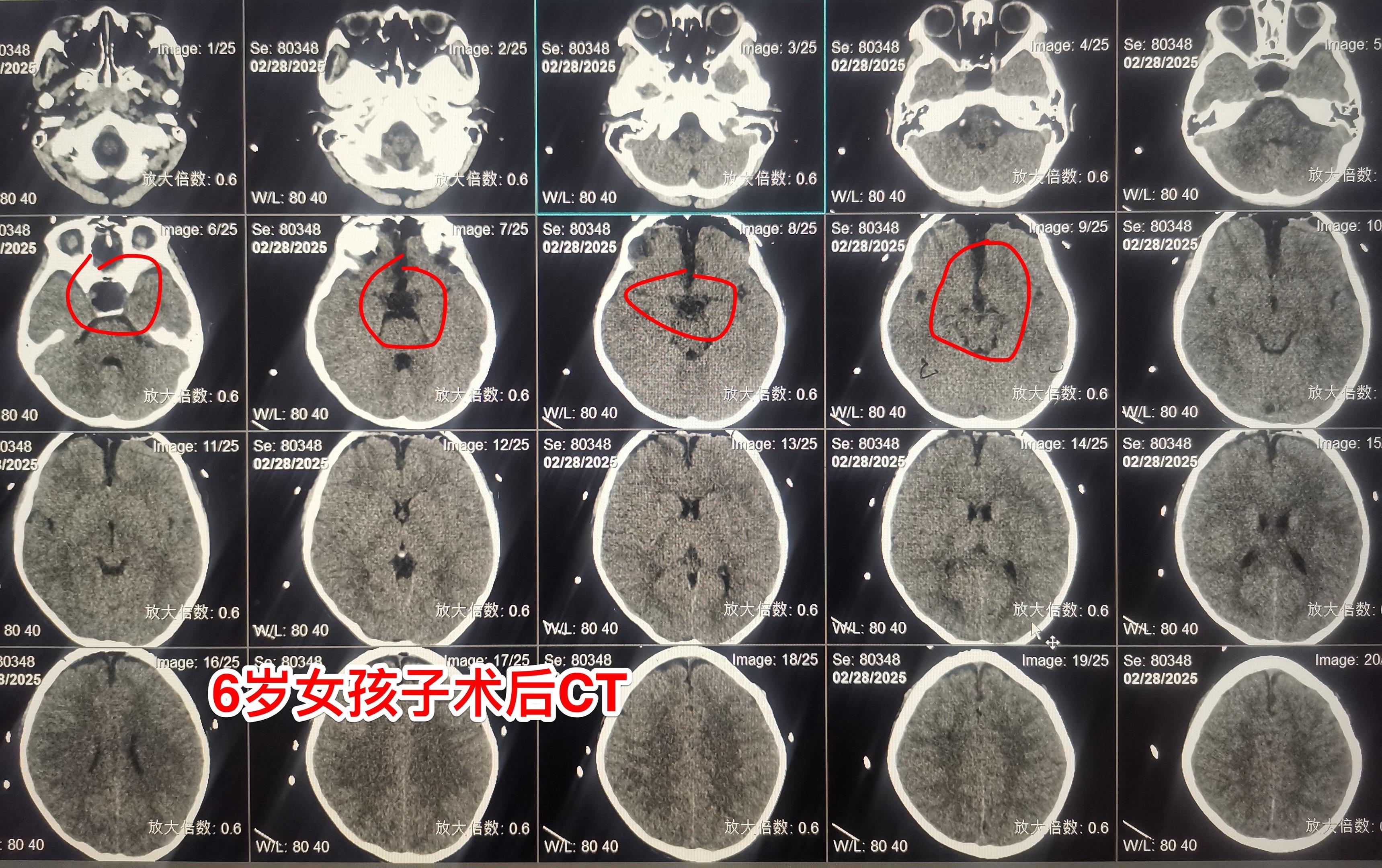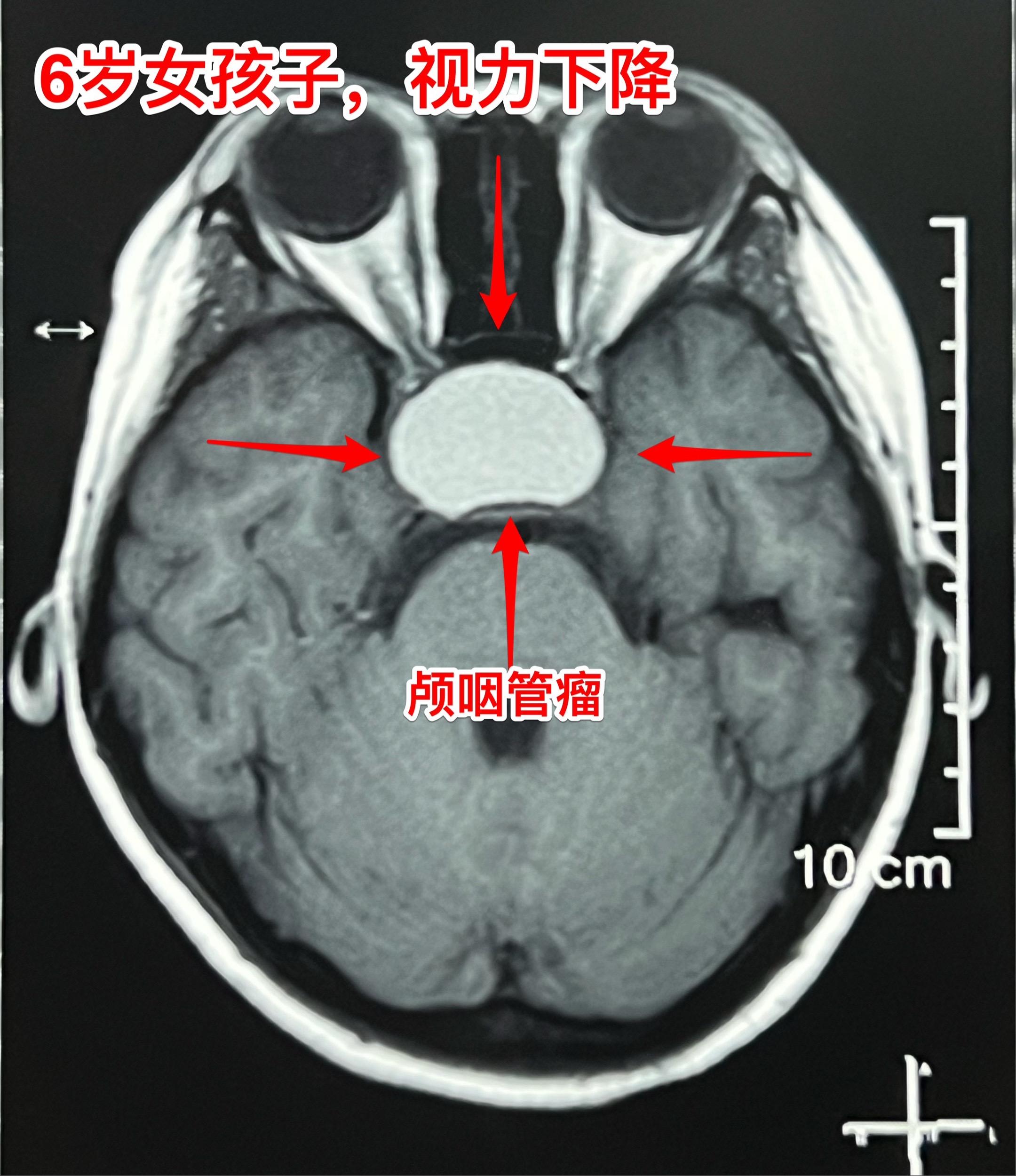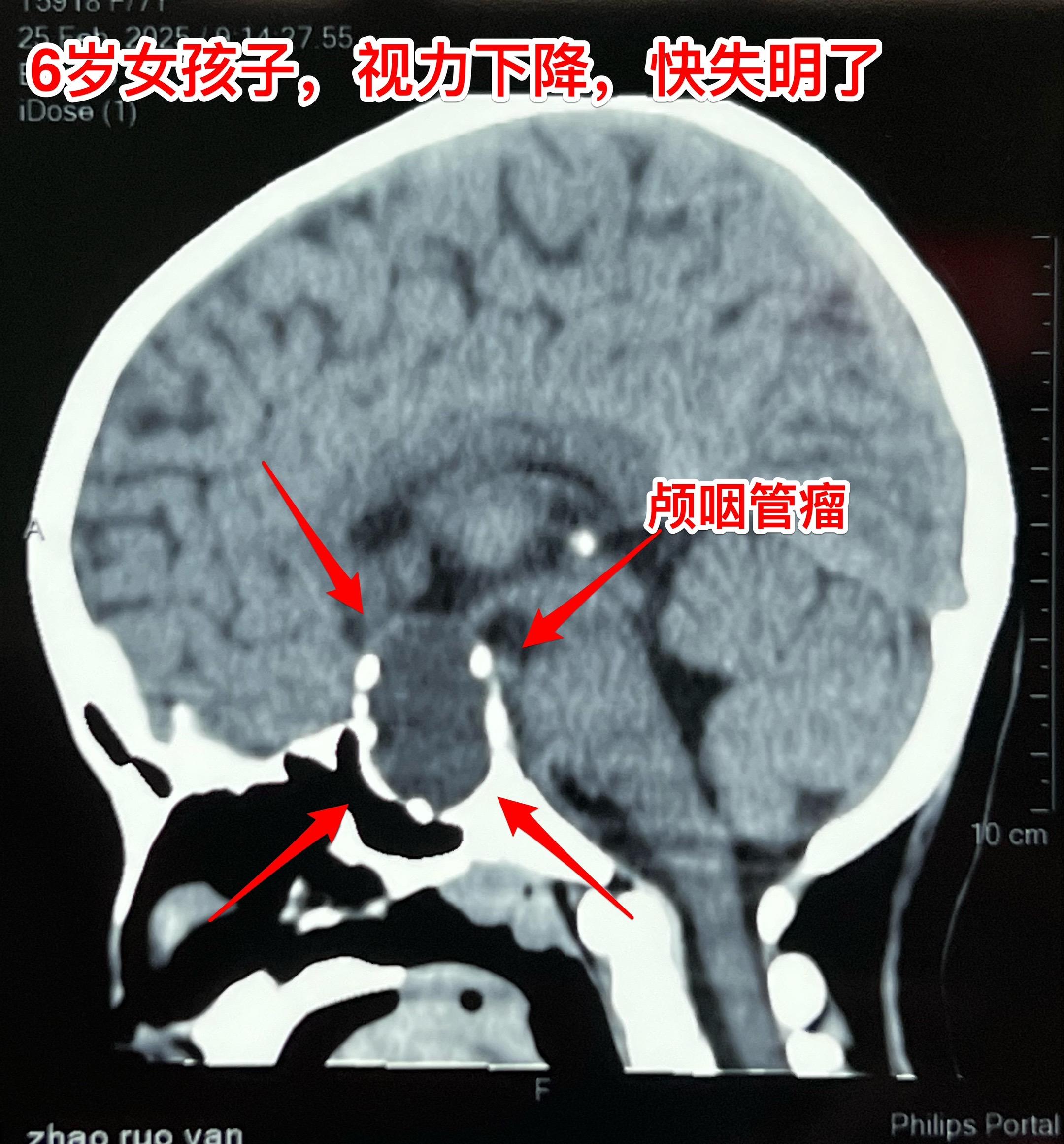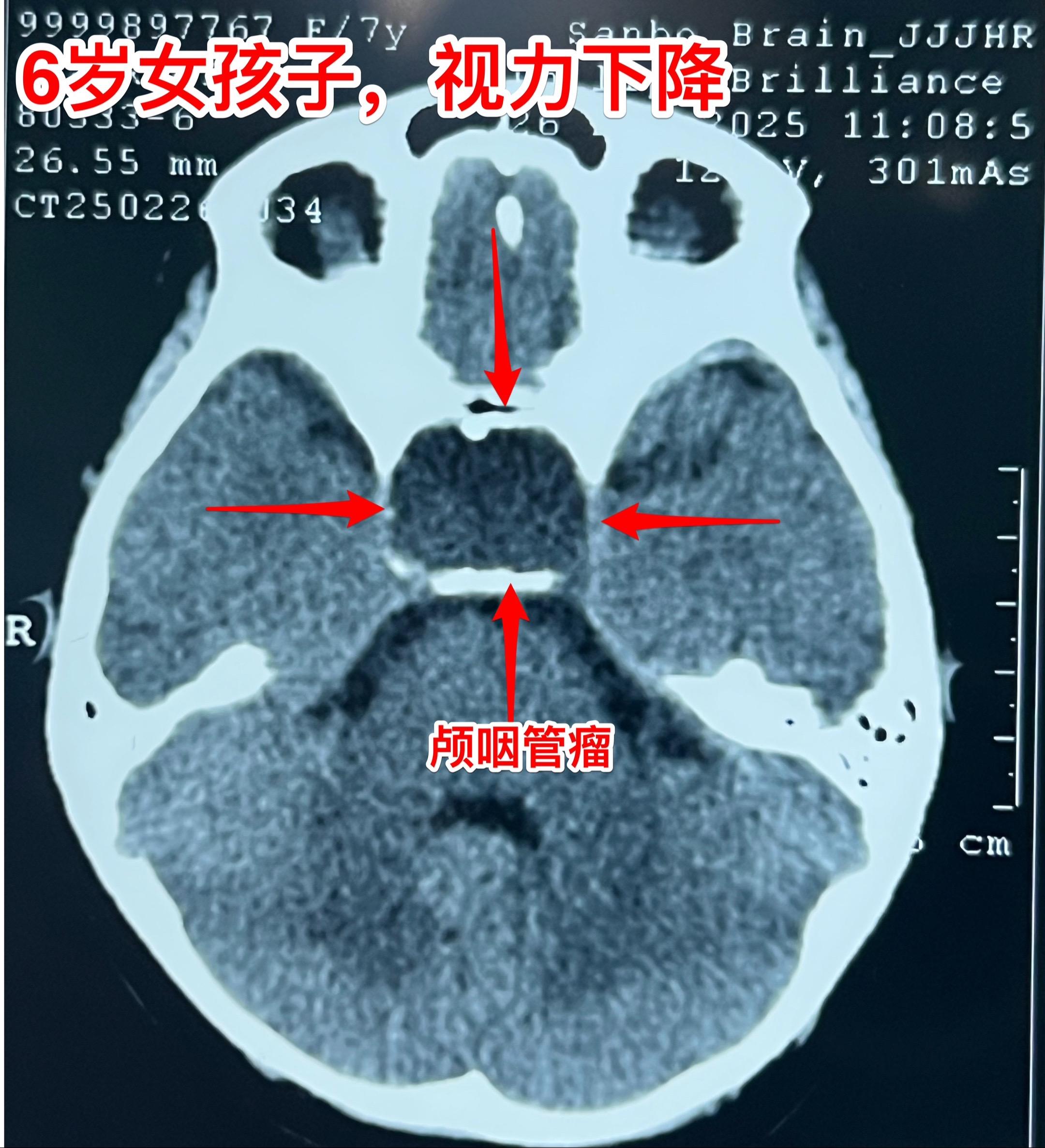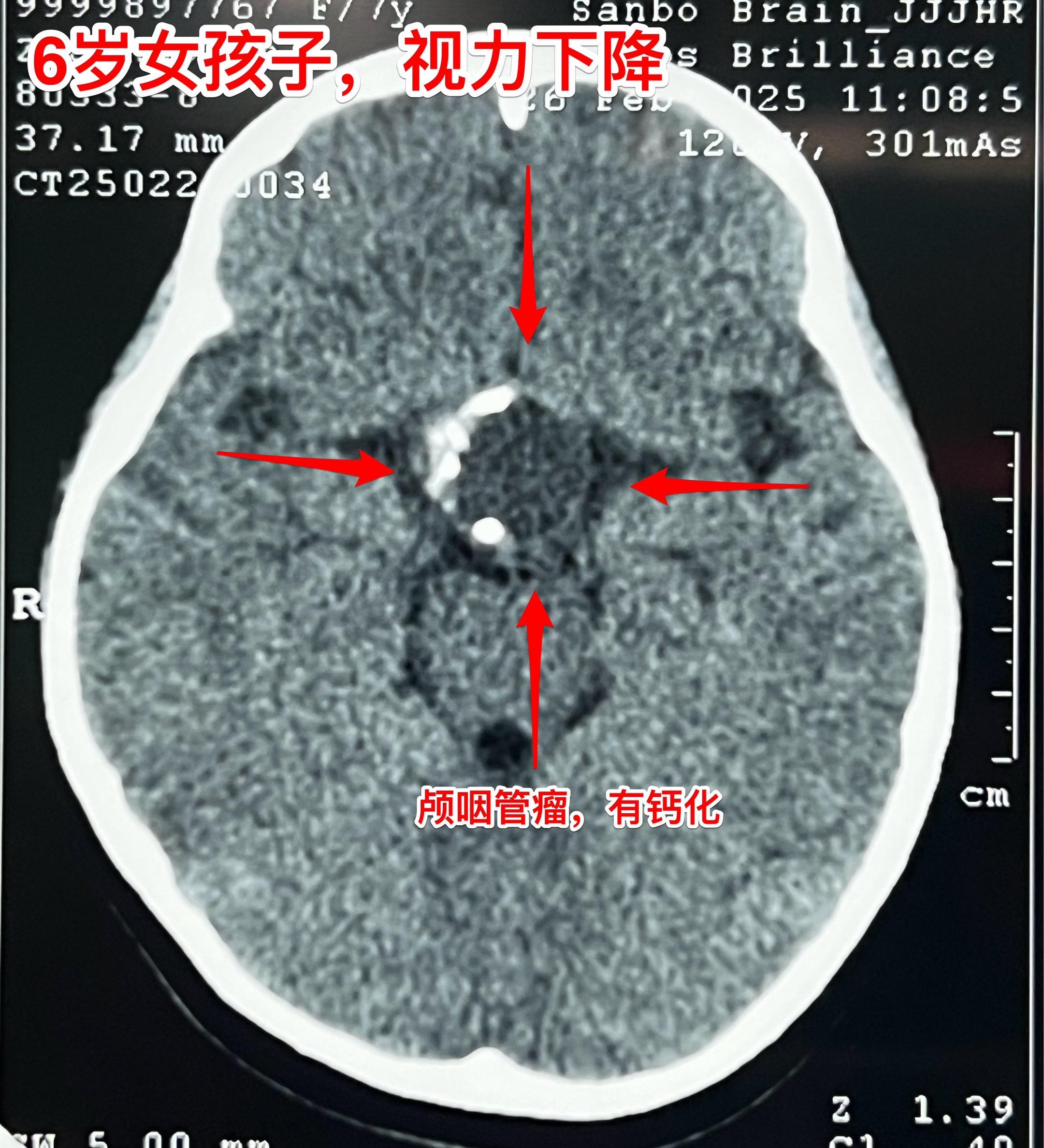 2月23日行磁共振检查,发现鞍区肿瘤。3月25日行CT检查,发现肿瘤有钙化,可以确诊