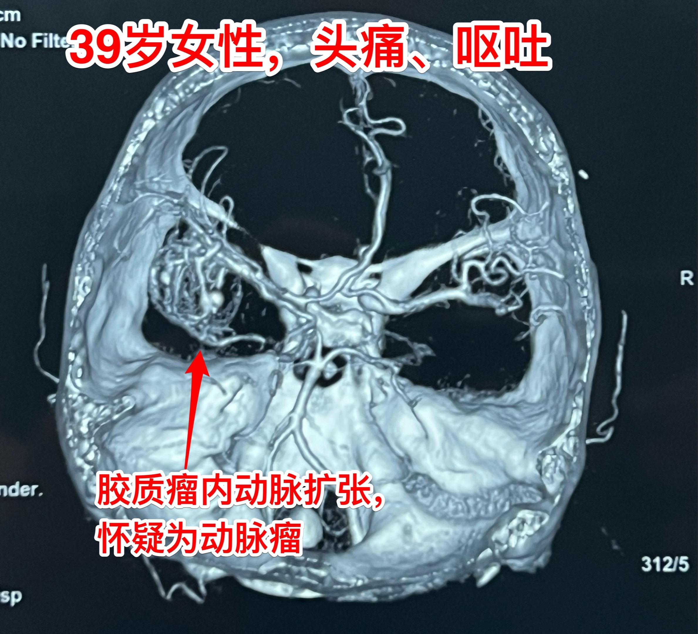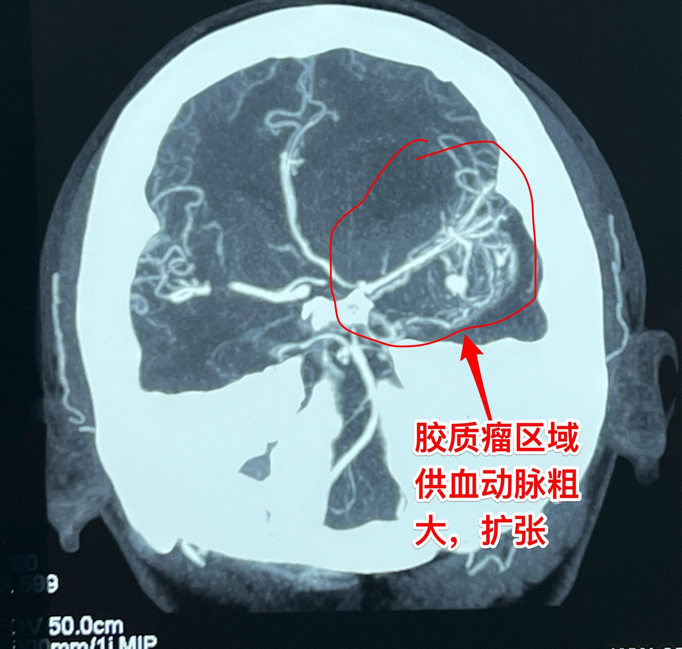 第2个病人是大同市女性,39岁,因头痛、呕吐到医院检查发现左侧脑部肿瘤,考虑为高级别胶质瘤。这个胶质瘤内血管粗大、扩张 怀疑有动脉瘤,是个血供十分丰富的肿瘤。术中看见肿瘤内血管粗大,像动脉瘤一样扩张,肿瘤呈暗红色,质地较韧,血供丰富