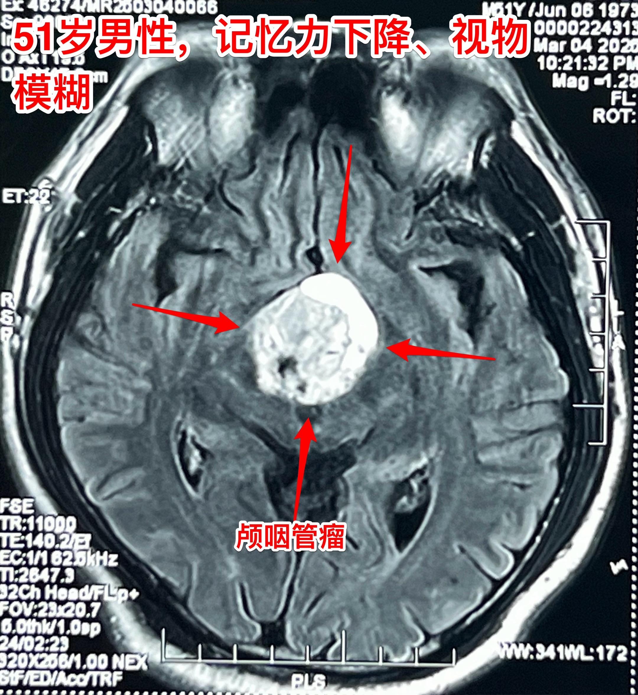 昨日一个颅咽管瘤手术+一个胶质瘤手术。昨日第一个手术:51岁男性,卡车司机,因记忆力下降、视物模糊检查发现颅咽管瘤,见图。肿瘤主体位于第三脑室内,实性肿瘤,有小块钙化斑。术中见肿瘤呈肉乎乎的,有细小钙化斑。肿瘤完全切除,垂体柄保留约40%。术后CT未见术区出血。