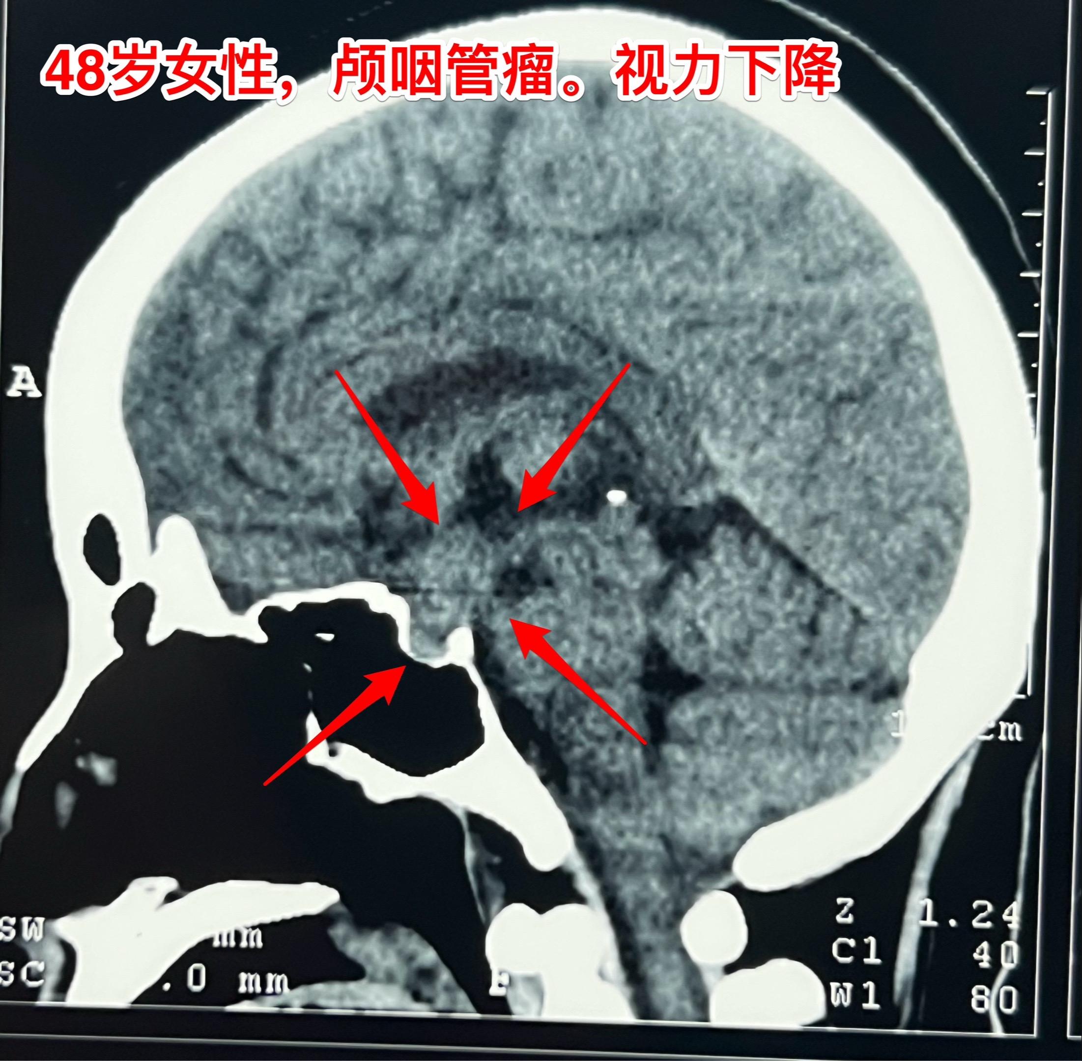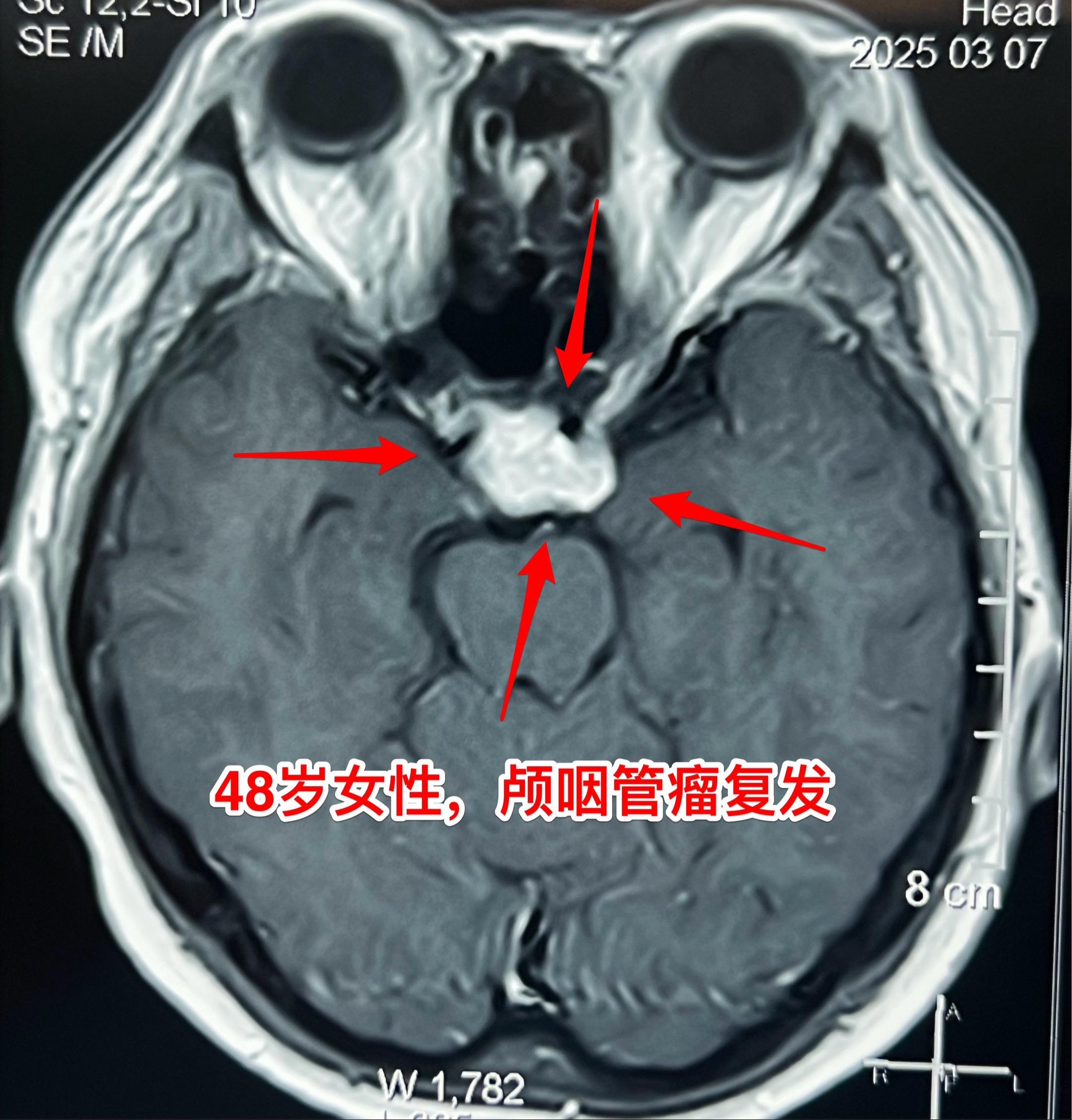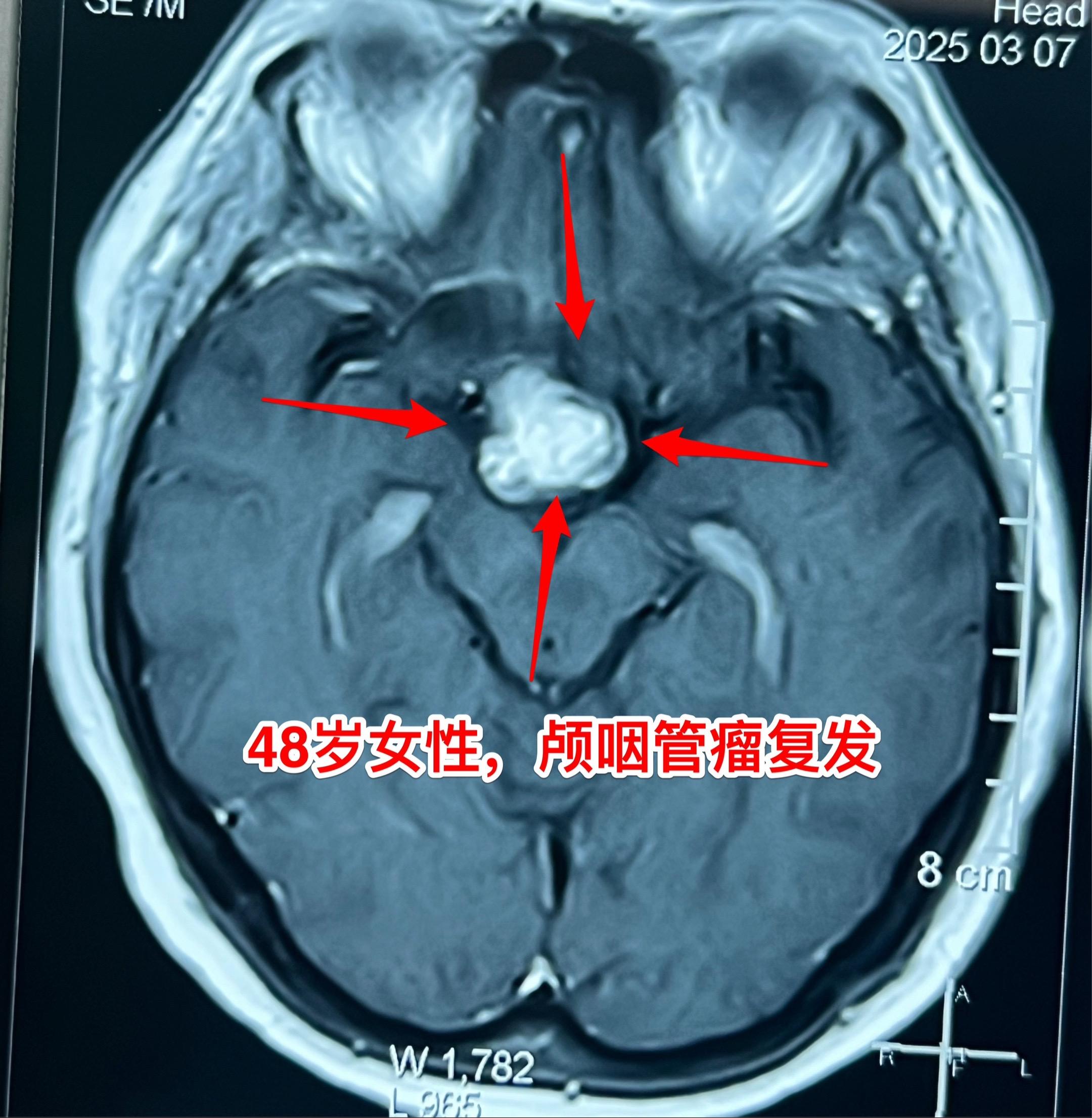 今天的第二个颅咽管瘤手术。48岁女性,洛阳市人。因颅咽管瘤先后行经鼻手术和开颅手术各一次。开颅手术是在24年12月作的,手术后又出现右眼视力下降,复查磁共振显示肿瘤复发,见图。