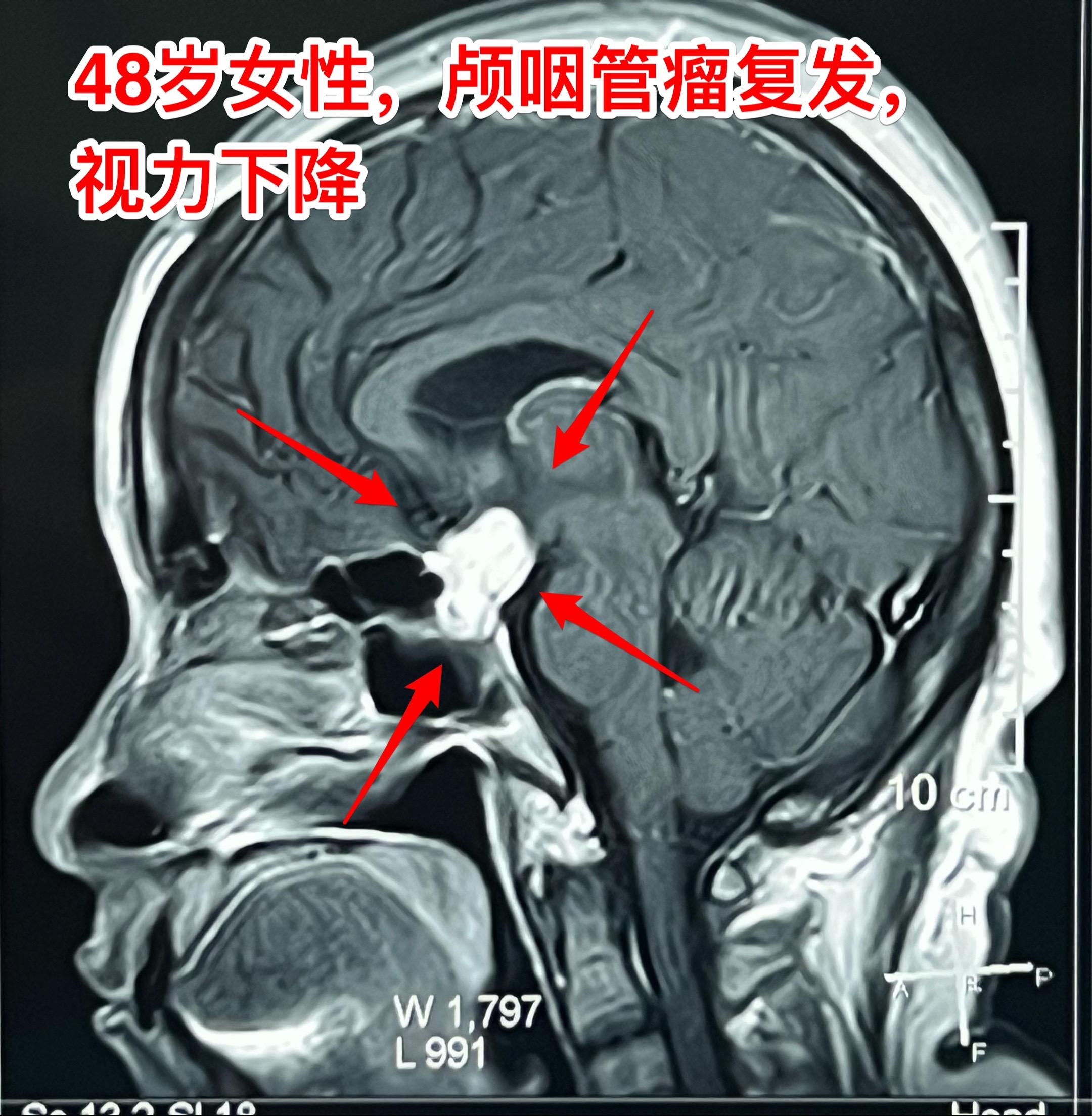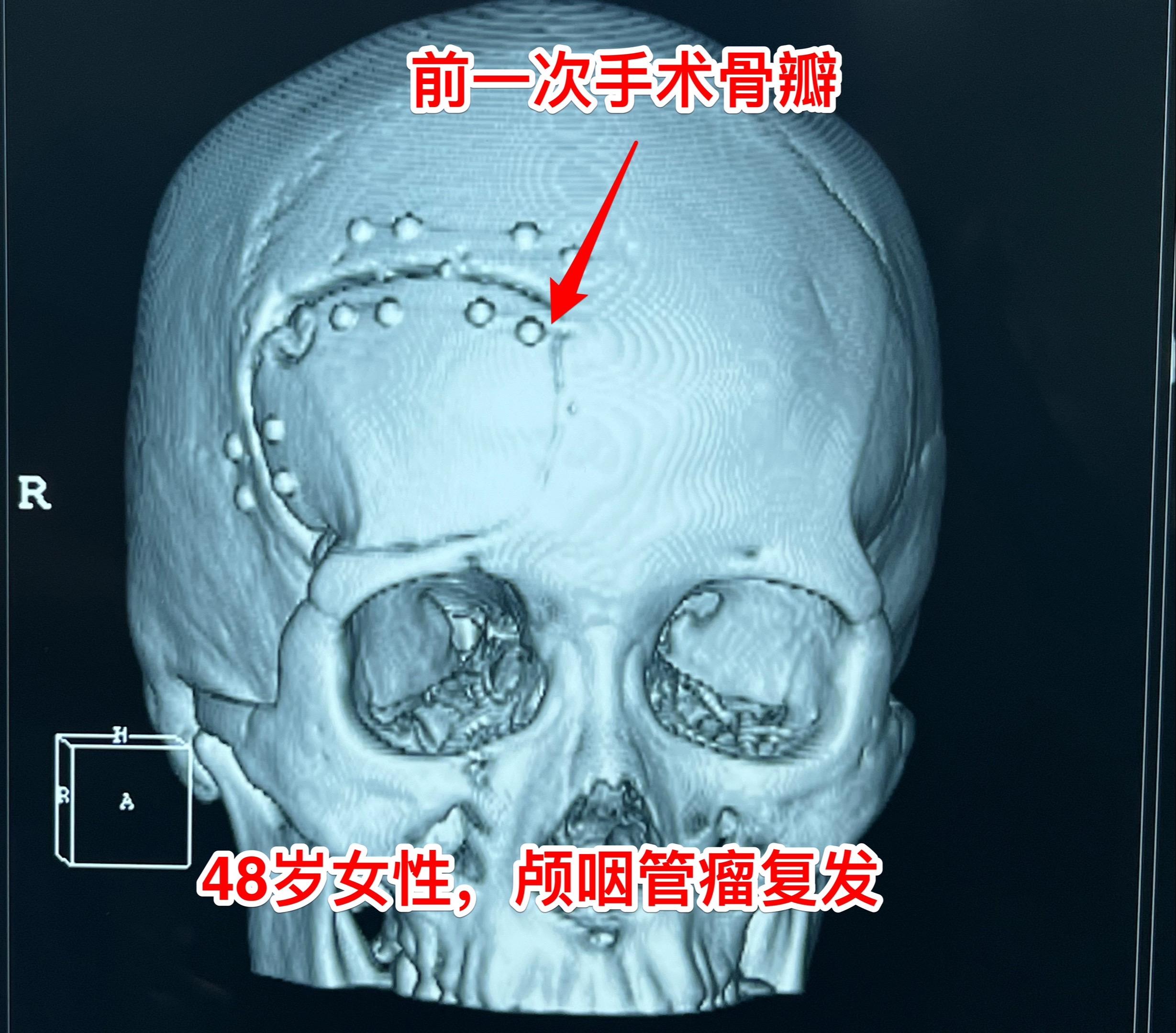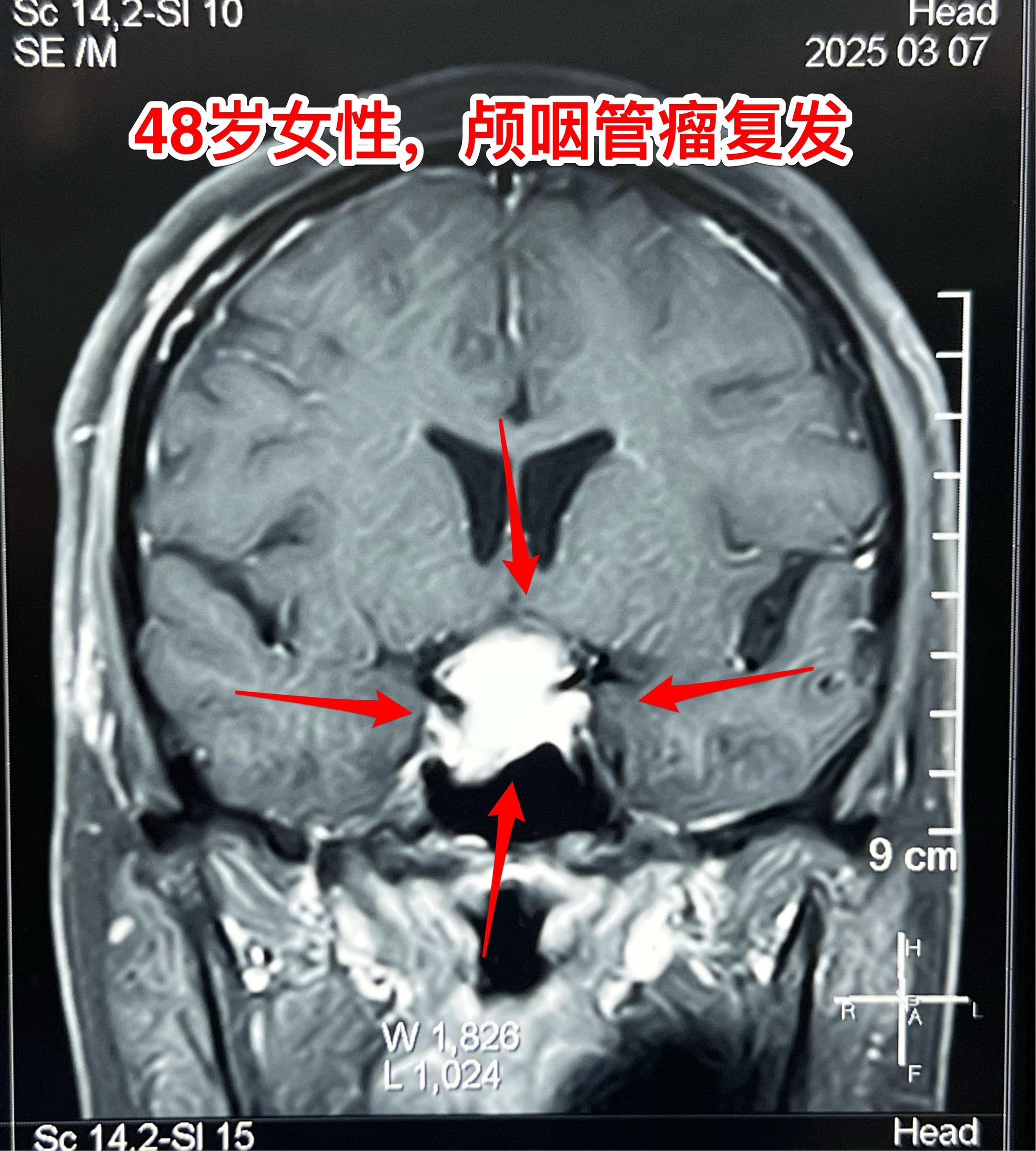 今天的第二个颅咽管瘤手术。48岁女性,洛阳市人。因颅咽管瘤先后行经鼻手术和开颅手术各一次。开颅手术是在24年12月作的,手术后又出现右眼视力下降,复查磁共振显示肿瘤复发,见图。
