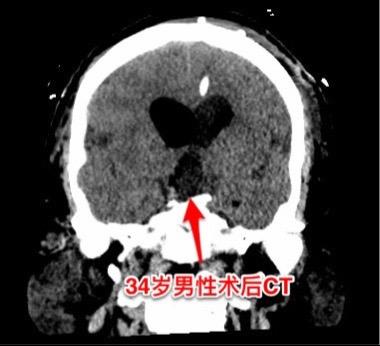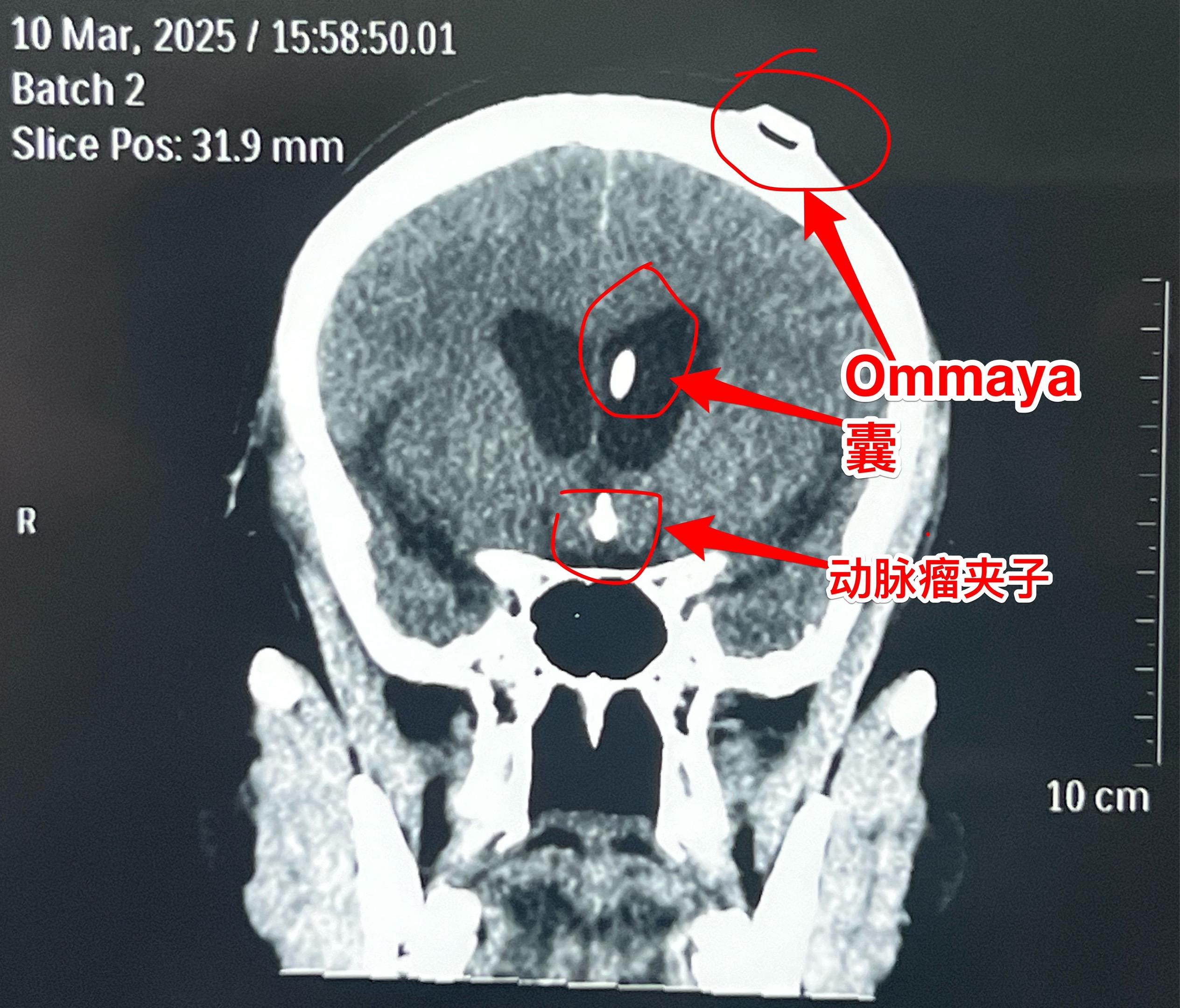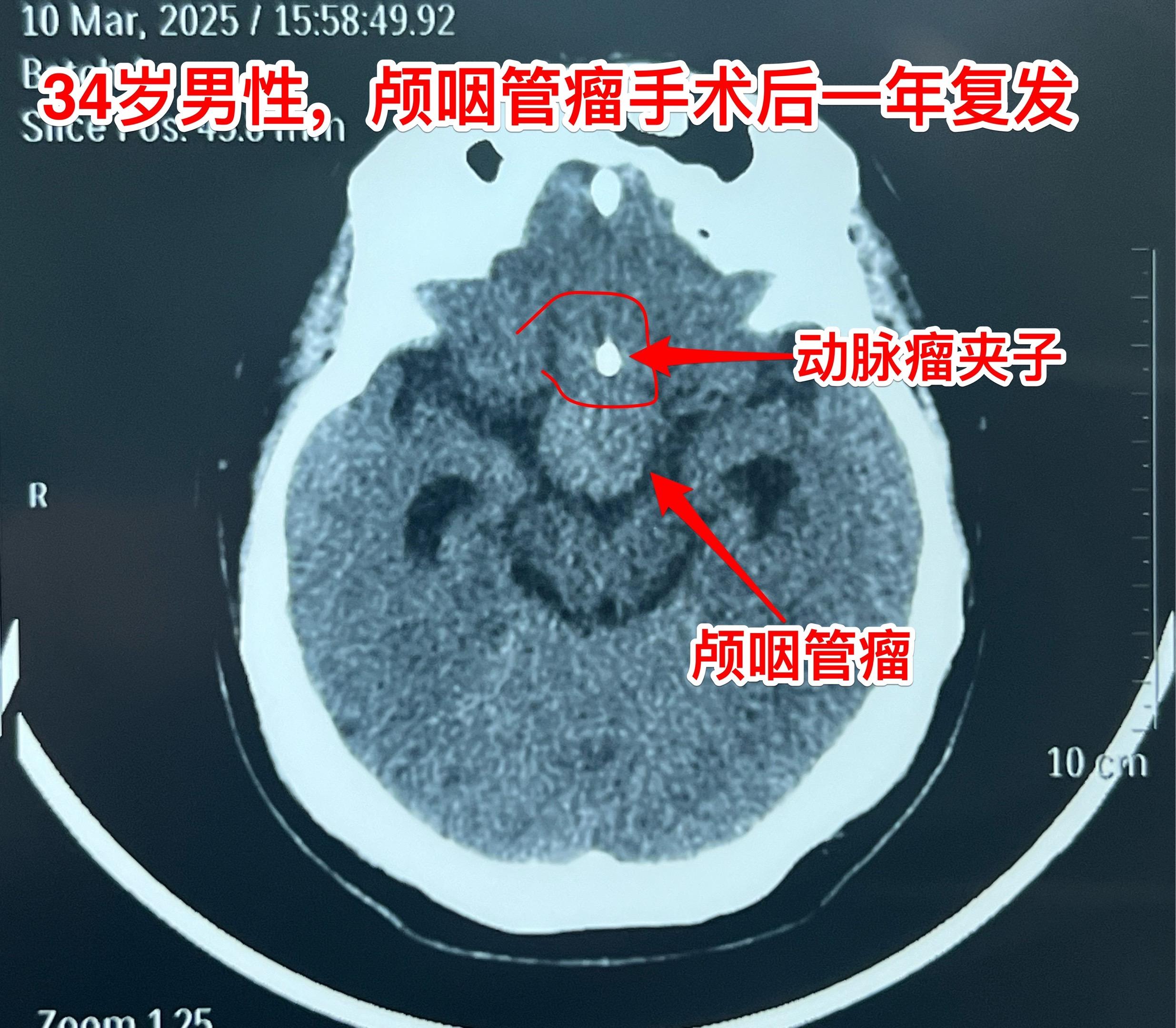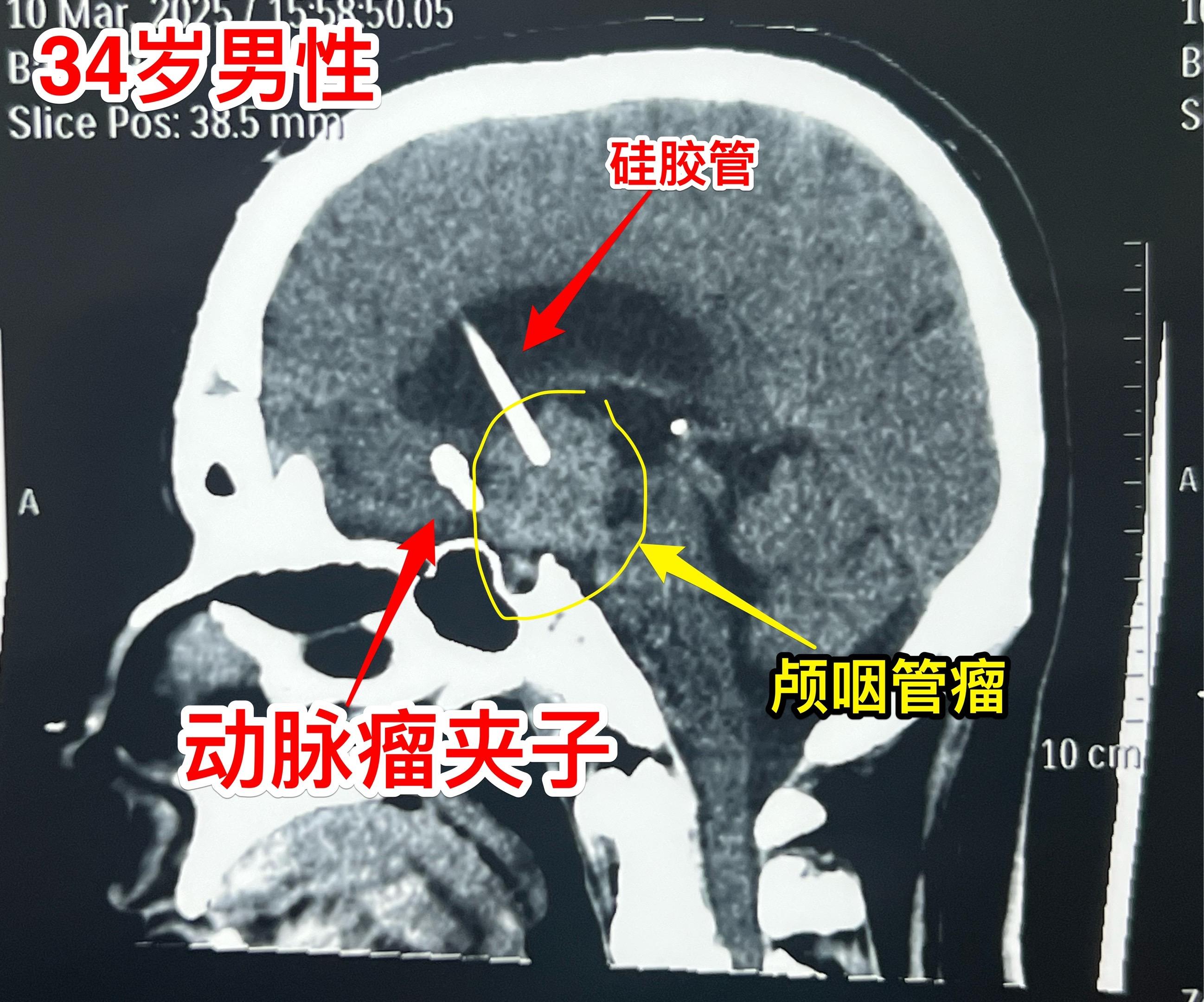 第一次手术后病理报告考虑是乳头型颅咽管瘤和造釉型颅咽管瘤的混合型(太罕见了)。手术中还留置了一个动脉瘤夹子、一个Ommaya囊。