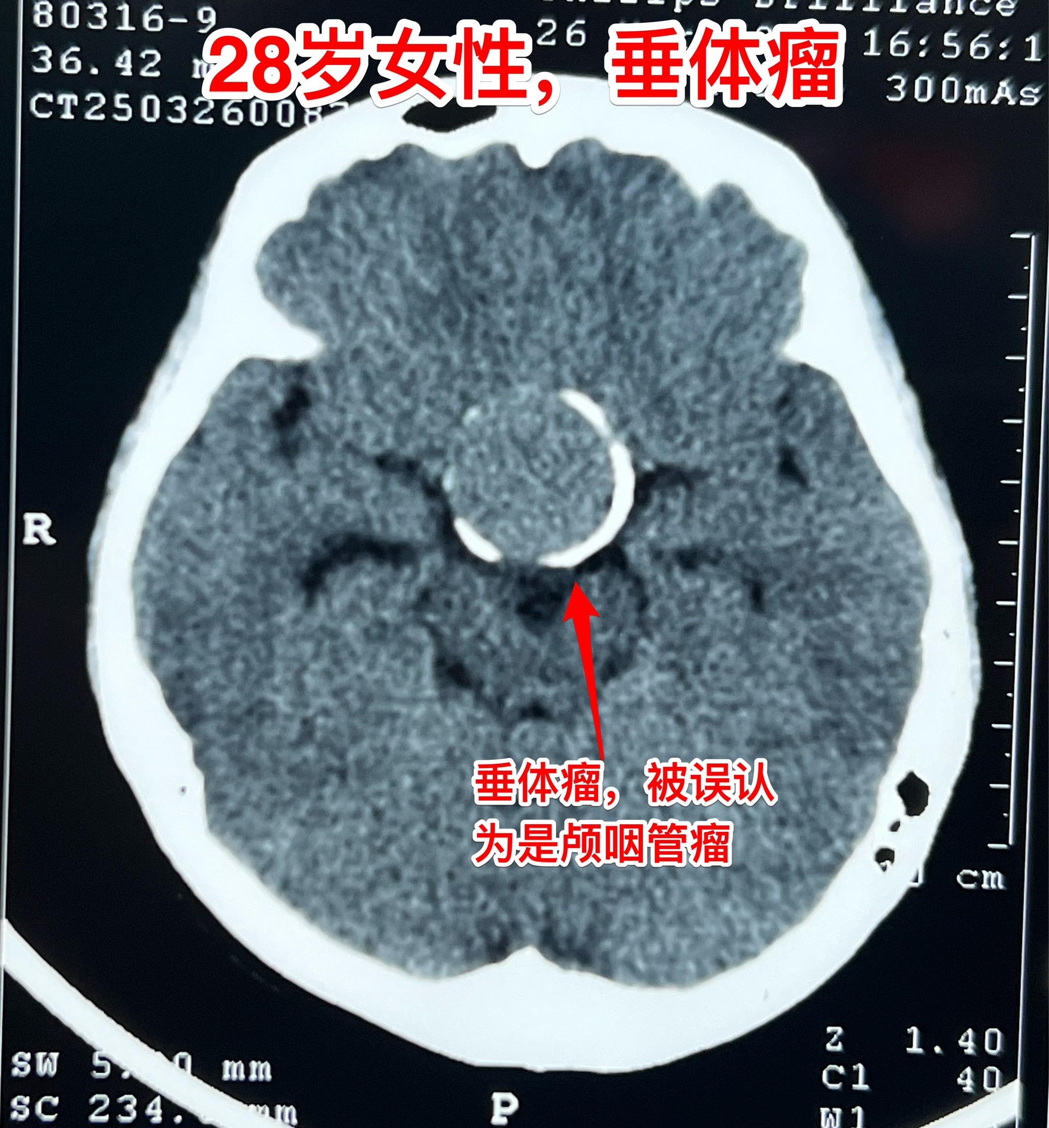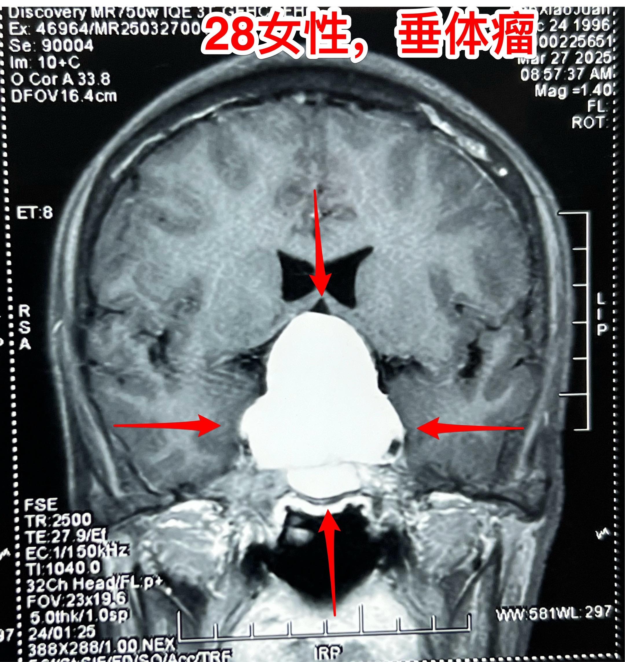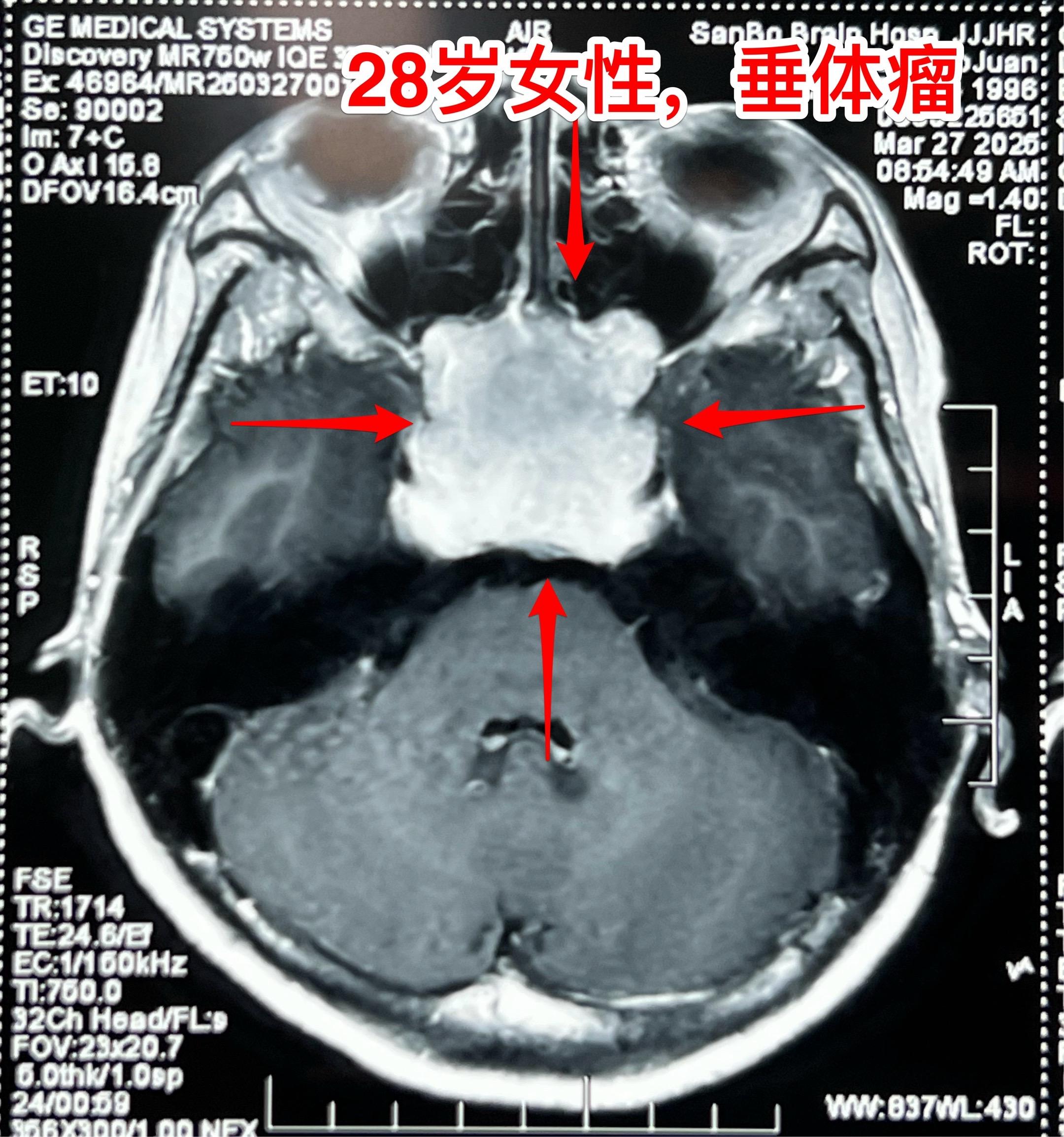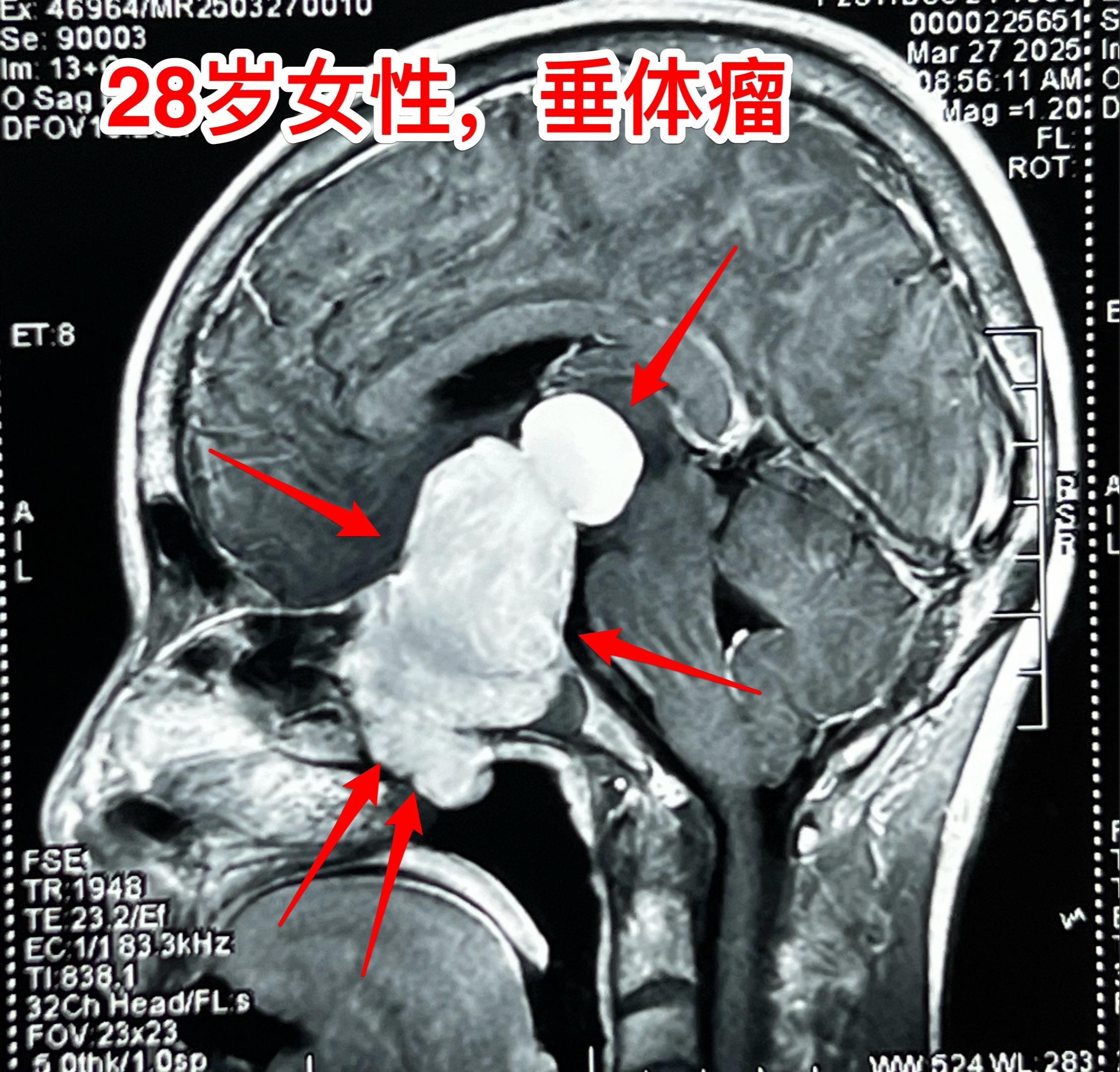 其实这个肿瘤是垂体瘤,肿瘤呈“顶天立地”状。化验激素显示TSH、T3、T4均高于正常,也就是说有甲亢。这是罕见的分泌TSH的垂体腺瘤。病人体重才80多斤!