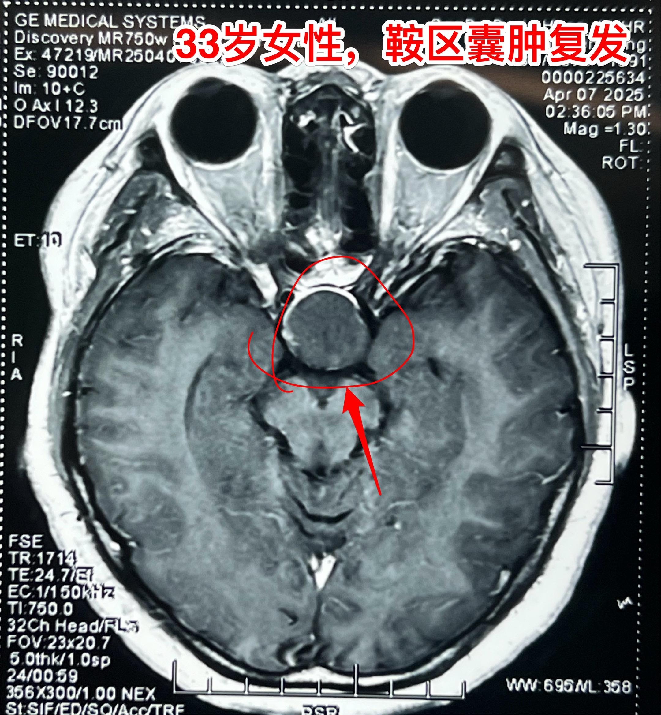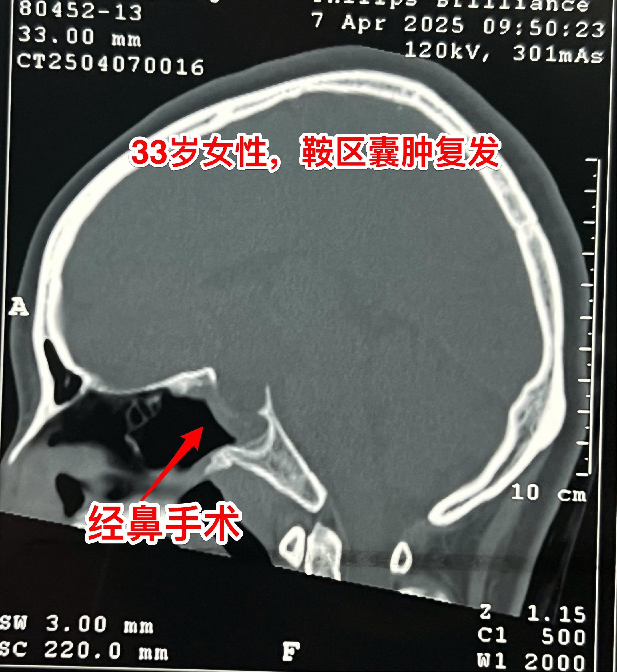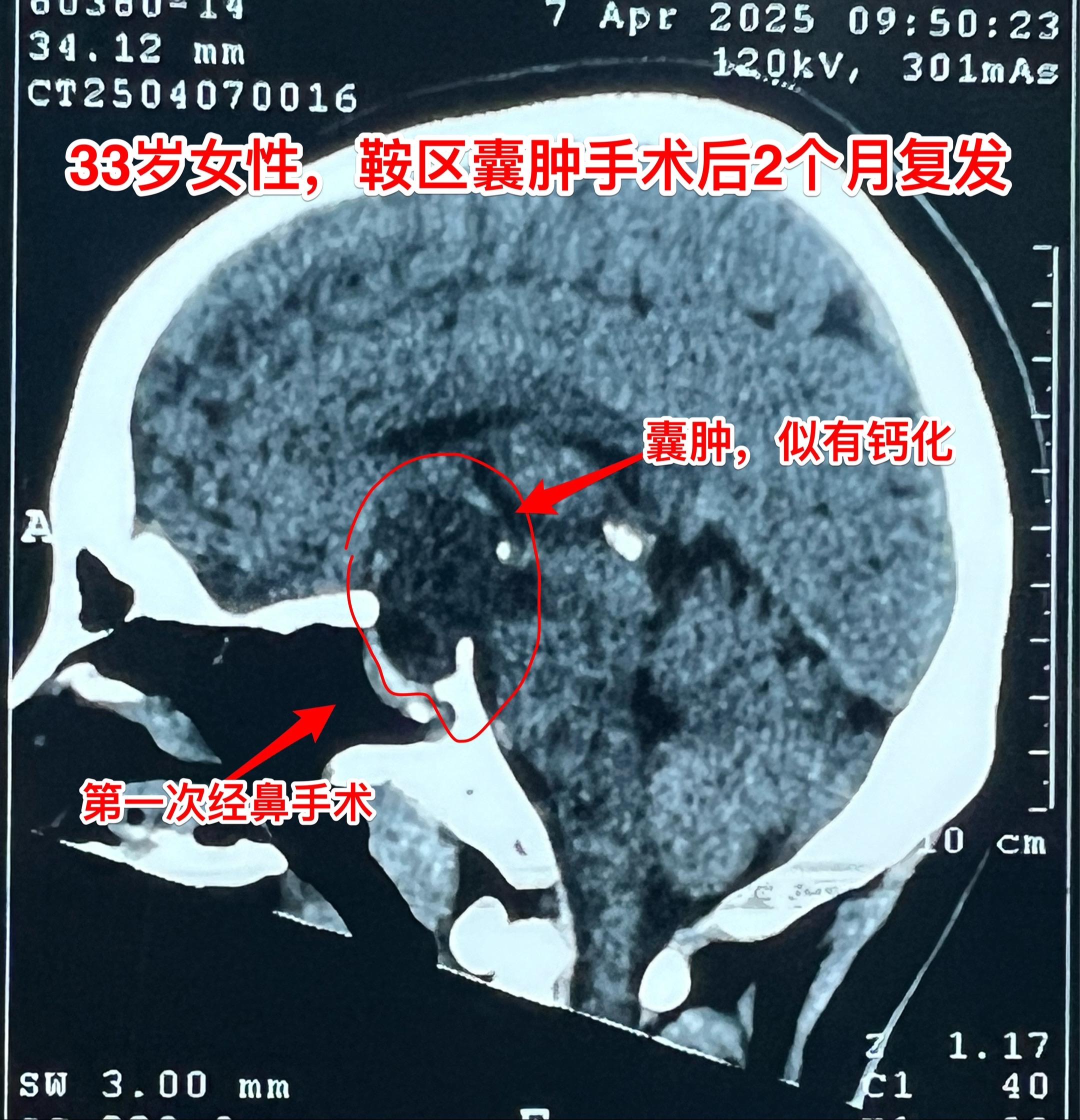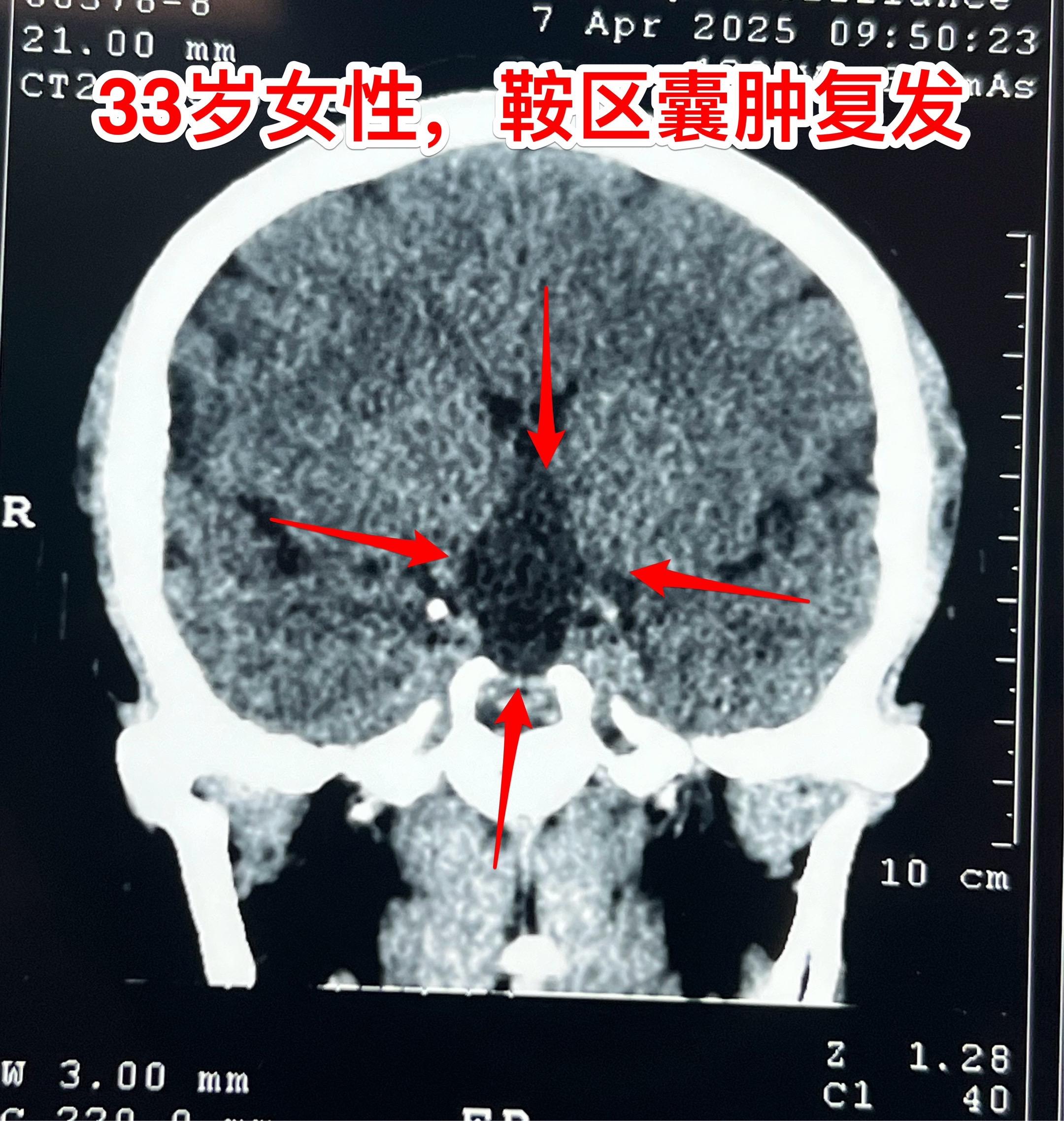 33岁女性鞍区囊肿手术后复发再次手术。这个湖北女性第一次手术是在2025年1月作的经鼻手术,手术后病理报告只看见一些无细胞的结构,没有得出明确的诊断结论(有些遗憾哦)!