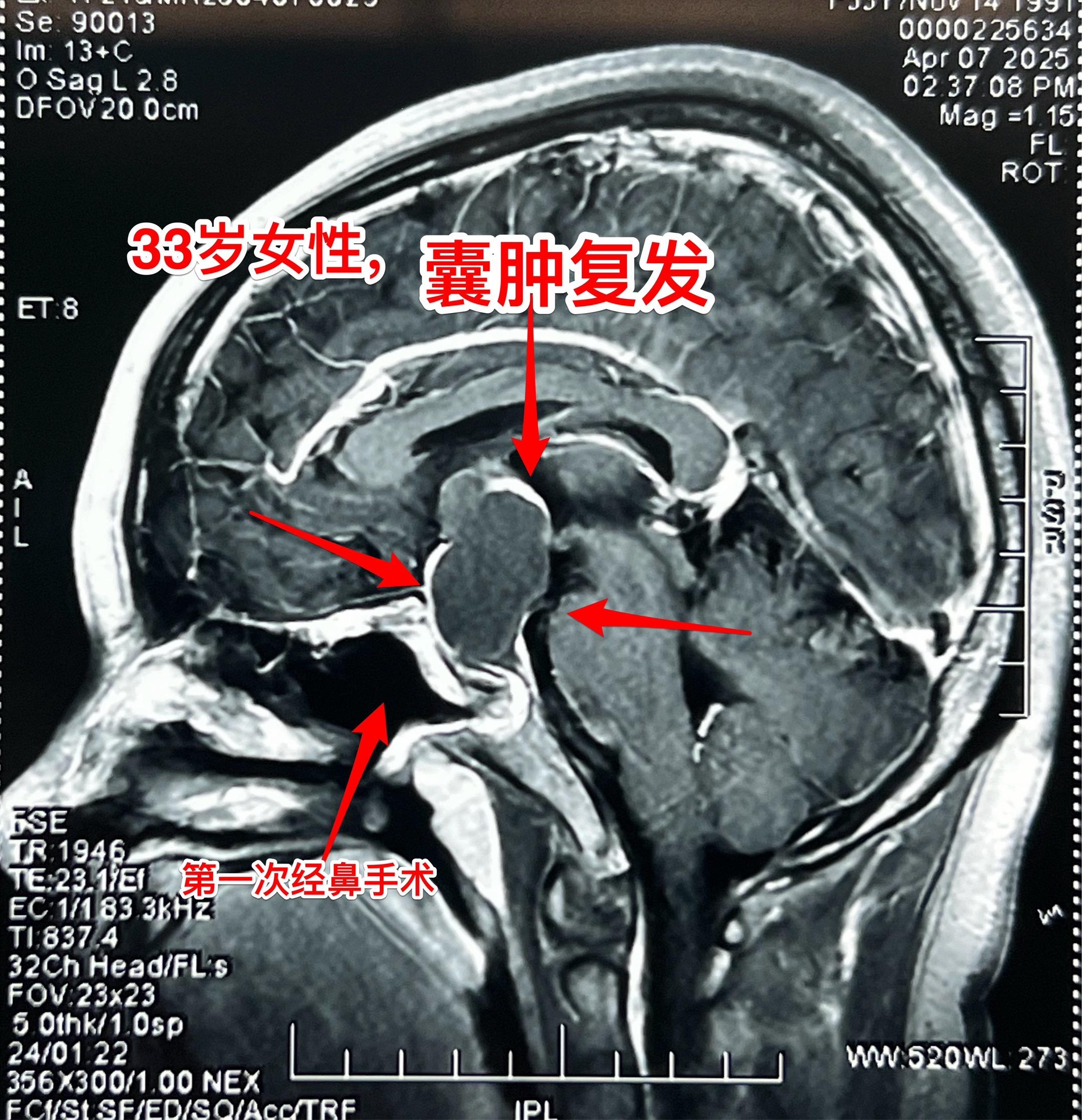 33岁女性鞍区囊肿手术后复发再次手术。这个湖北女性第一次手术是在202...