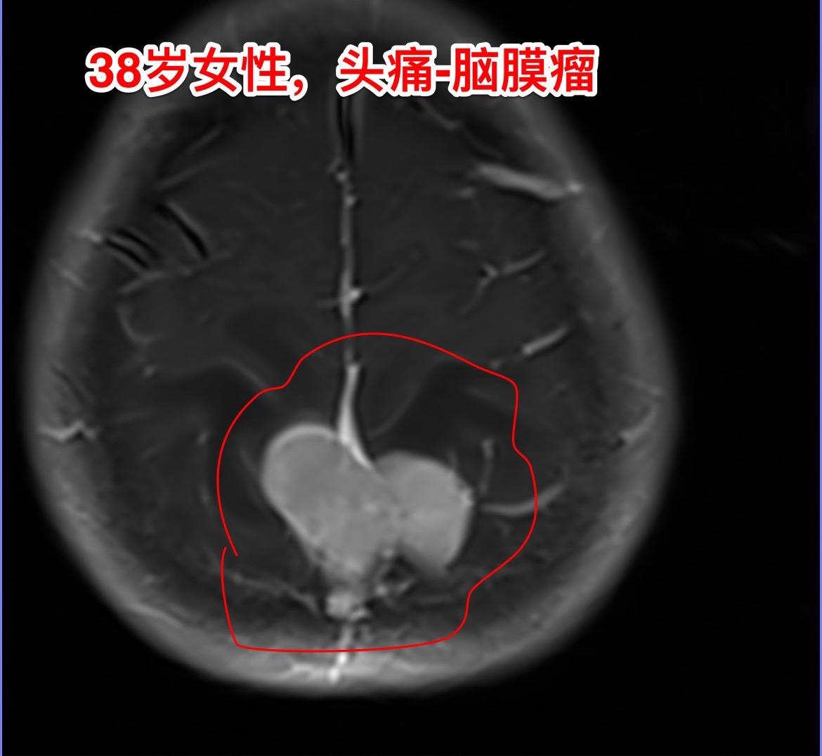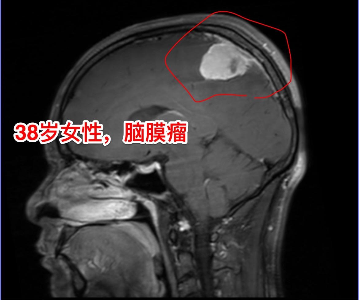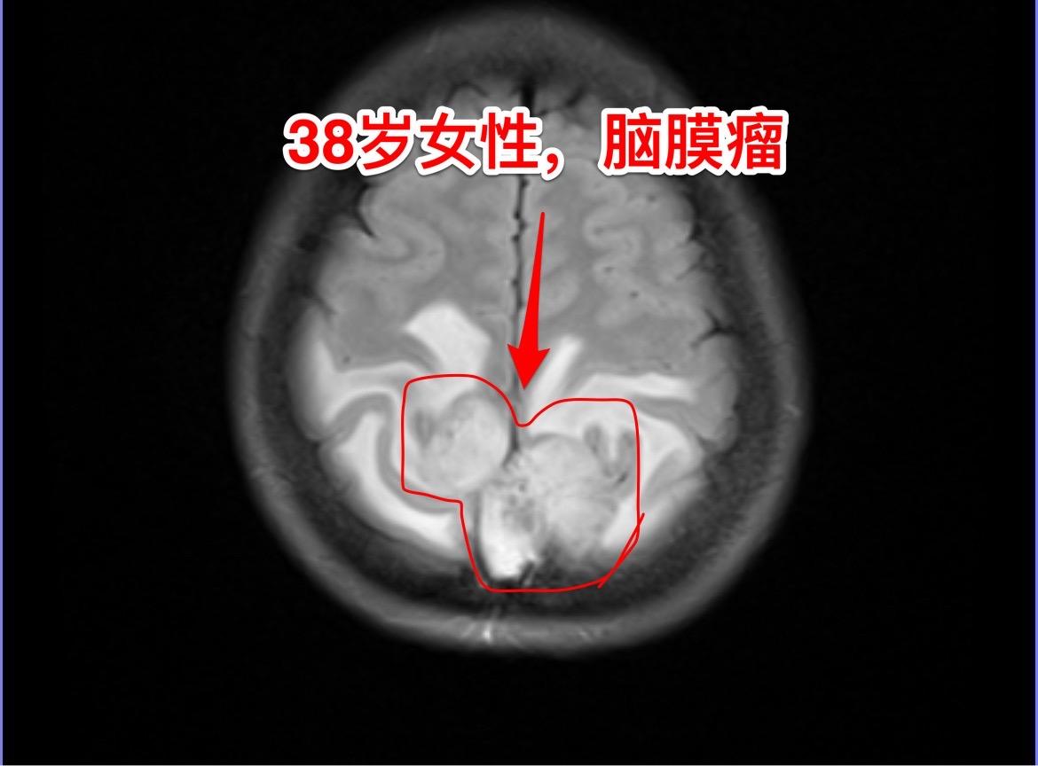 这个38岁湖北女性,因为头痛发现脑膜瘤。磁共振显示脑膜瘤周围有大范围的脑水肿,手术过程中发现肿瘤侵蚀了颅骨,将颅骨吃透了。直观的感受是:这个脑膜瘤是不是呈恶性趋势?