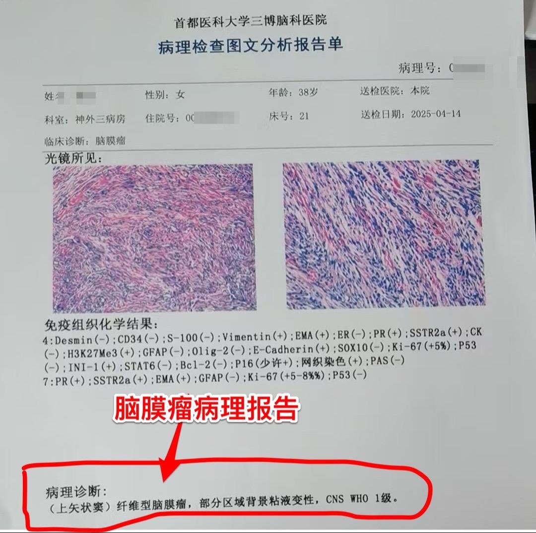 病理报告这个脑膜瘤是WHO1级,是良性肿瘤。只是Ki67指标稍高,以后需要定期复查。