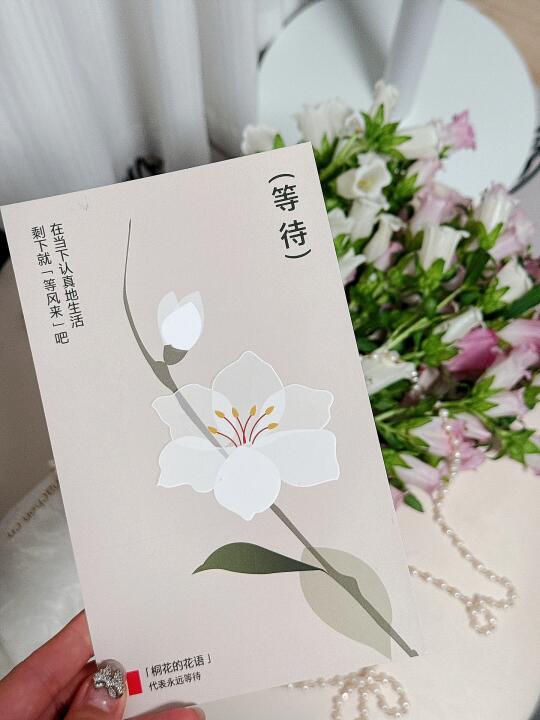 很喜欢这款风扇的设计理念,根据二十四番花信风,设计了二十四种花语卡片,每台风扇都随机配一张花信风卡片,每一张都用细腻的手绘和文案,给我们送上美好的祝福。我收到的是桐花,等待⌛️在当下认真生活,剩下的就等风来🌬️!