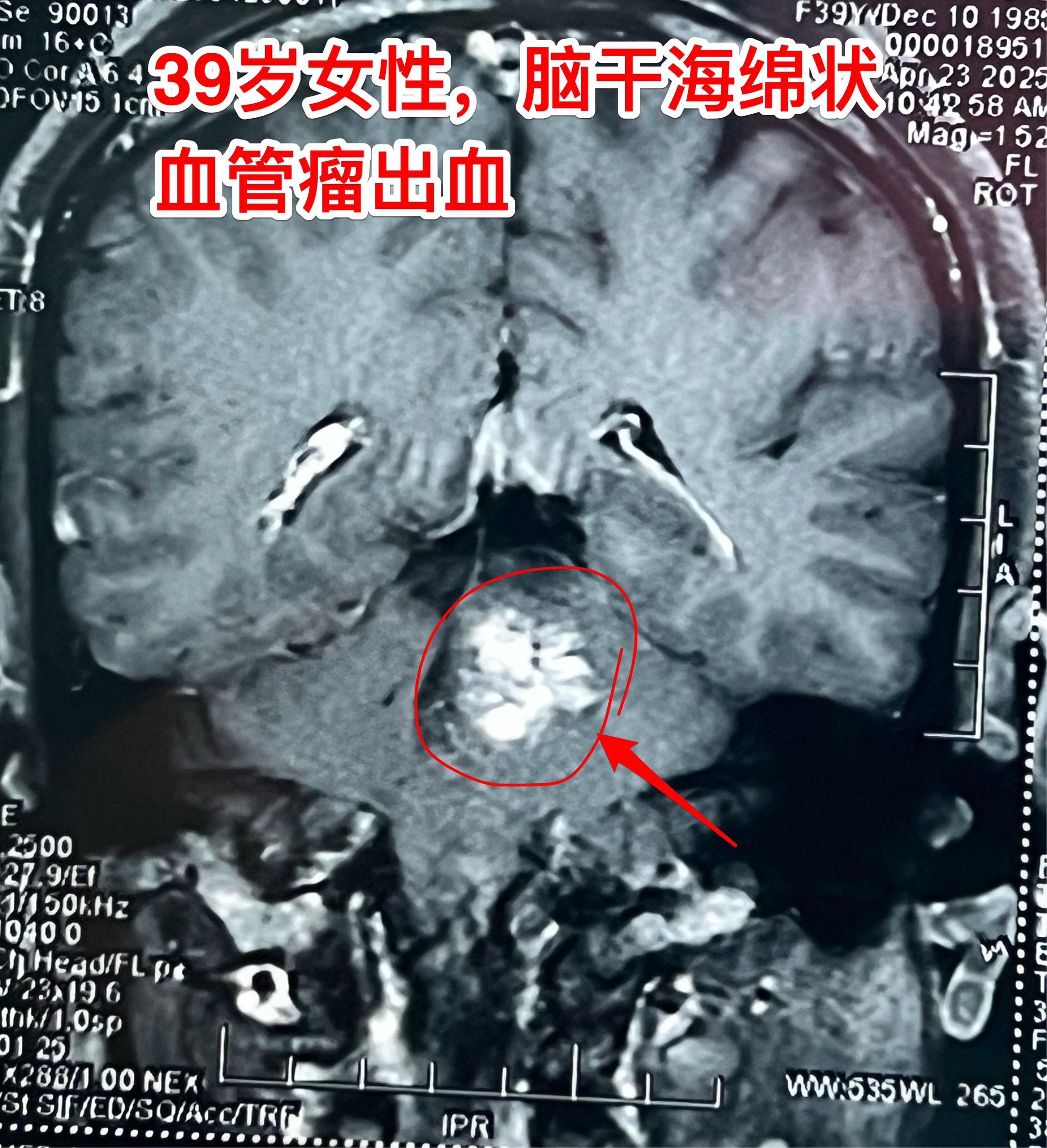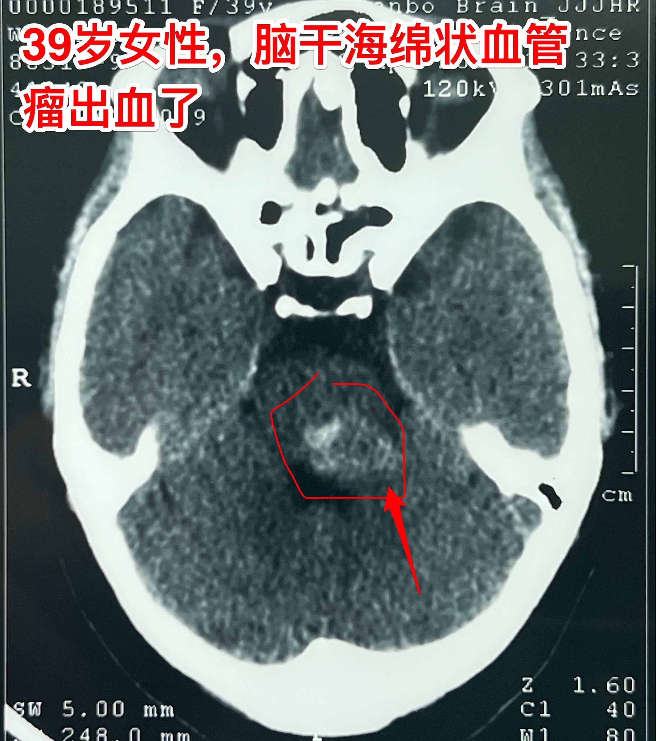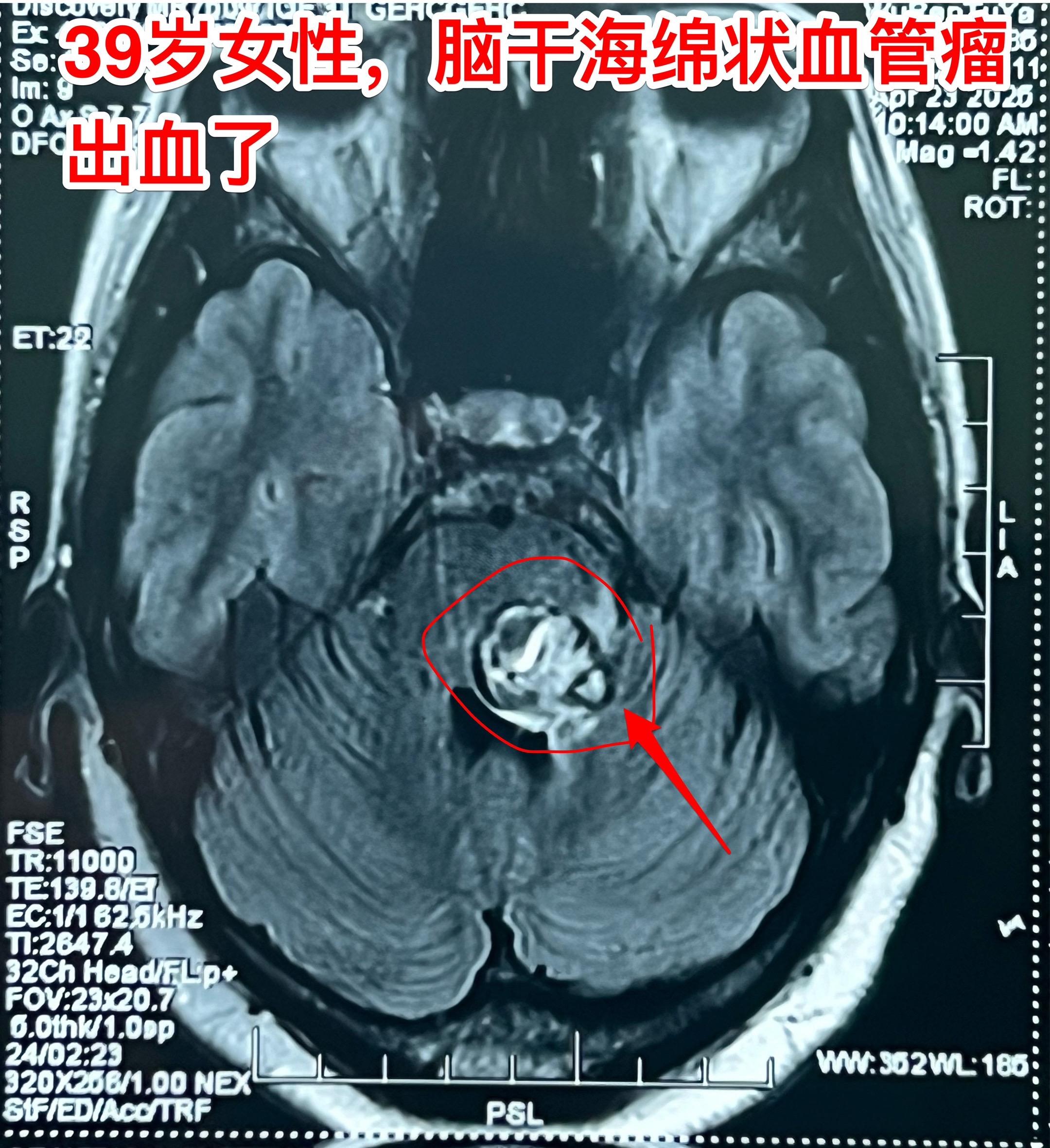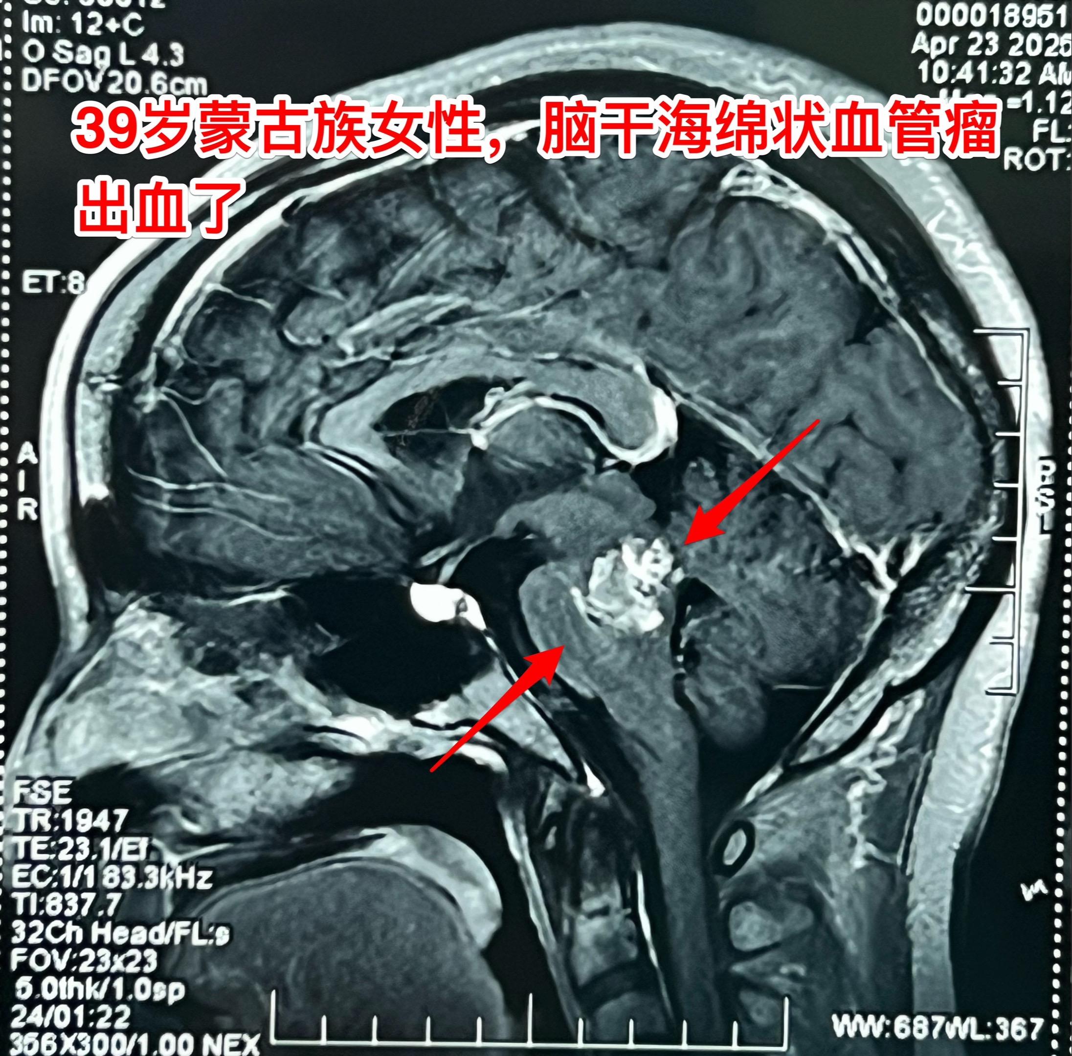 脑干海绵状血管瘤两次出血了—应该切除掉。39岁的蒙古族女性生活在内蒙古赤峰市的农业区,不过是真正的蒙古人。