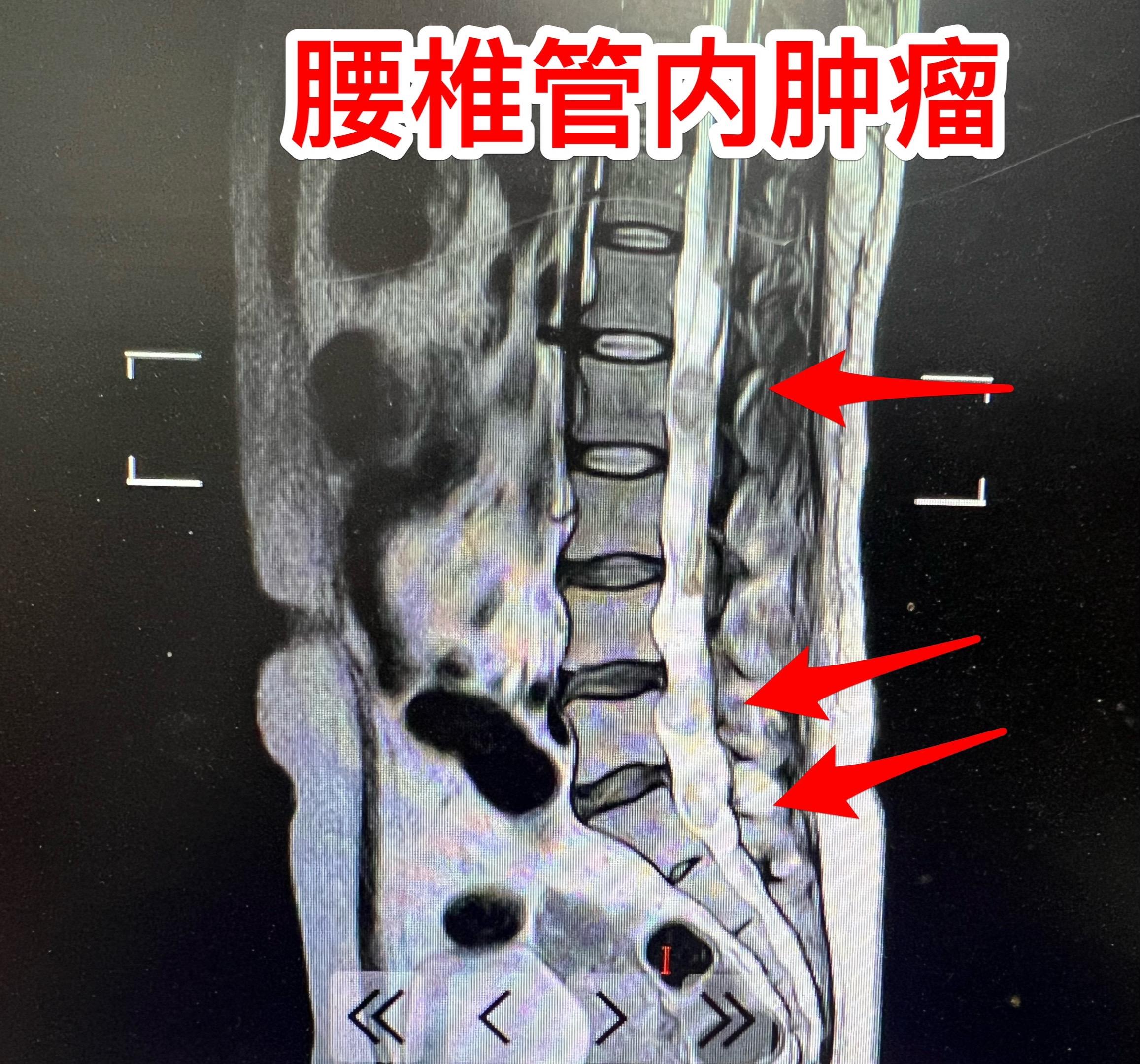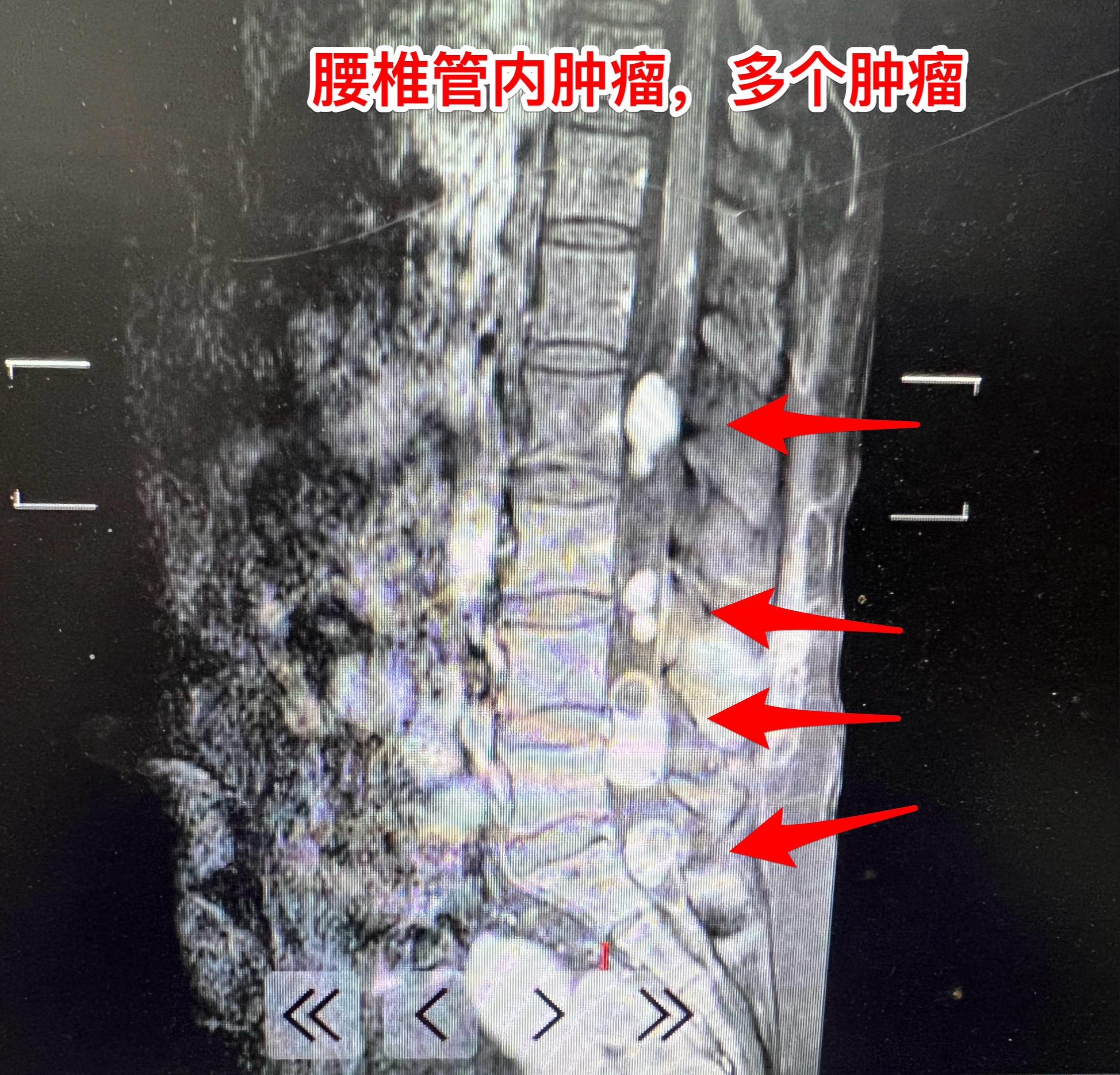 随后我们为她作了脊髓磁共振,发行了腰椎管内有四个明显的肿瘤,见图4、5。