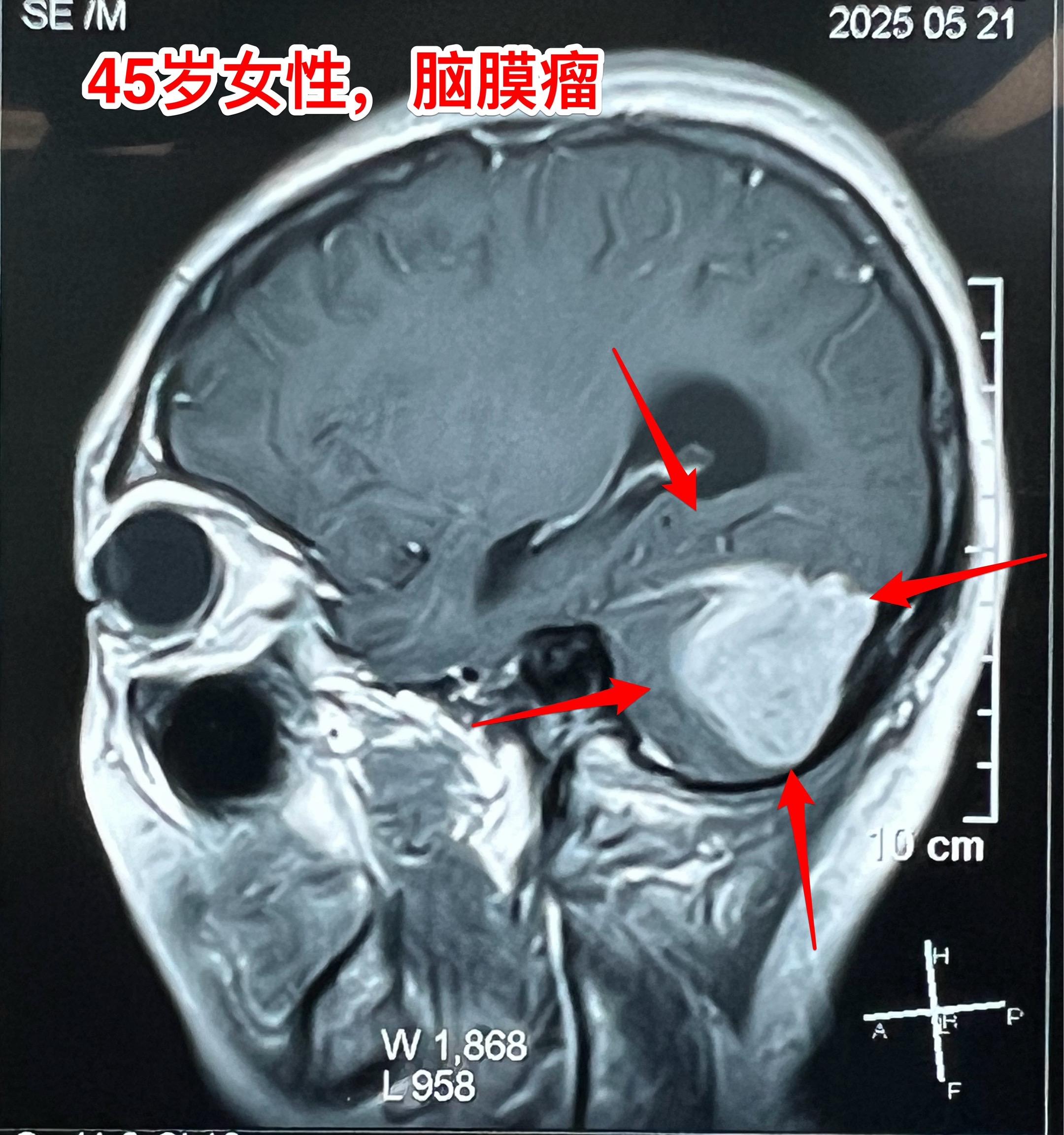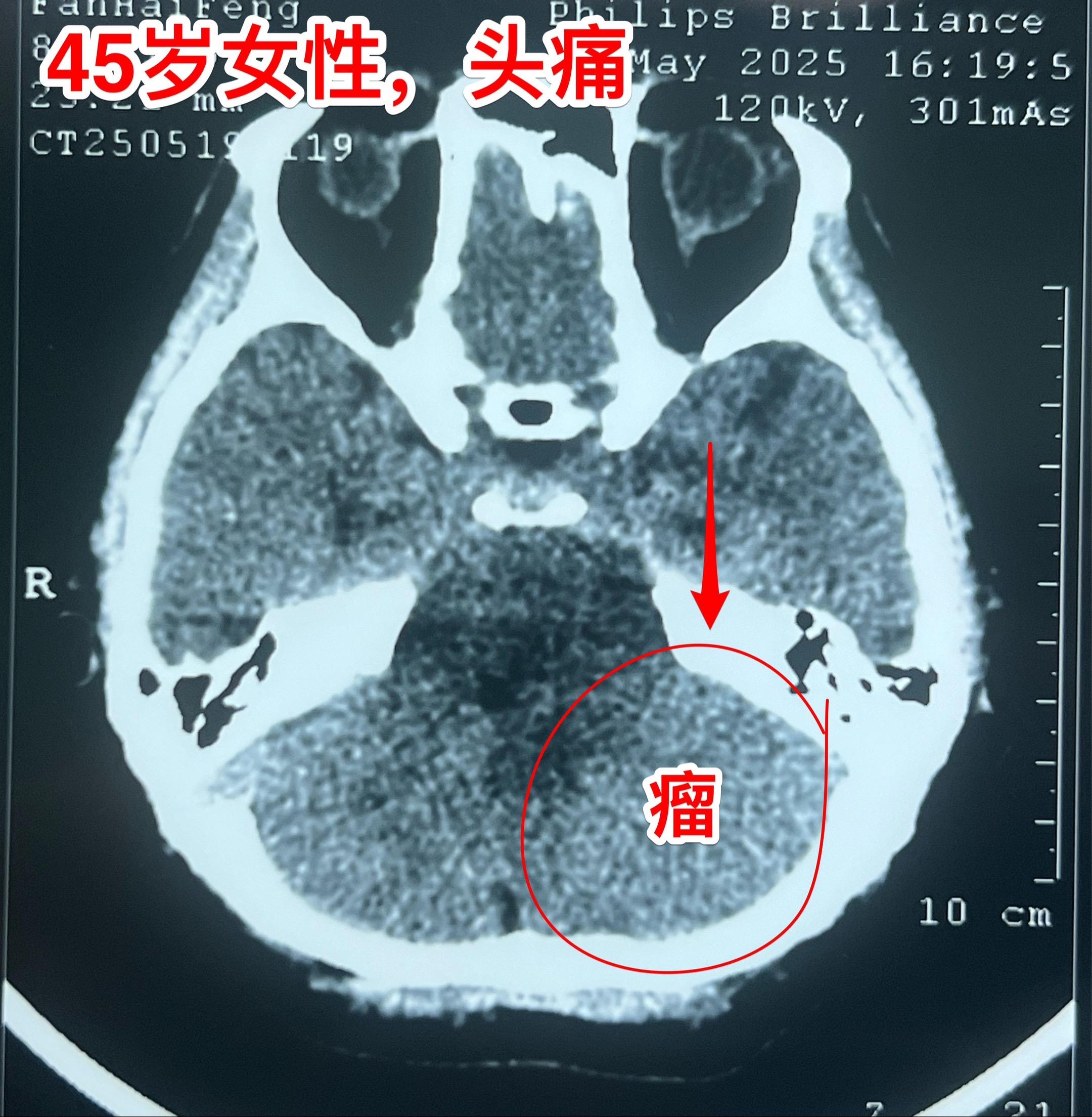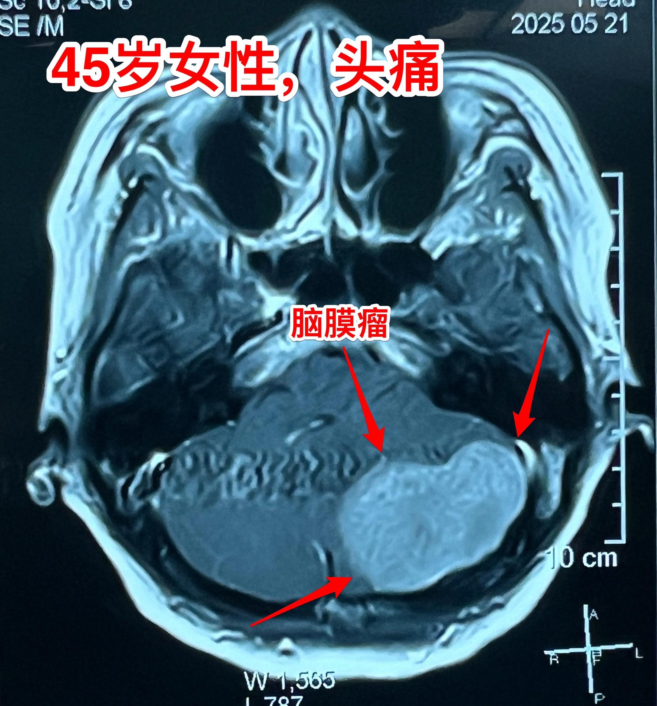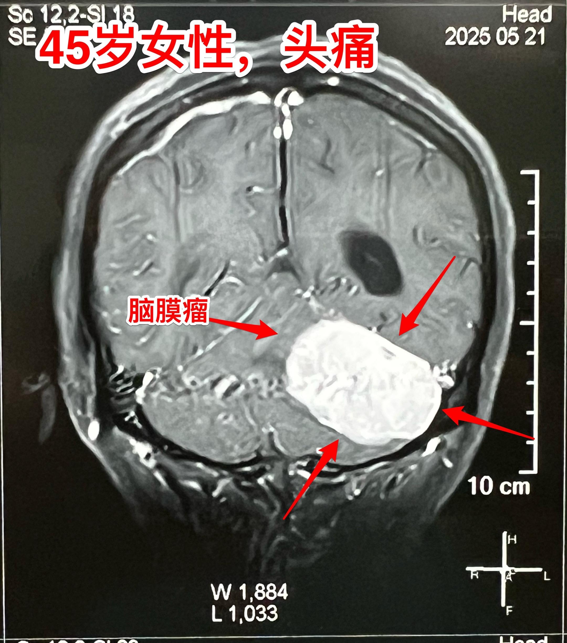 45岁女性因头痛发现脑膜瘤。45岁呼伦贝尔女性,在北京工作。头痛症状不剧烈,无呕吐。到医院就医,作头部CT检查发现可疑问题,再作磁共振检查发现左侧小脑表面有个巨大的脑膜瘤,伴有脑积水。
