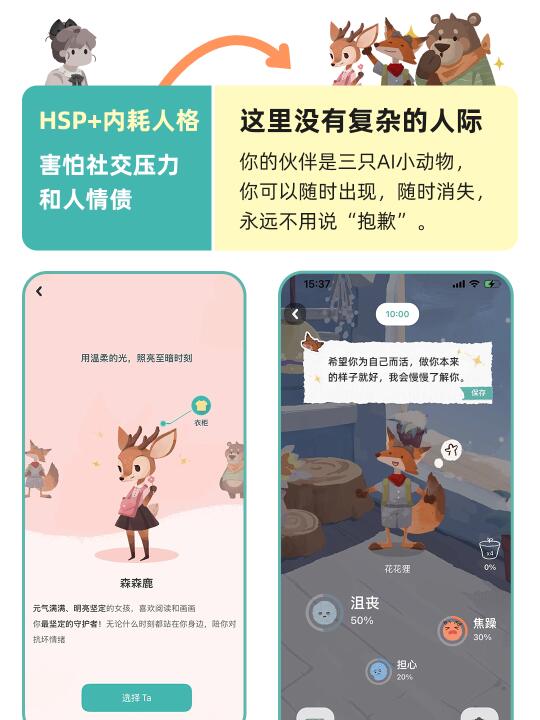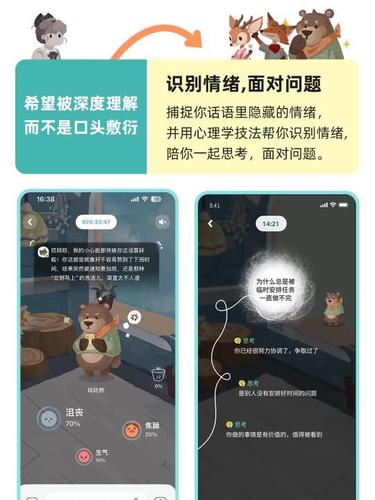 AI小动物的回应,不是“加油哦”这种空话。它们能捕捉你话语里隐藏的情绪,并用心理学技法帮你识别情绪。它不是在安慰你,它是在陪你一起思考,面对问题。