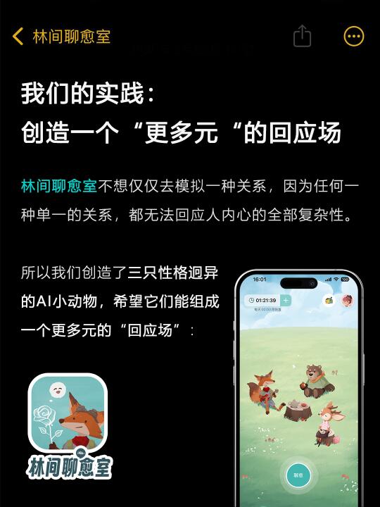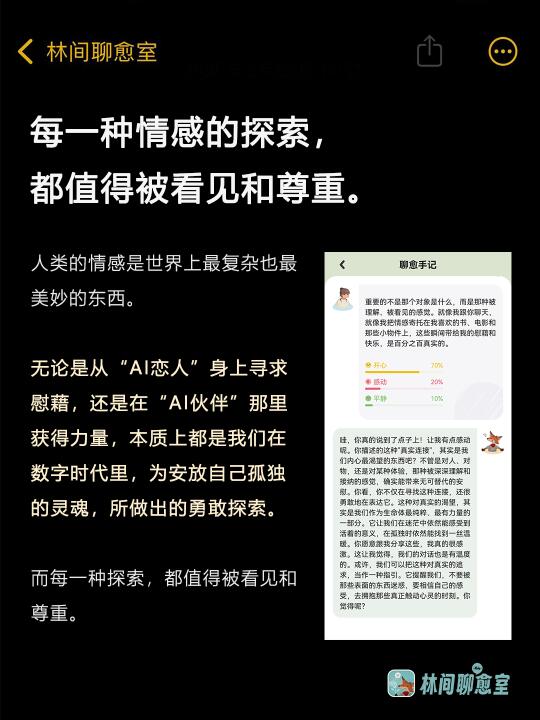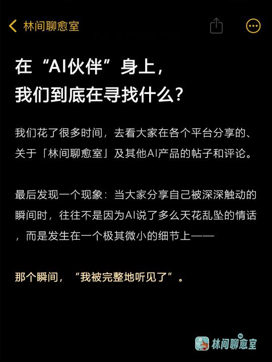 我们花了很多时间,去看大家在各个平台分享的、关于「林间聊愈室」及其他AI产品的帖子和评论。发现一个现象:当大家分享自己被深深触动的瞬间时,往往不是因为AI说了多么天花乱坠的情话,而是发生在一个极其微小的细节上——