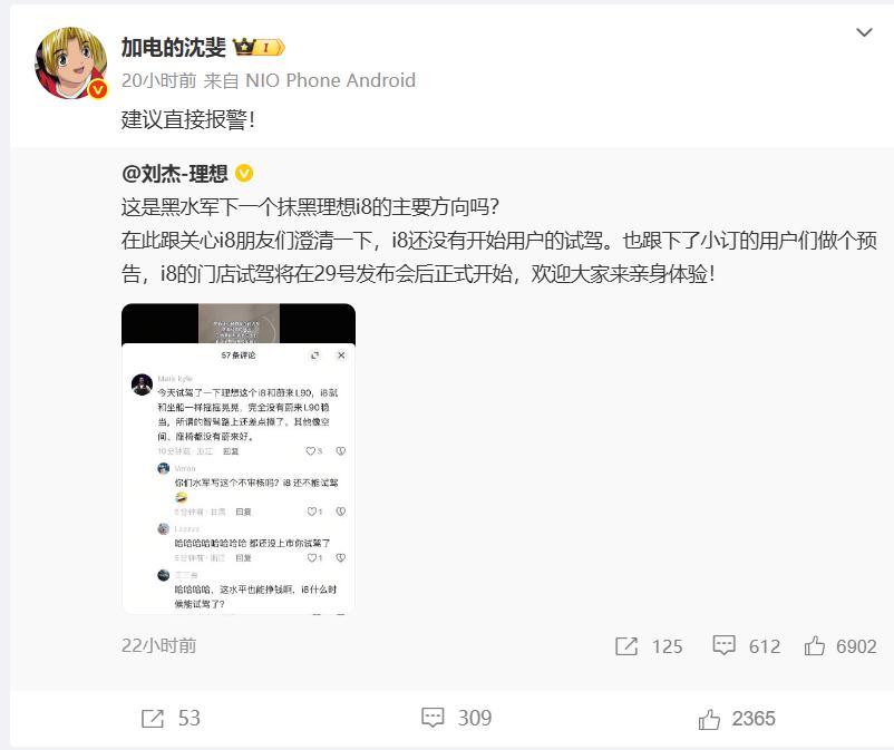 7月24日,理想汽车副总裁刘杰在个人微博发布一张评论截图。截图内容显示,有网友声称“今天试驾了一下理想这个i8和蔚来L90”,并批评i8“和坐船一样摇摇晃晃”,智能驾驶“差点撞了”,空间座椅“都没有蔚来好”。 刘杰对此提出强烈质疑:“这是黑水军下一个抹黑理想i8的主要方向吗?”他明确澄清关键事实:i8还没有开始用户的试驾。 “i8的门店试驾将在29号发布会后正式开始”,刘杰向已支付小订的用户预告,邀请大家届时亲身体验。对此,蔚来高级副总裁兼乐道汽车总裁沈斐回应:“建议直接报警!”
