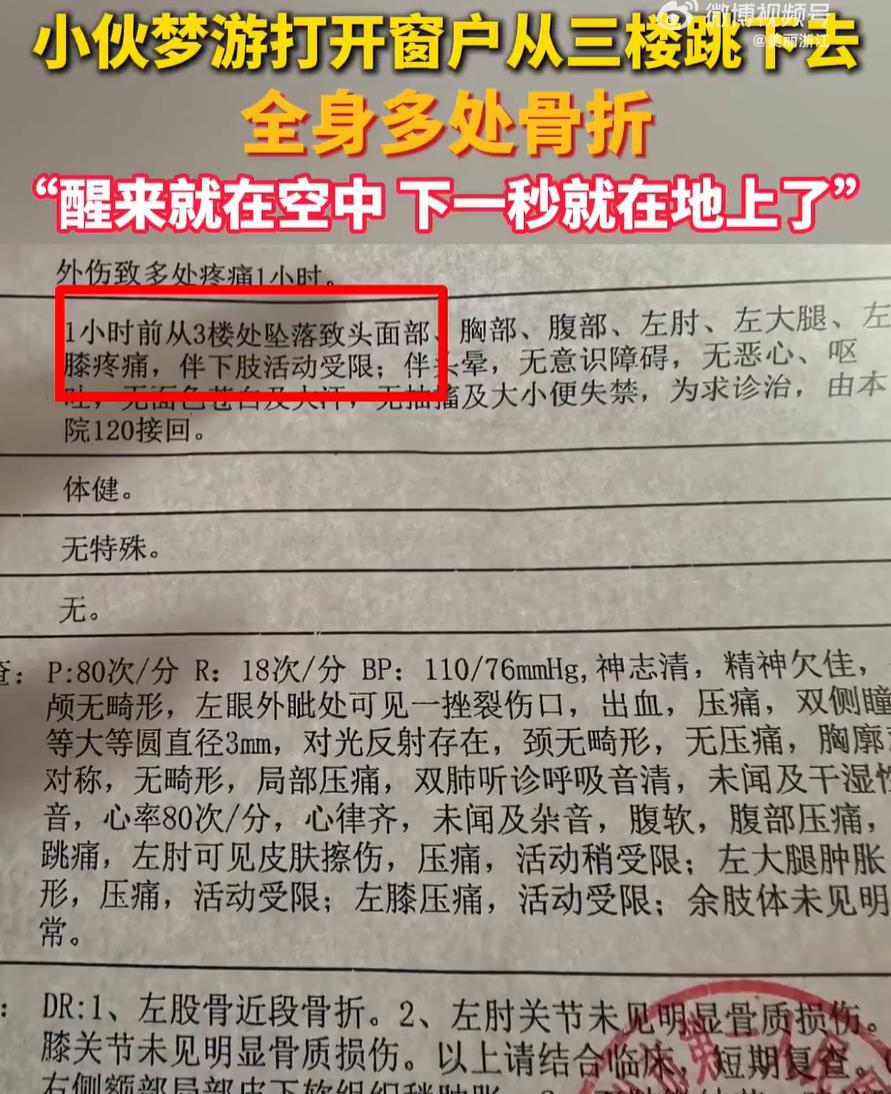 太可怕了!河南郑州,20岁男子下班后回到家睡觉,突然梦到有人在追自己,然后就跳楼了,男子瞬间惊醒,却发现自己真的在空中,原来他梦游从3楼跳了下去,自己也因此全身多处骨折,好在没有生命危险 男子曹先生介绍,当天加班了很久,大概一天上了十三四个小时的班,到家后已经疲惫不堪,直接睡着了,睡梦中隐隐约约觉得有人在追自己,自己就拉开窗户跳了,等自己醒了,就发现已经在空中 男子住的是三楼,好在家人反应及时,连忙将他送医,住了9天的院,花费了40000多,但接下来还需要休养半年至一年 曹先生说,自己小的时候确实有梦游的情况,但基本8岁以后就没再出现过,也不知道自己这次为啥会这样 对此,有网友表示:以后要给自己买个笼子了,每天睡觉的时候把自己锁起来就行了 虽然这话有些调侃成分,但确实要重视起来,梦游这种事,很多人觉得只是睡着乱走走,但医学上它是一种睡眠障碍,和神经系统的异常反应、压力过大、睡眠不足等都有关系 大多数梦游是轻度的,比如坐起来、走几步,但一旦涉及高处、利器,就很容易造成严重后果。更要命的是,梦游状态下的人往往没有痛觉意识,也不记得自己做过的事 像这种情况,家里如果有人有梦游史,真的不能掉以轻心,尤其是住高层或者窗台、阳台没护栏的房子,可以在睡觉前做一些安全措施,比如锁窗、关阳台门,甚至在卧室门口加阻挡物,这都是有必要的