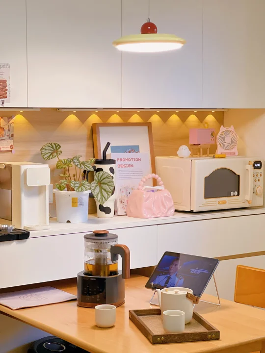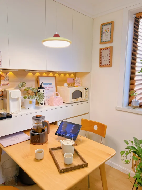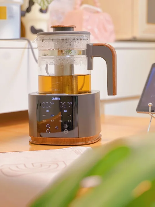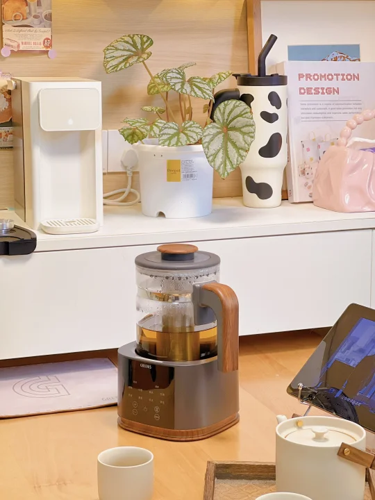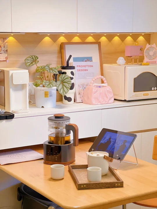 餐边柜才是我家藏不住的生活感啊~ 当初装修给小户型装了整面墙餐边柜 现在每天都在偷着乐!太实用了 小厨房塞不下的饮水机、咖啡机 往台面上一放,顺手就能用~ 最近冲着纯钛材质入手了一款煮茶壶 胡桃木色的手柄和盖子真的好有质感 摆在桌上颜值好高,不占地方 一共有8个煮茶模式 可以满足我们一家的日常需求 纯钛底盘➕纯钛滤网,更有益健康 1.3L大容量煮一次可以喝半天了