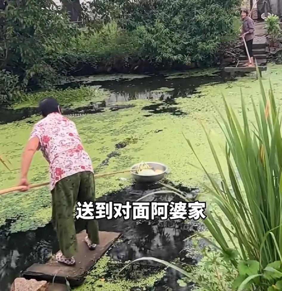 老妪隔岸推盆乐,皆得其乐四十载!71岁老人与隔岸的邻居老太隔着一条小河,相互投喂四十年。 她家的桃树结满了桃子,便摘下一些放进盆里,用一根长长地竹竿将装满桃子的盆推过彼岸,彼岸有相伴四十年的邻居老太。 邻居老太家豇豆、菜瓜结得多吃不完,便也装了大半盆,用一根长长的竹竿小心翼翼地推向对岸,生怕偏离了方向,对岸的老姐姐收不到自己的菜。 网友不解:“自是儿女陪伴在侧,百善孝为先,何不修建木桥,让老姊妹挽着胳膊谈笑?” 网友笑评:“老姊妹之乐,便是这两竿一盆水上推,若修建木桥,岂不扫兴?” 哈哈,还真是“子非鱼,焉知鱼之乐”。 两根竹竿,一个铁盆,四十余载。所传递得不止是一盆菜瓜、一盆毛桃,是邻里的和睦与友爱,更是她们半生的情谊啊!#一辈子# #我的宝藏邻居# #老姐妹的故事#