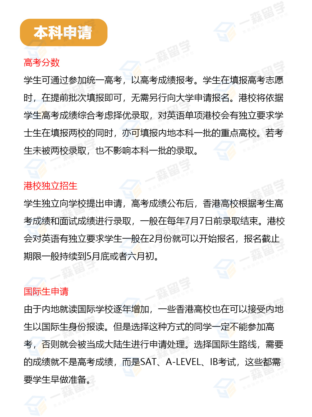 本科申请要求 高考分数 学生可通过参加统一高考,以高考成绩报考。学生在填报高考志愿时,在提前批次填报即可,无需另行向大学申请报名。港校将依据学生高考成绩综合考虑择优录取,对英语单项港校会有独立要求学士生在填报两校的同时,亦可填报内地本科一批的重点高校。若考生未被两校录取,也不影响本科一批的录取 港校独立招生 学生独立向学校提出申请,高考成绩公布后,香港高校根据考生高考成绩和面试成绩进行录取,一般在每年7月7日前录取结束。港校会对英语有独立要求学生一般在2月份就可以开始报名,报名截止期限一般持续到5月底或者六月初 国际生申请 由于内地就读国际学校逐年增加,一些香港高校也在可以接受内地生以国际生身份报读。但是选择这种方式的同学一定不能参加高考,否则就会被当成大陆生进行申请处理。选择国际生路线,需要的成绩就不是高考成绩,而是SAT、A-LEVEL、IB考试,这些都需要学生早做准备 研究生申请要求 学历要求 申请硕士学位或研究生文凭课程的申请人,应获得正规全日制4年本科的学士学位。 英语要求: 托福IBT:80或雅思总分6.0以上 申请材料 除了英语成绩,和GPA,还要一份Proposal,2份推荐信。主要还是得和导师取得联系,如果他同意要你,他会帮助你申请,比你自己直接申请成功率高的多