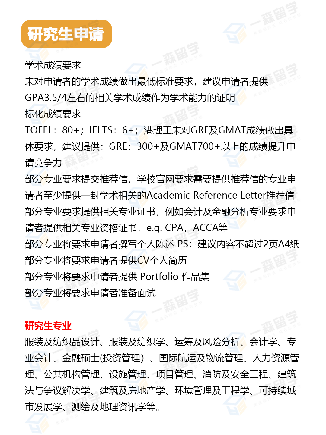 本科申请要求 高考考生 申请人必须在应届高考获得优异的成绩,当中包括良好的英语成绩。 申请人如在认可学科竞赛中获省级一等奖或以上的成绩,可获得优先面试选拔资格。通过面试的申请人可享有本科入学政策的优惠待遇。 国际课程考生 语言要求:雅思6/托福80 英国高中:ABB 美国高中:SAT 1190 / AC 24/ AP:33 加拿大高中:For Ontario:High School Diploma with an average of 70% in six Grade 12 U or M courses For Quebec: Diplôme d’Etudes Collègiales (DEC) with an average of 70 marks For other provinces: High School Diploma with an average of 70% in five Grade 12 subjects 研究生申请要求 1、学术成绩要求:未对申请者的学术成绩做出最低标准要求,建议申请者提供GPA3.5/4左右的相关学术成绩作为学术能力的证明。 2、标化成绩要求:TOFEL:80+;IELTS:6+;港理工未对GRE及GMAT成绩做出具体要求,建议提供:GRE:300+及GMAT:700+以上的成绩提升申请竞争力。 3、部分专业要求提交推荐信,学校官网要求需要提供推荐信的专业申请者至少提供一封学术相关的Academic Reference Letter推荐信; 4、部分专业要求提供相关专业证书,例如会计及金融分析专业要求申请者提供相关专业资格证书,e.g. CPA,ACCA等。 5、部分专业将要求申请者撰写个人陈述 PS:建议内容不超过2页A4纸。 6、部分专业将要求申请者提供CV个人简历; 7.、部分专业将要求申请者提供 Portfolio 作品集; 8.、部分专业将要求申请者准备面试。