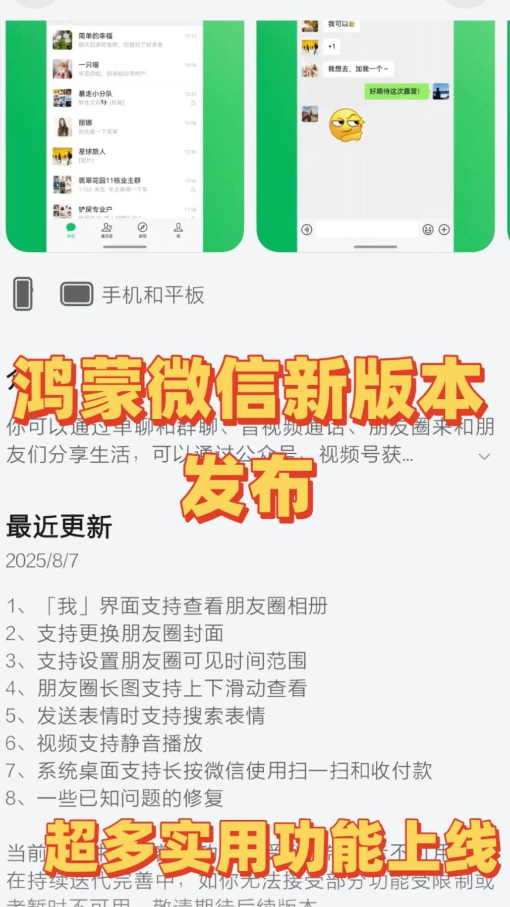 微信新特性:我界面直接看朋友圈相册,换封面、设可见时间范围超方便;长图上下滑动查看无压力,表情搜索告别手滑翻找,视频静音播放更贴心,桌面长按微信直达扫一扫和收付款,太实用!