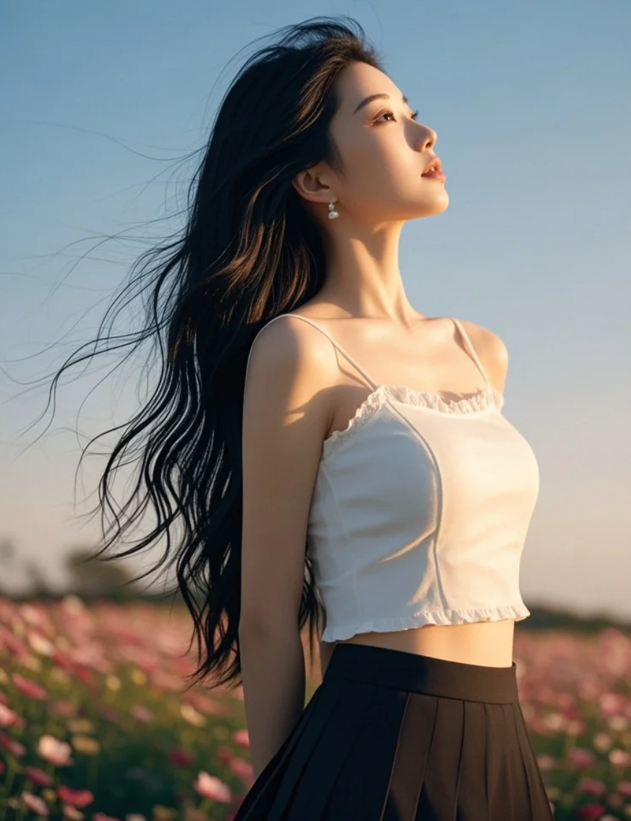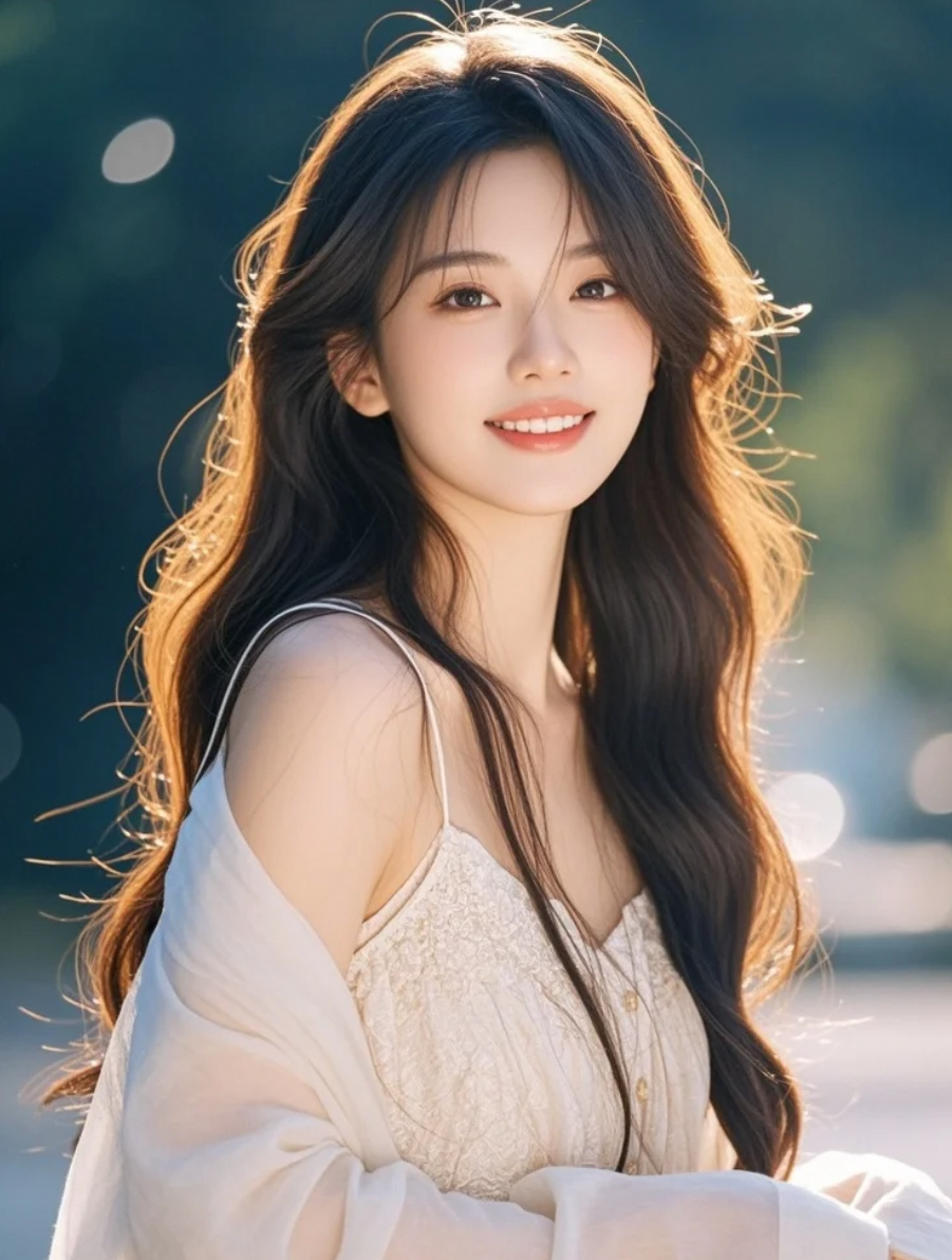 沙滩长发女孩,晚风轻抚,笑容温柔而充满神秘